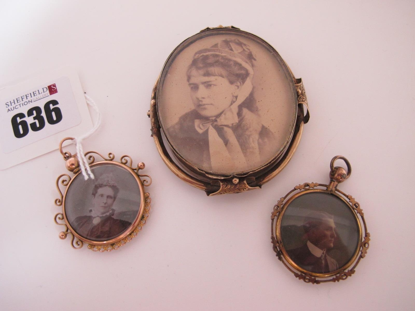A Victorian Large Oval Locket Brooch, glazed front and verso (cracked / lacking pin and hook clasp); together with two circular locket pendants (damage). (3)