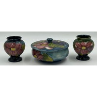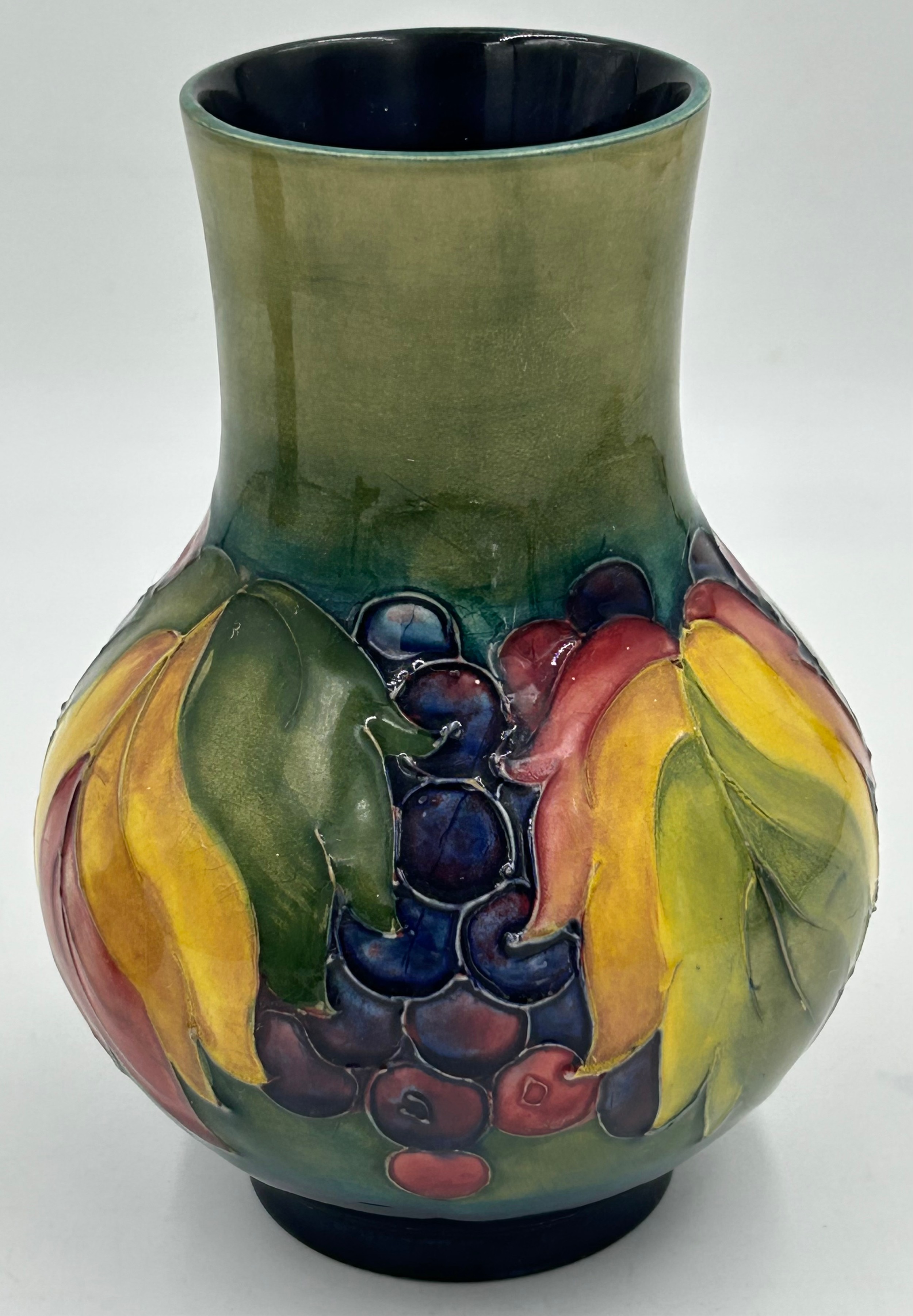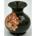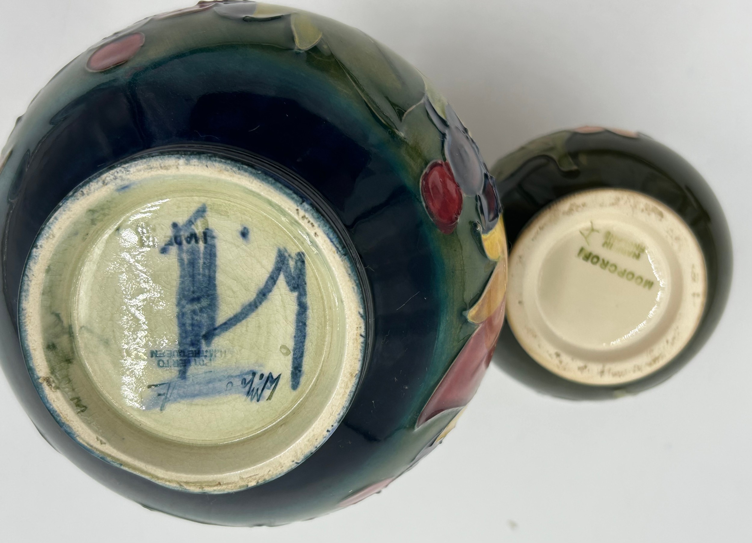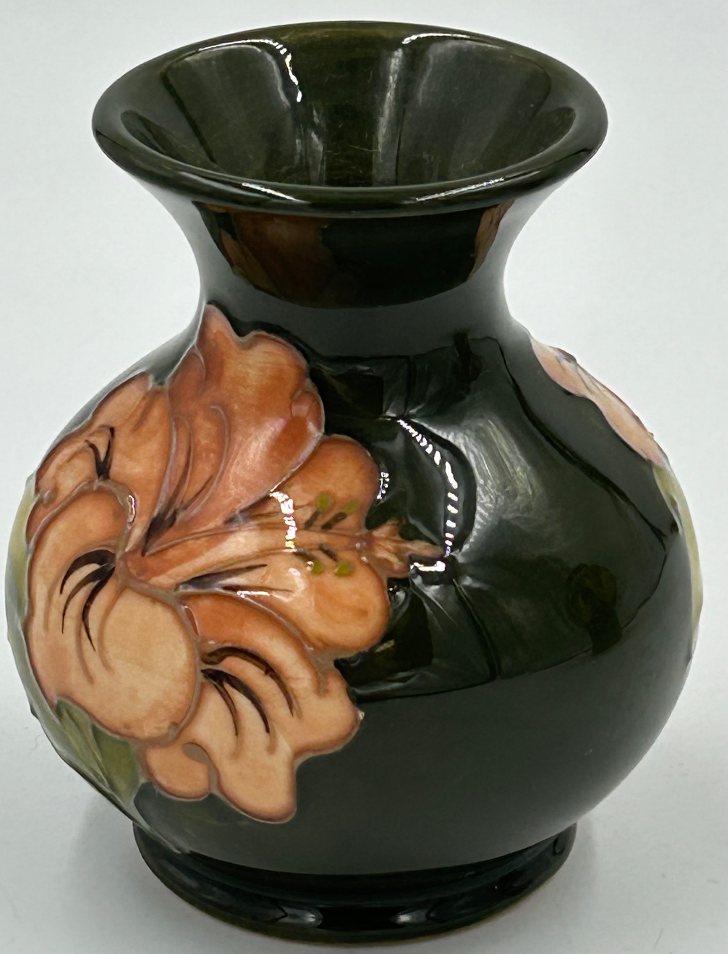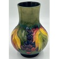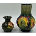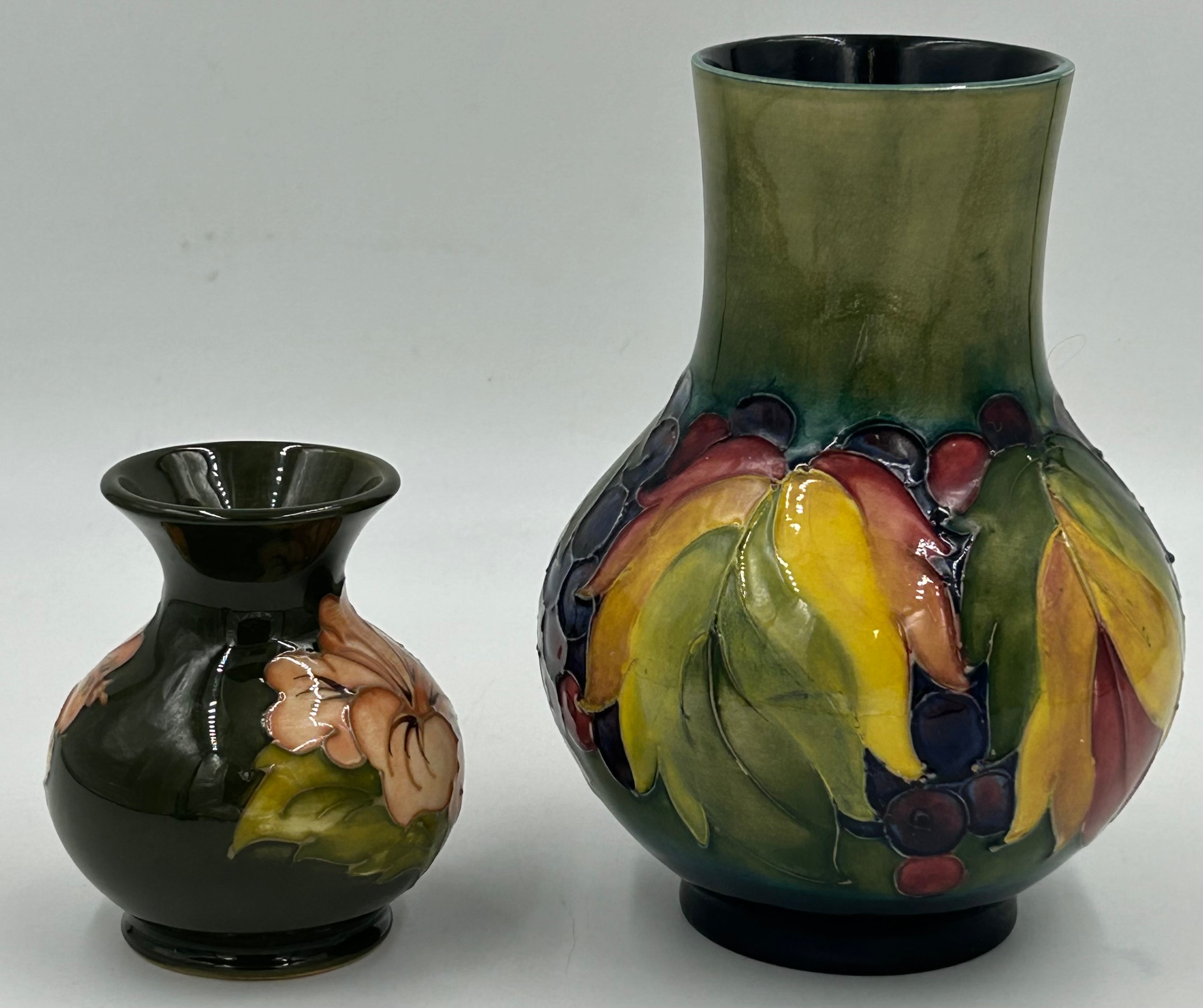 A Moorcroft bulbous vase with leaf and berry design 18cm together with squat vase with hibiscus design 9.5cm. (2).