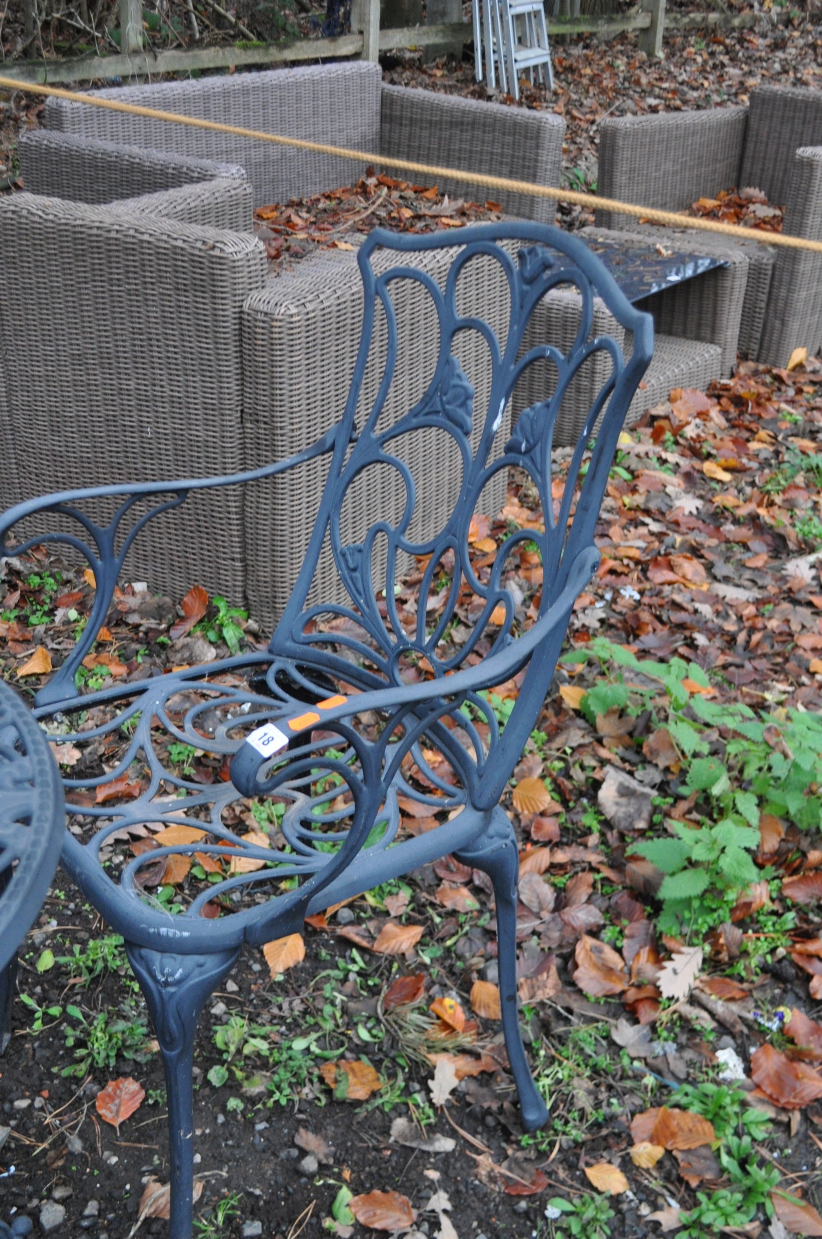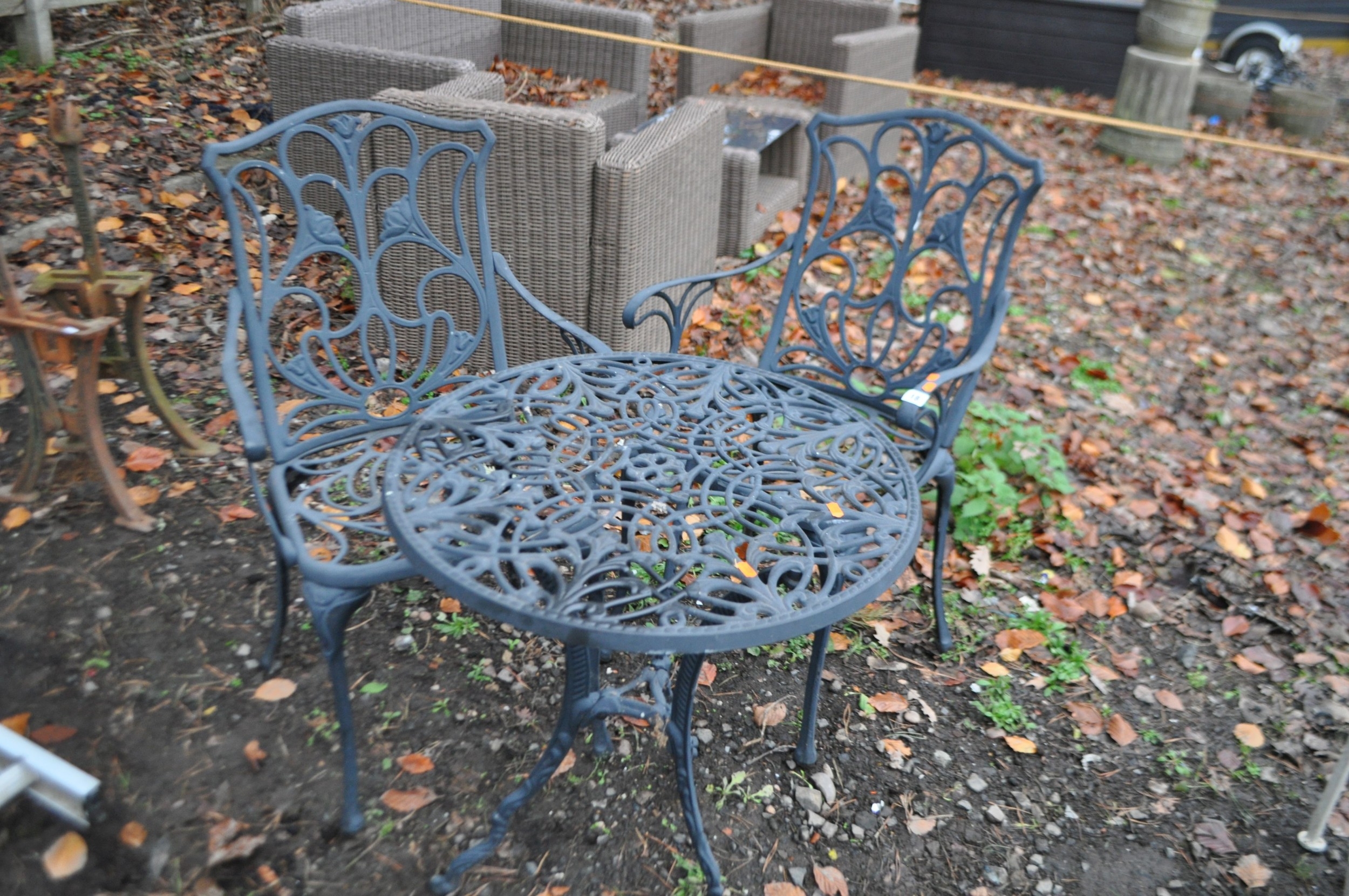A CAST ALUMINIUM GARDEN TABLE AND TWO MATCHING CHAIRS table diameter 60cm Condition Report; no obvious damage (3)