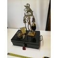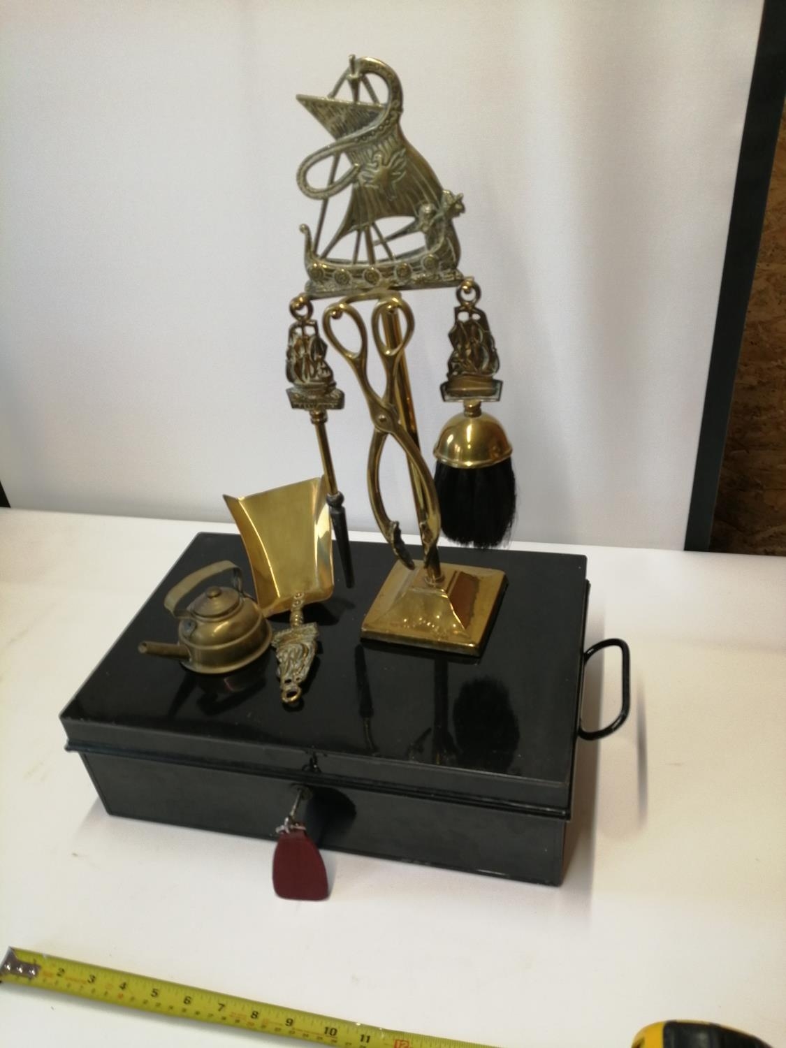 Metal deed box and brass fireside companion set