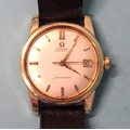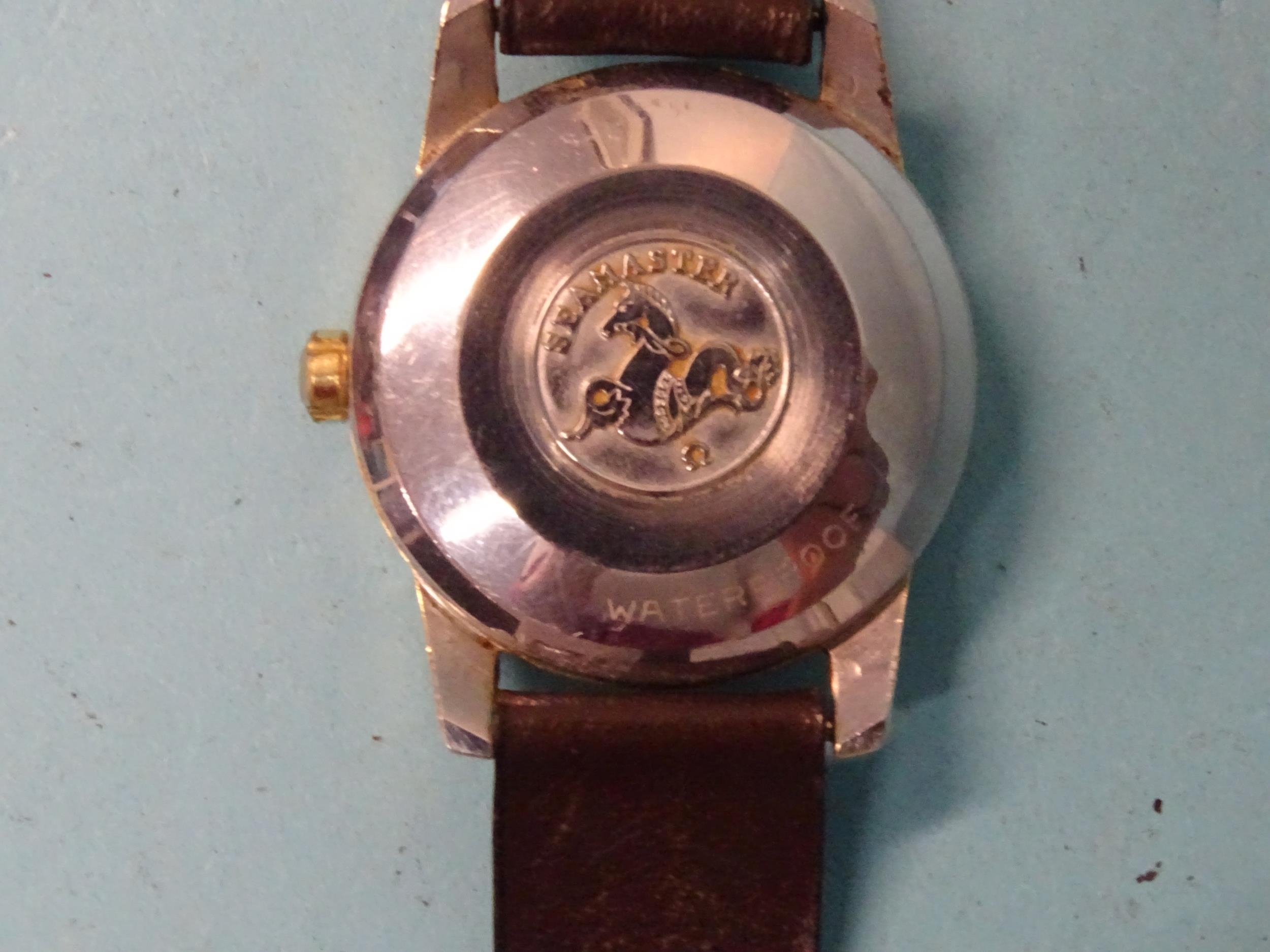 Omega, a gentleman's Omega Seamaster automatic wrist watch c1960's, the silvered dial with baton numerals and date aperture at '3', in gold-plated and steel case, 34mm, on leather strap, (not working).