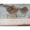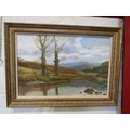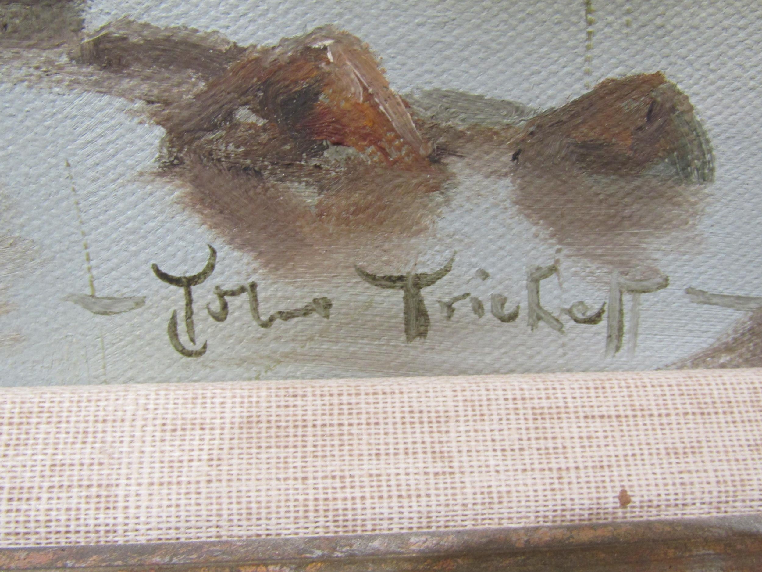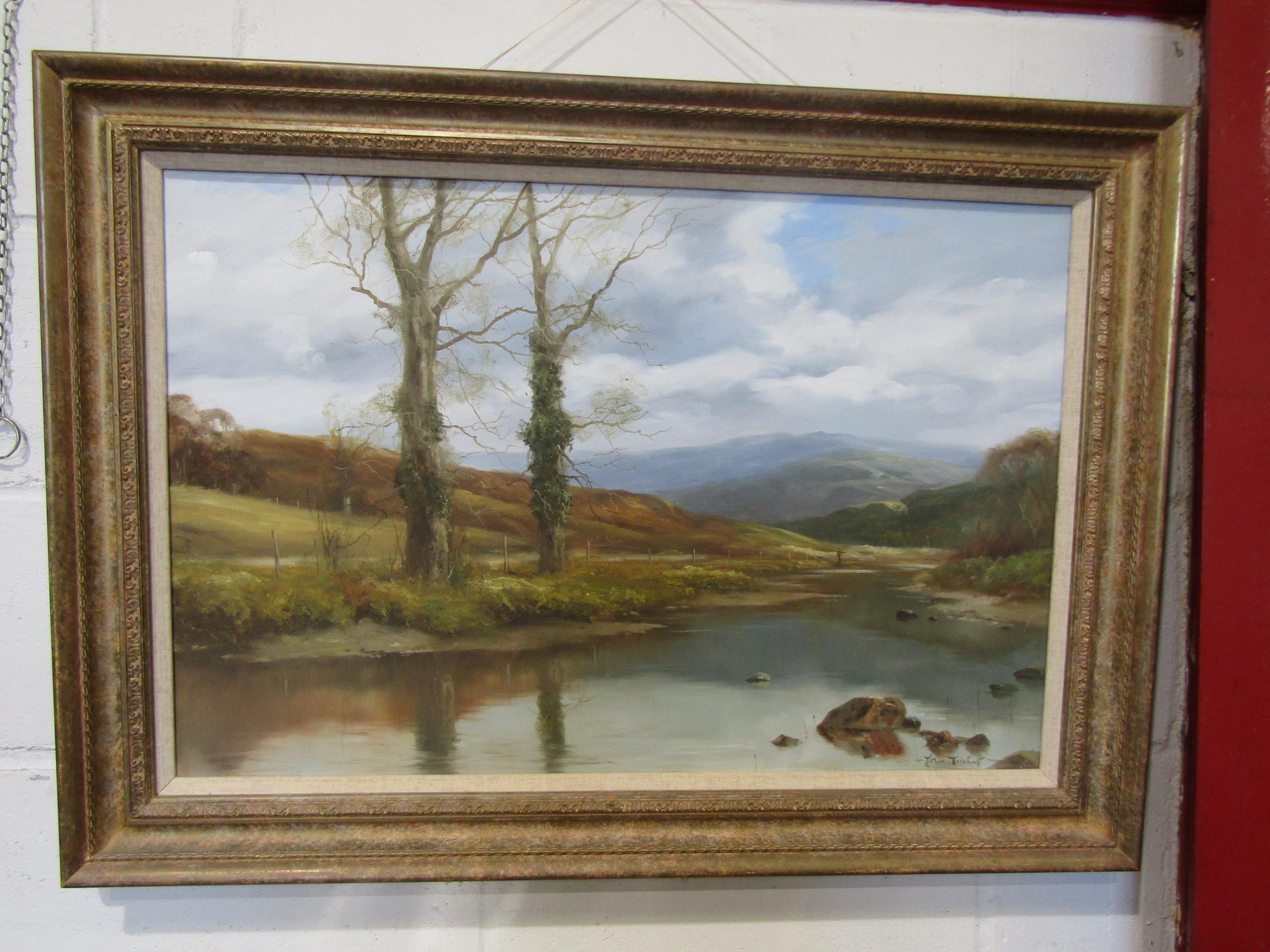 JOHN TRICKETT (b.1952): An oil on canvas of riverside scene, gent fishing with mountains to background, signed lower right, framed, 50cm x 75cm image size