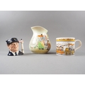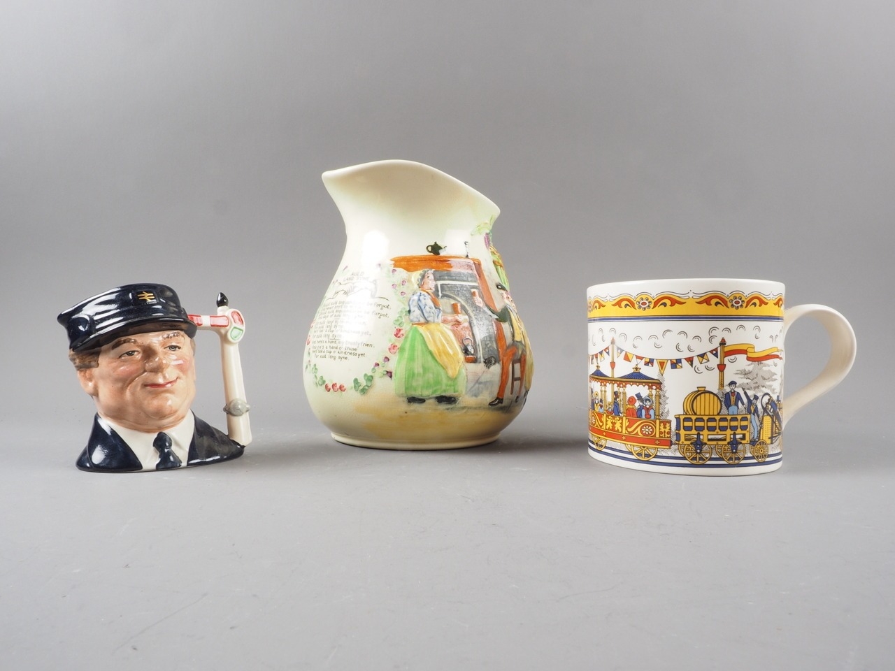 A Fielding's Crown Devon "Auld Lang Syne" musical jug, a Spode Great Railway tankard, a Royal Doulton railway engineer character jug