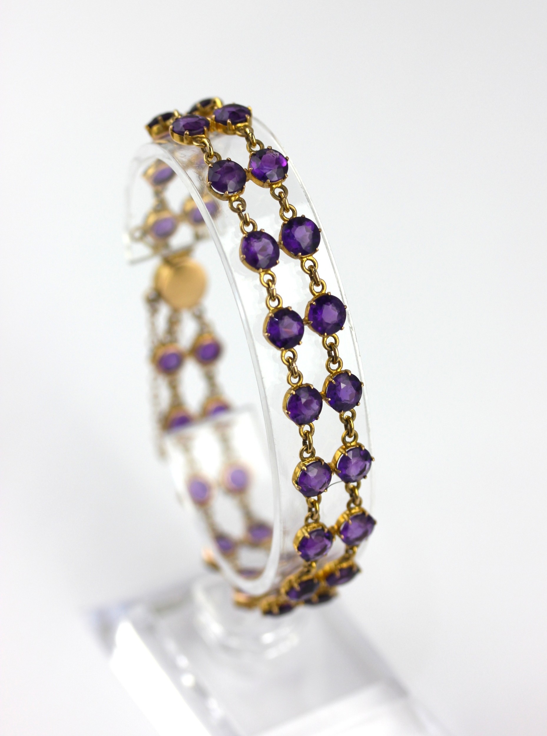 A gold and amethyst bracelet claw set with two rows of circular cut amethysts on a snap clasp detailed 9C, gross weight 11g