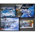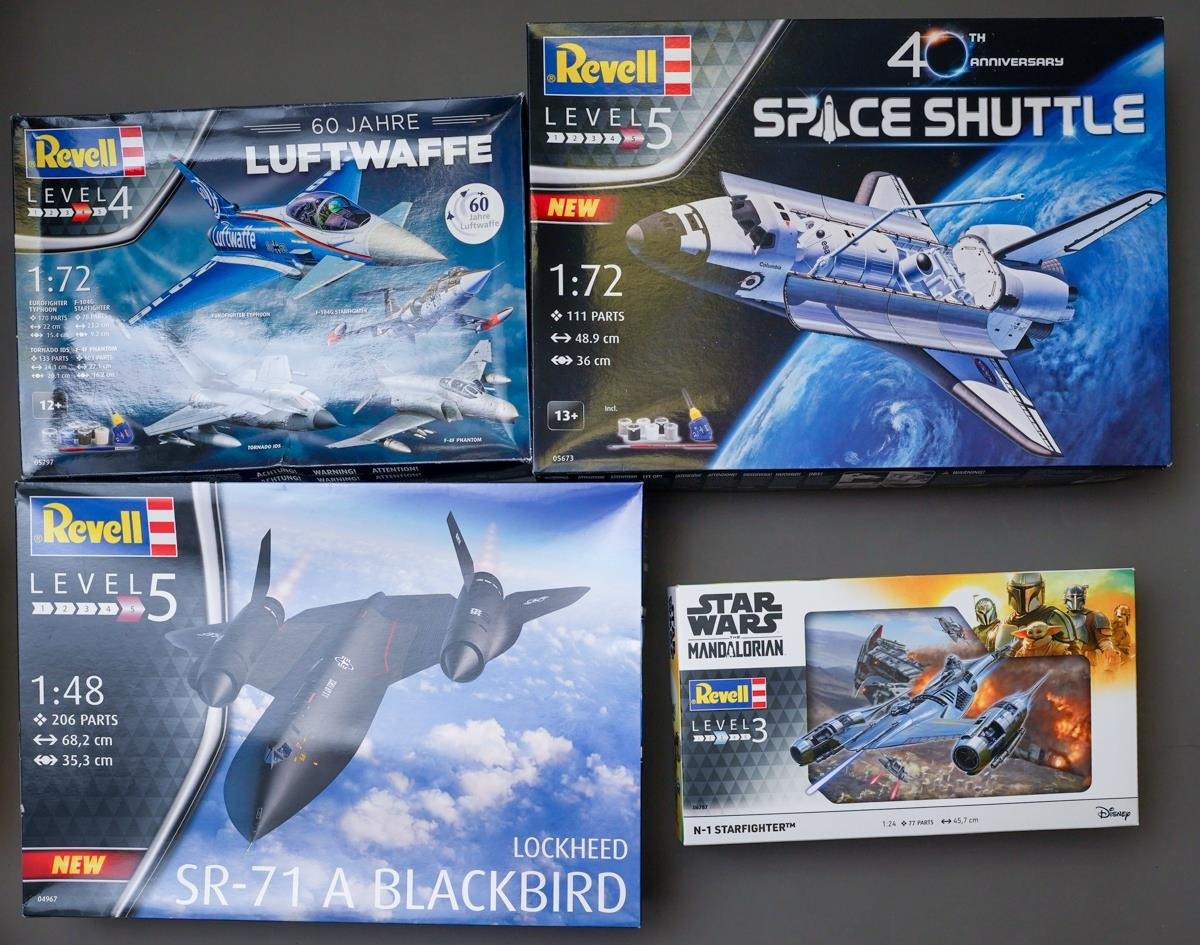 Four boxed Revell model kits to include: 1:48 SR-71 A Blackbird Lockheed #04967; 1:72 Space Shuttle 40th Anniversary #05673; 1:72 60 Jahre Luftwaffe #05797 and 1:24 Star Wars The Mandalorian N-1 Starfighter #06787 [4]
