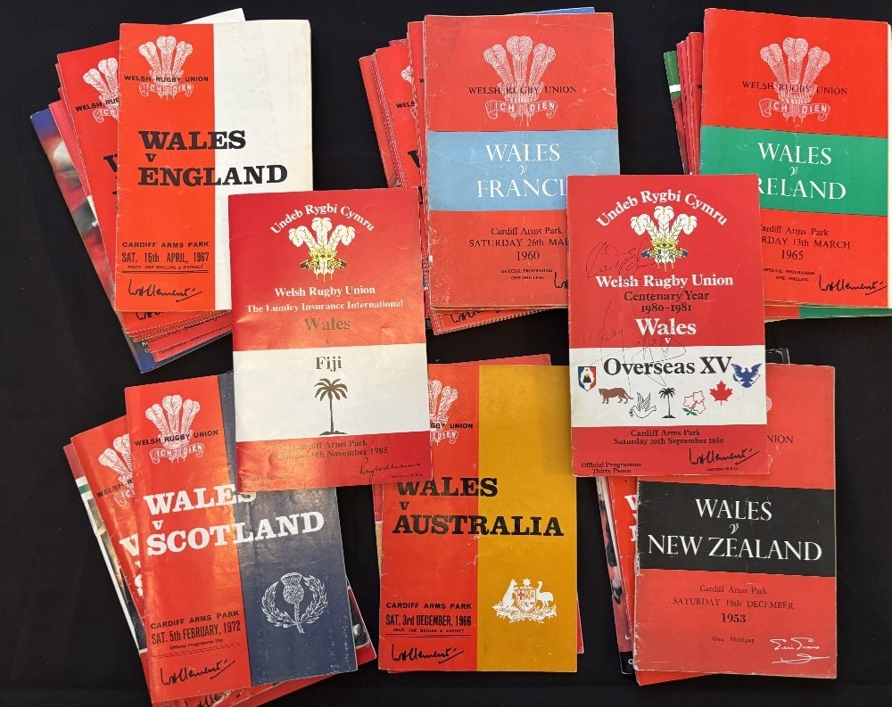 Wales Home International Rugby Programmes (44): v England 1967, 69, 71, 73, 77, 87, 89, 91 and 2001; v France 60, 64, 66, 68, 70, 72, 74, 76, 82, 86, 88 and 2004; v Ireland 65, 67, 71, 79, 81, 89 and 93; v Scotland 66 (poor), 72, 86, 88, 90 and 94; v Australia 66 and 81 (2); v NZ 53, 67, 72, 89 and 97 (Wembley); v Fiji 85; and v Pres. Overseas XV 80, autog’d by Gareth Edwards and Mervyn Davies. G/VG