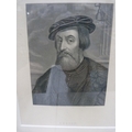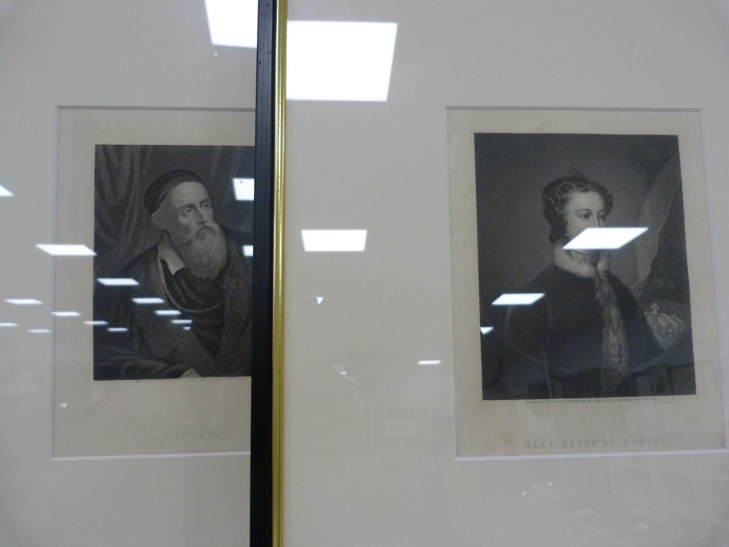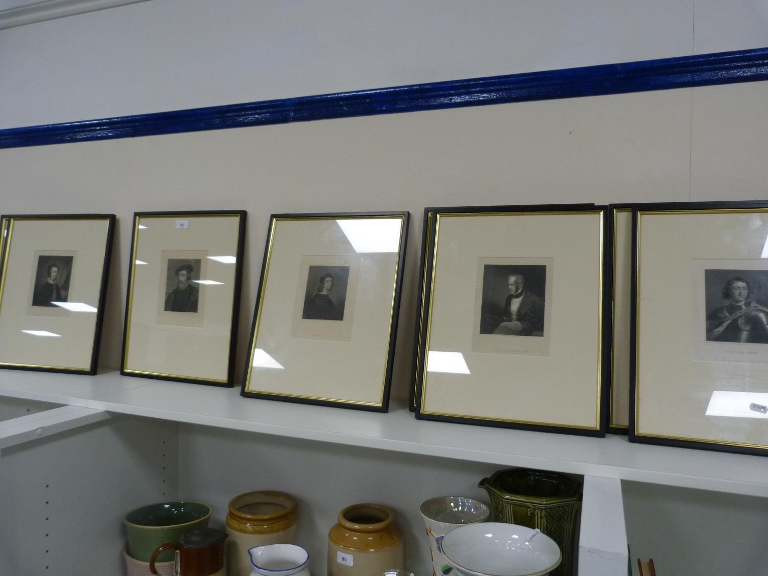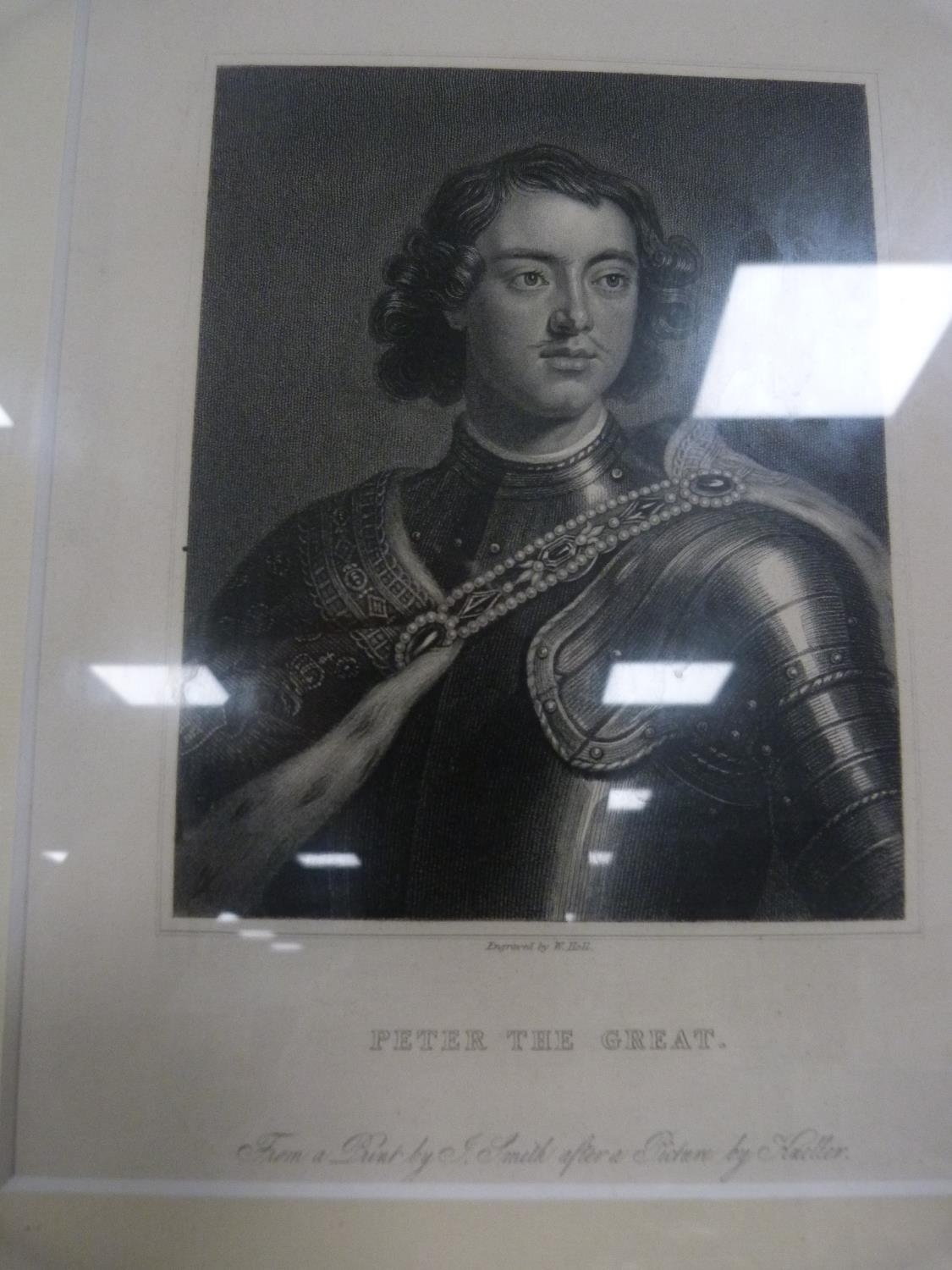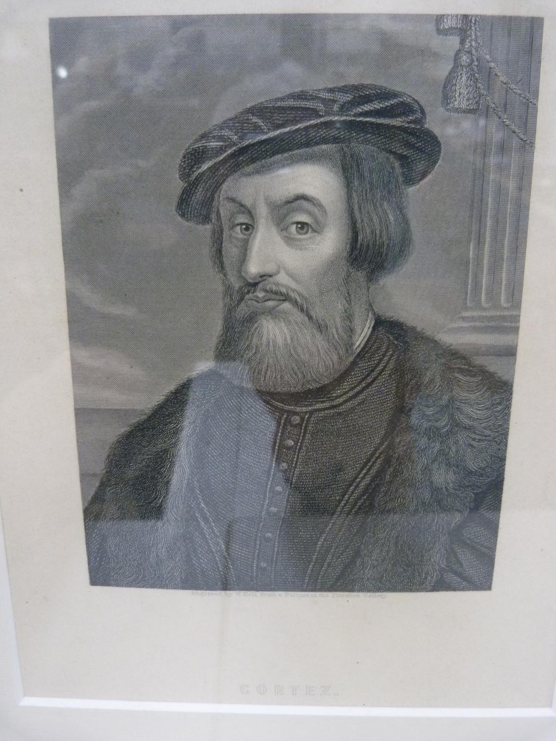 Set of ten prints depicting portraits including Peter the Great, Rembrandt, Lord Palmerston, Cortez, Mary Queen of Scots, Voltaire, Josiah Wedgwood etc.