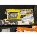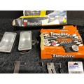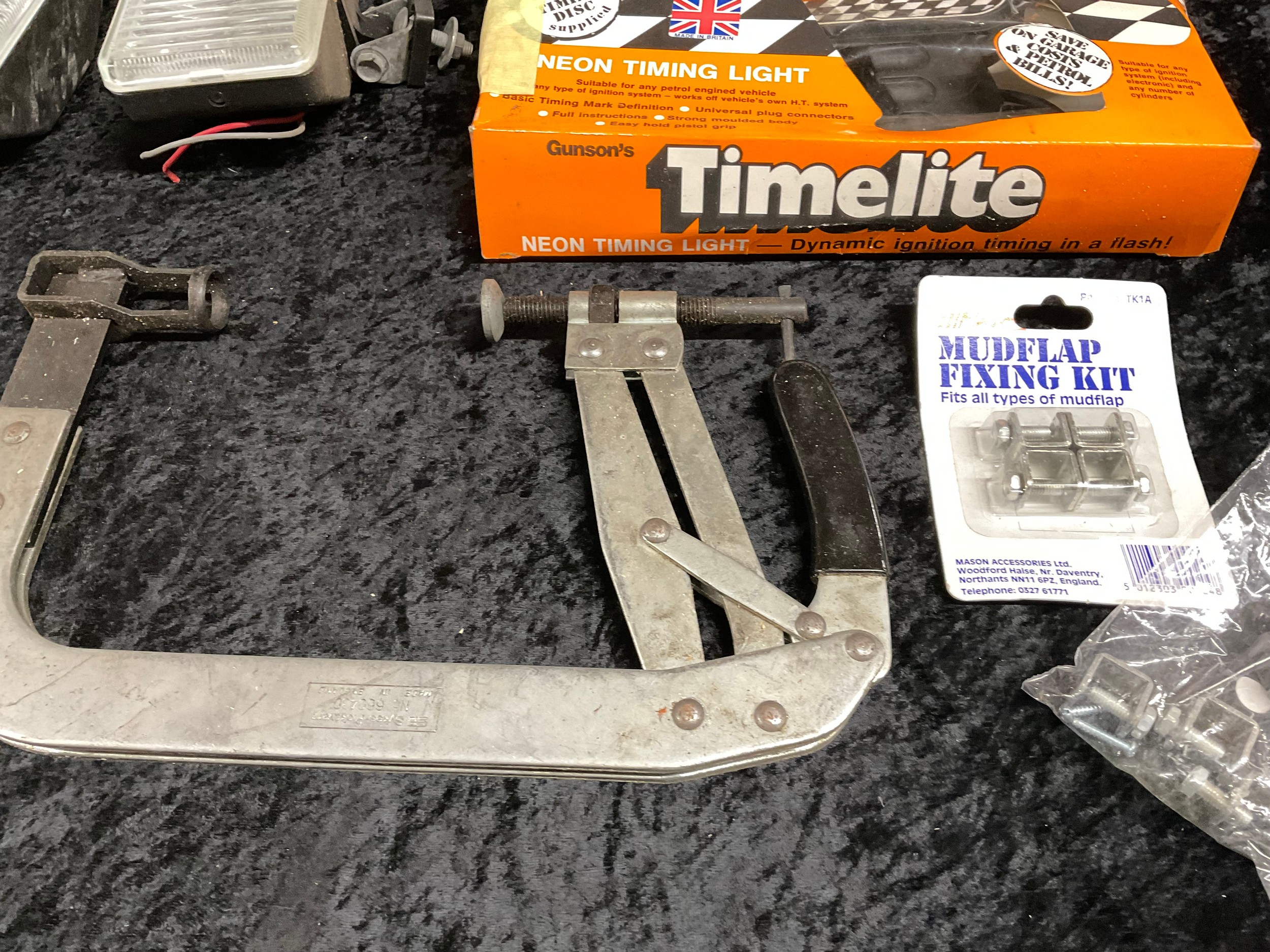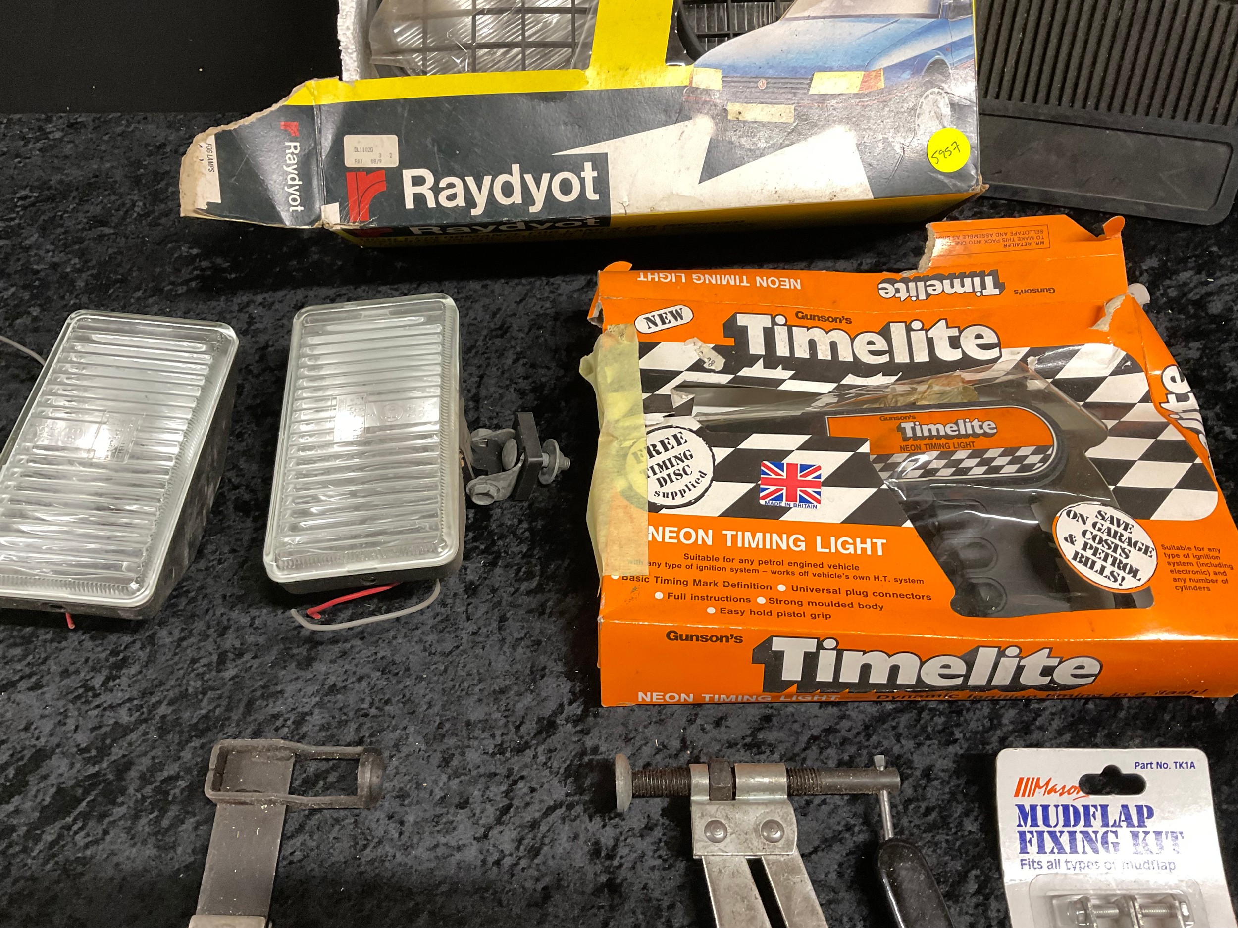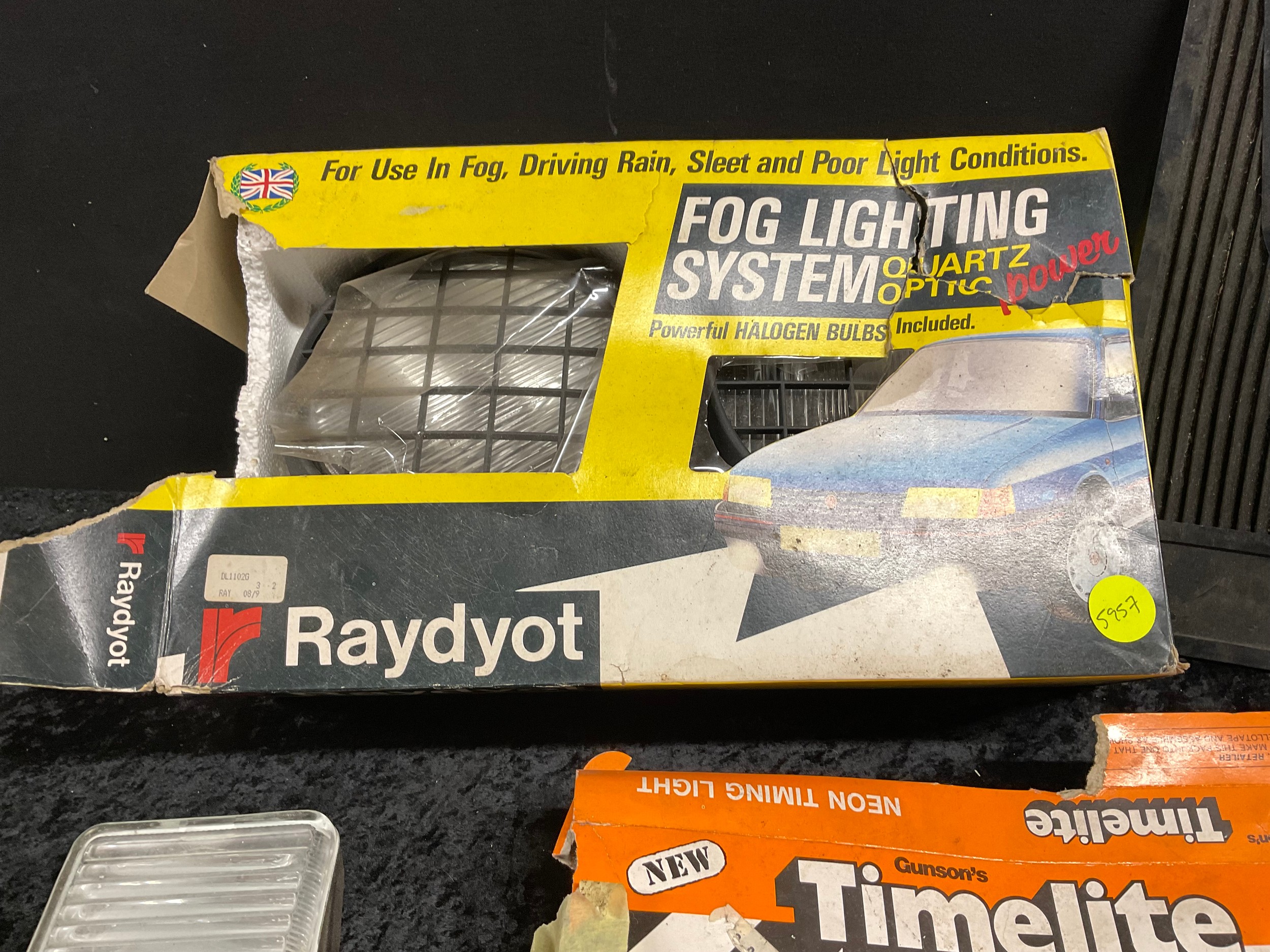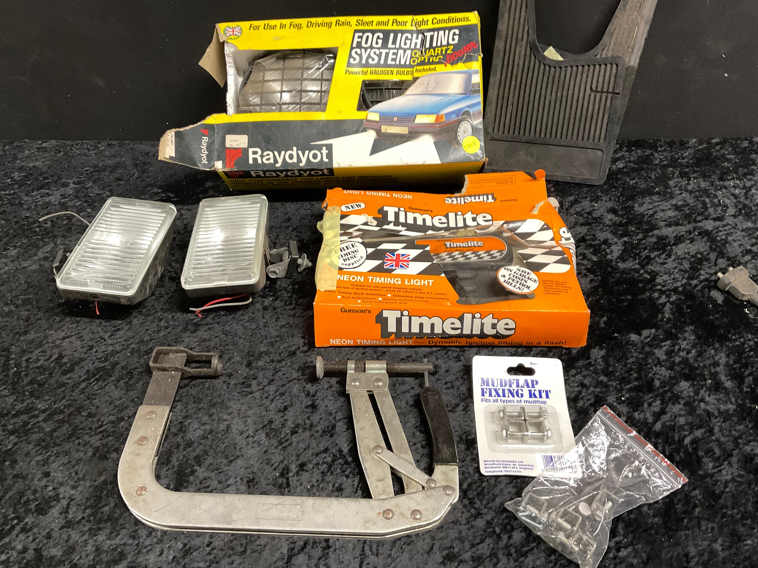 BOX OF CAR RELATED ITEMS TO INCLUDE FOG LIGHTS, STROBE LIGHT AND MUD FLAPS ETC