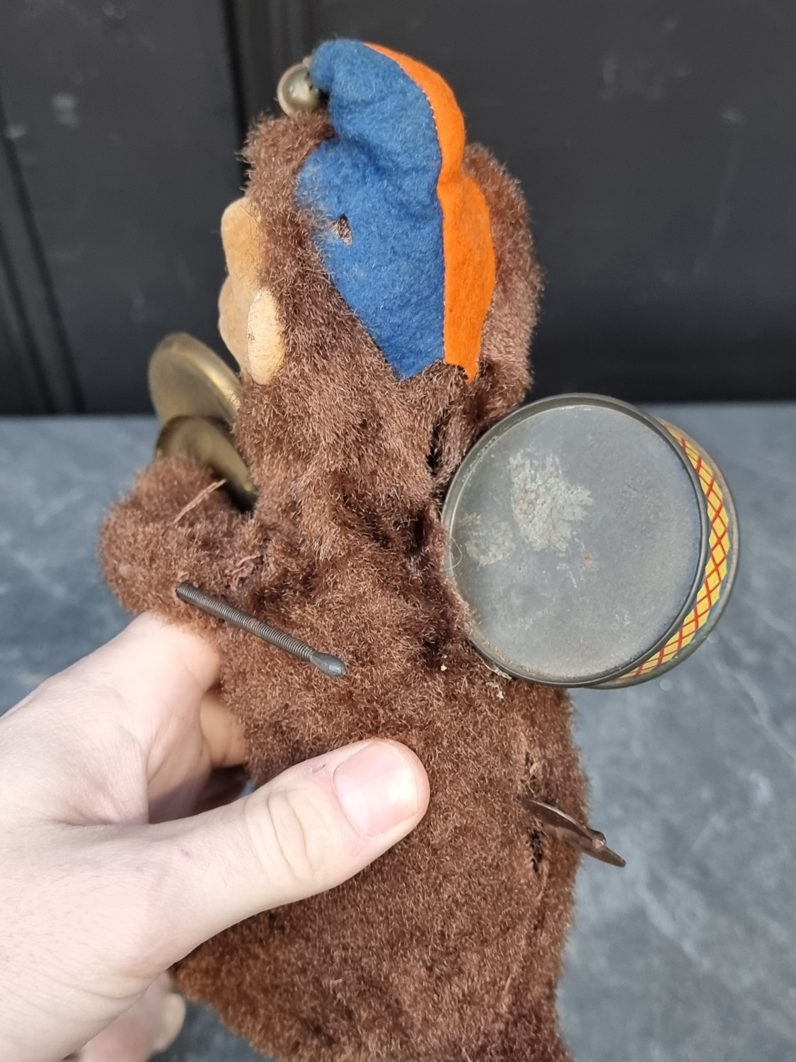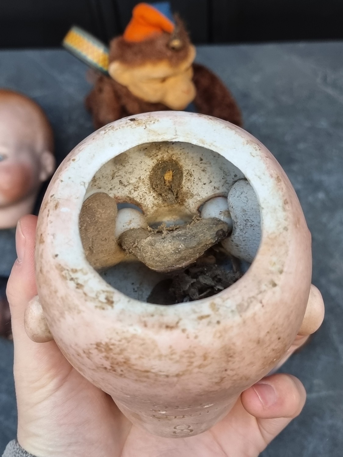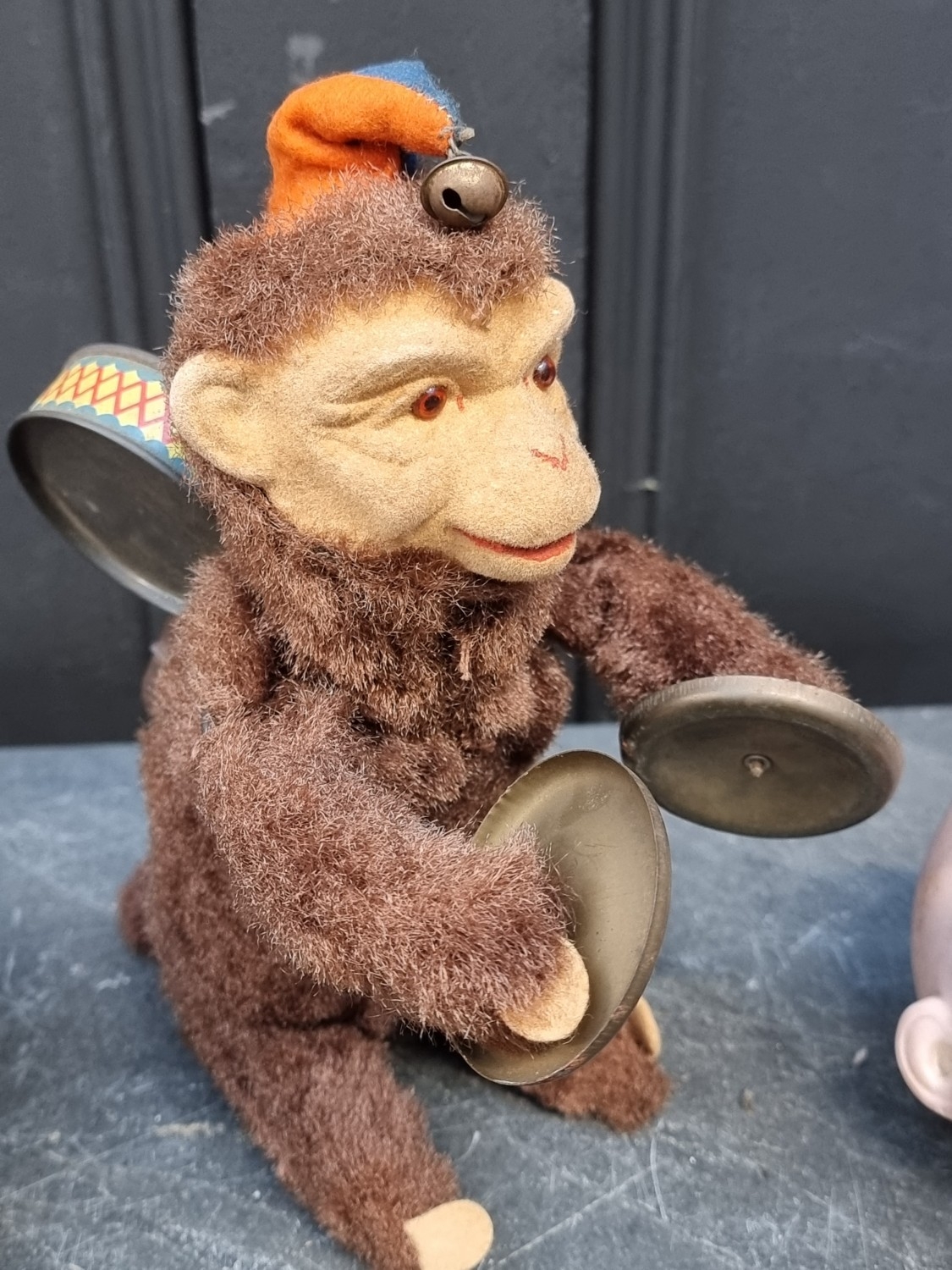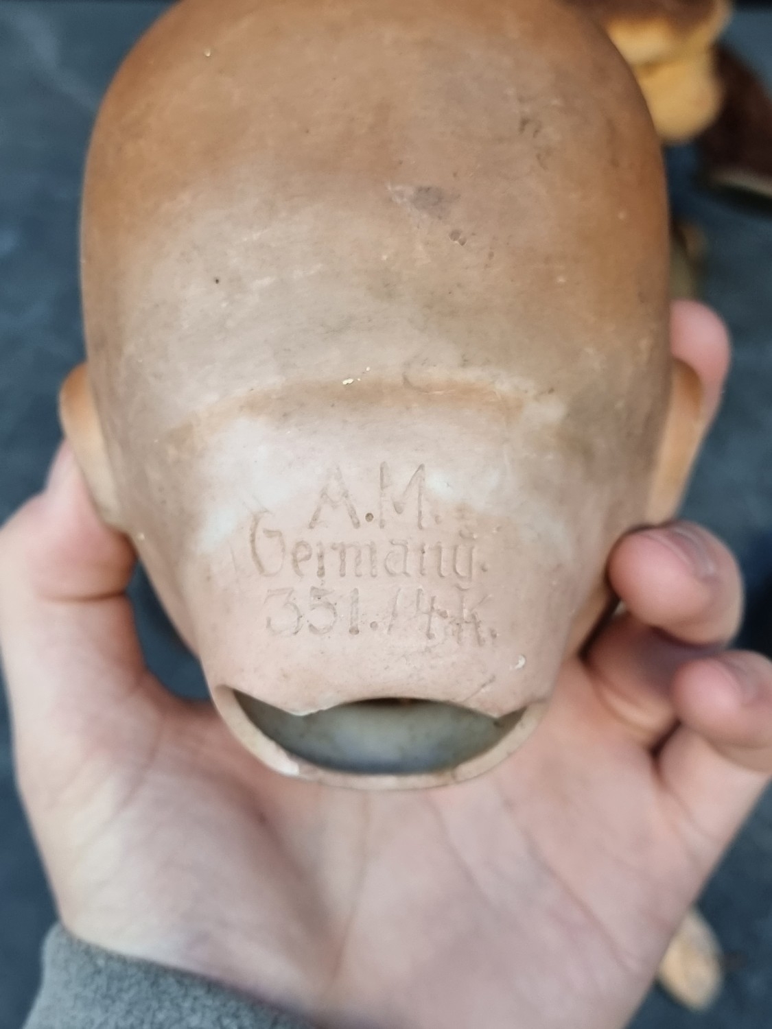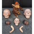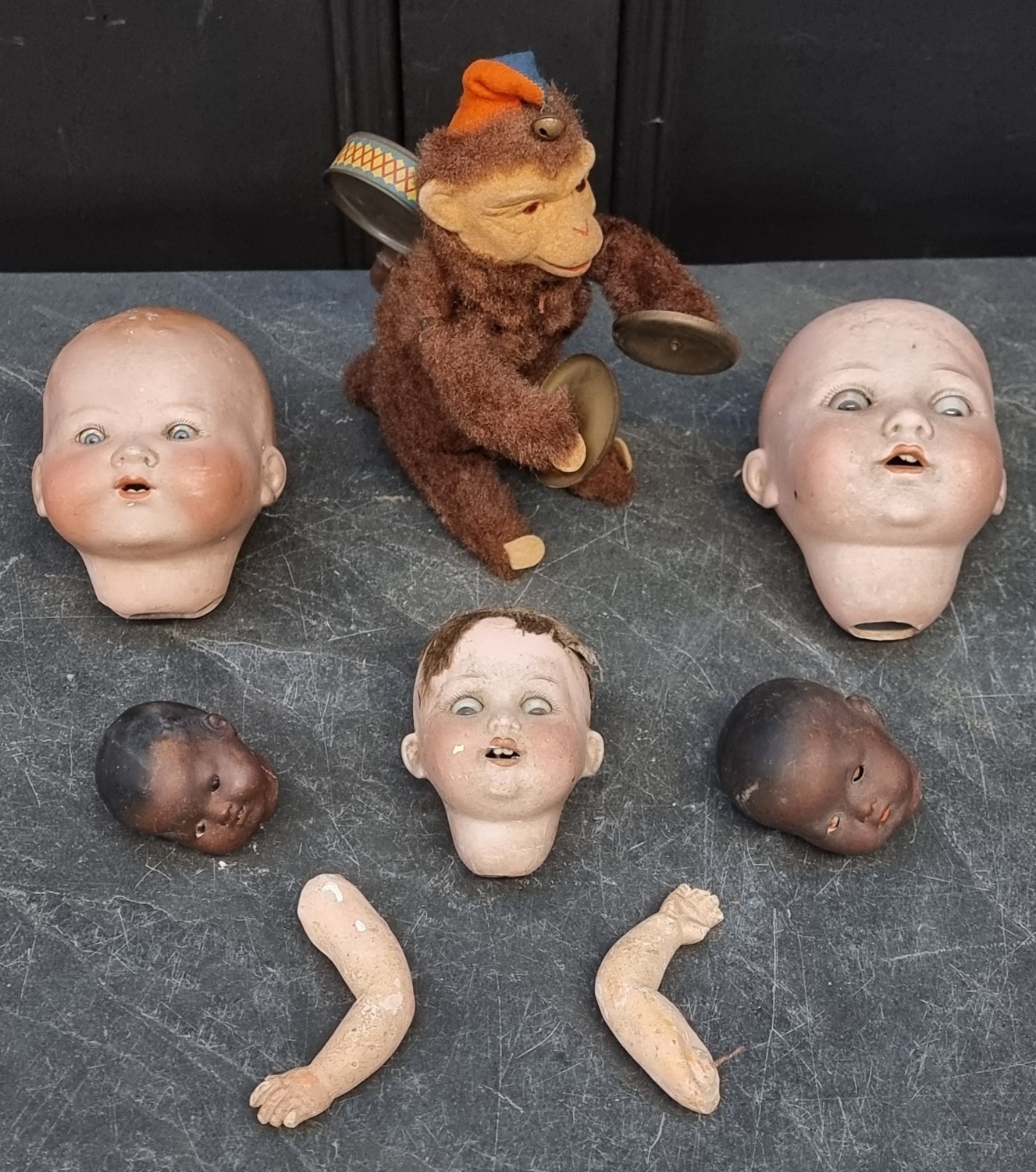 A small collection of bisque doll heads and limbs, four by Armand Marseille; together with a vintage clockwork monkey.