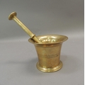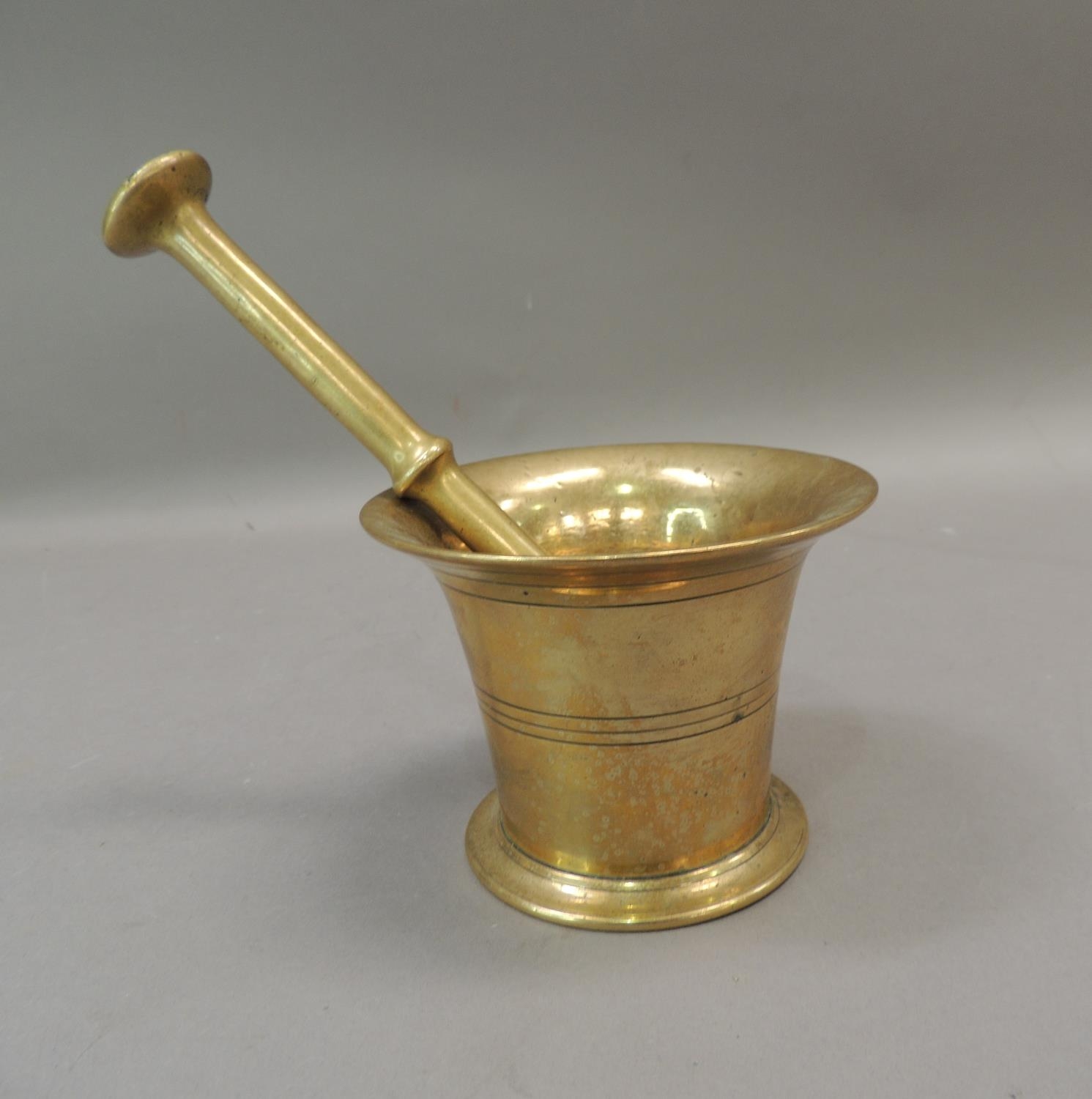 An antique bronze pestle and mortar, tapered cylindrical form with reeded bands, mortar 8.5cm high, 11cm diameter