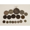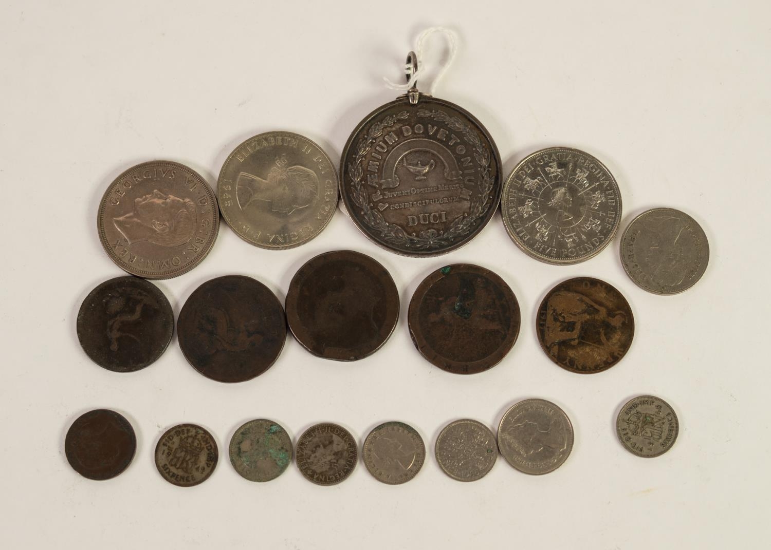 LARGE VICTORIAN ELECTROPLATE MEDALLION POSSIBLY HORTICULTURAL COLLEGE 'INSTITUTIO ACADEMICA PATERNA ET COLLEGIUM DOVETONIUM' featuring honey, sheep and flowers motif, presentation inscription to edge H.F.W. Hamer Dec 19th 1872, 2" (5cm) diameter, with ring suspension and a SMALL SELECTION OF GB COINAGE including George VI half crown 1937, Victoria farthing 1839 (VF) (sixteen pieces in total) (16)