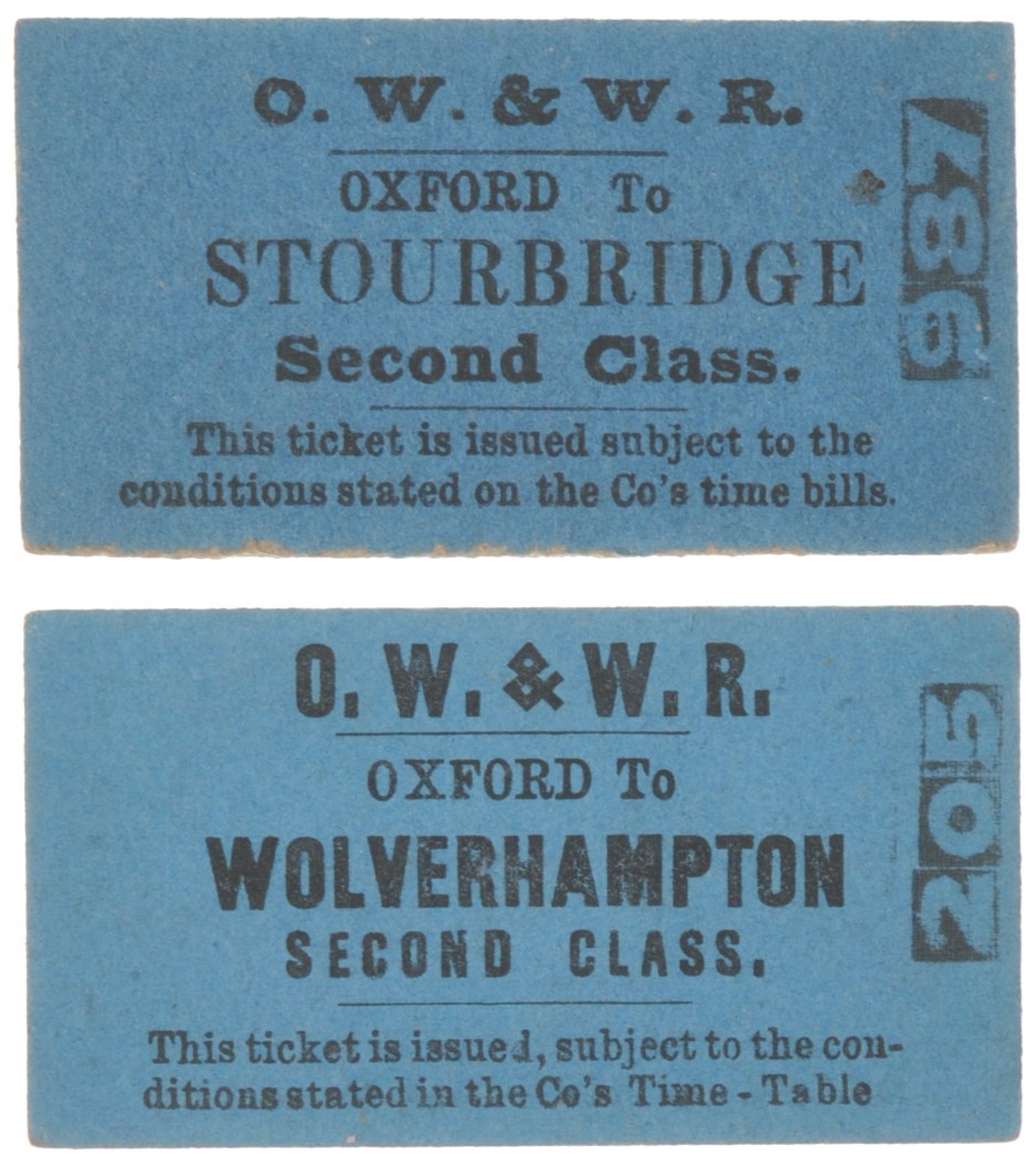 Tickets, Oxford, Worcester & Wolverhampton Railway, a second class single from Oxford to Stourbridge and similar from Oxford to Wolverhampton, c. 1860s/70s. (2)(CHOC) (Dispatch by Mailboxes/Collect from Banbury Depot)