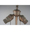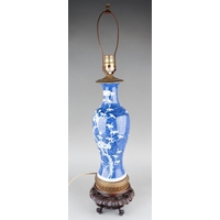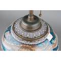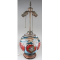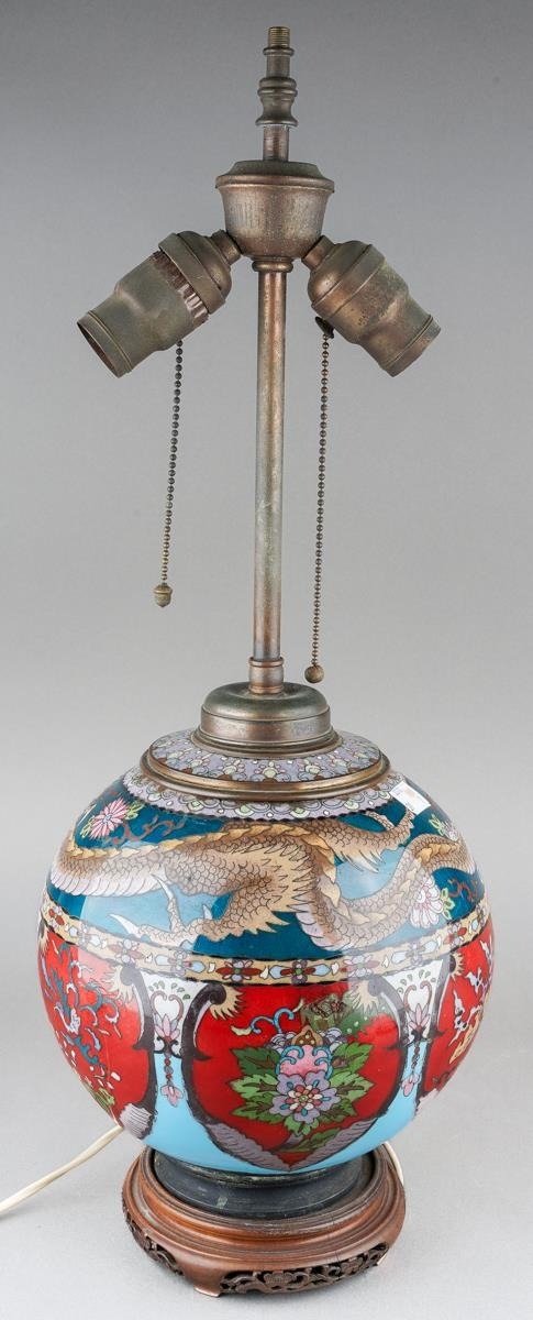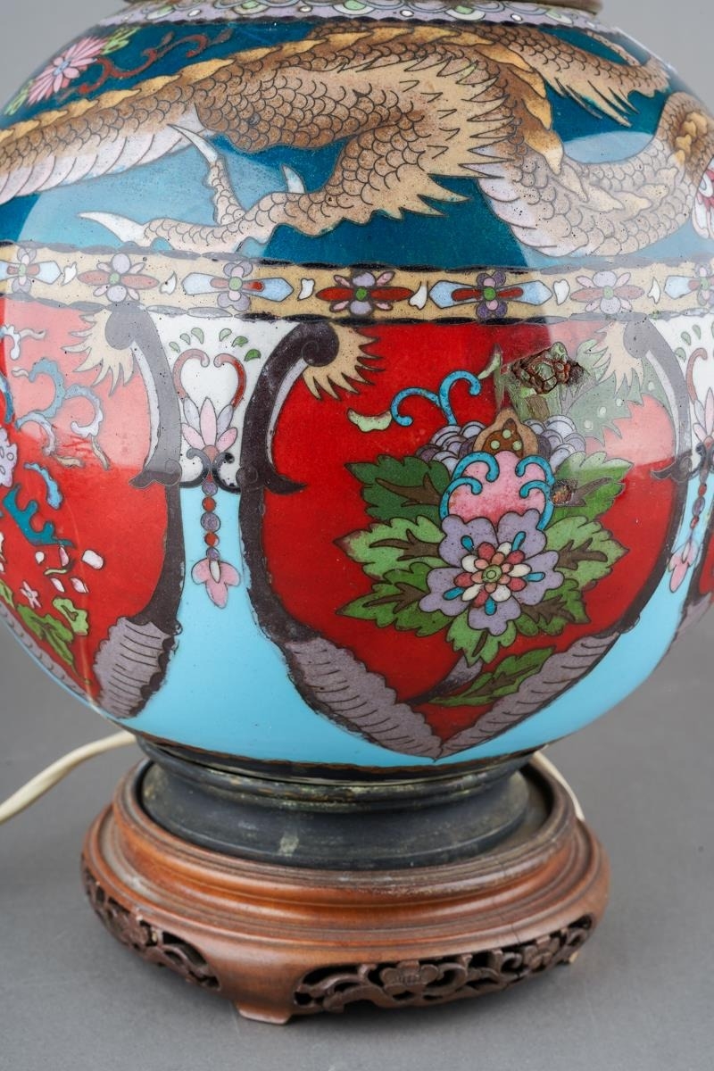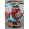 An Asian possibly Japanese cloisonne globular urn decorated with three claw Dragon to collar above panels decorated with flowers, birds or insect in red, blue and green palette, converted to table lamp on carved wooden stand, approx 57cm high [1] electrified but untested