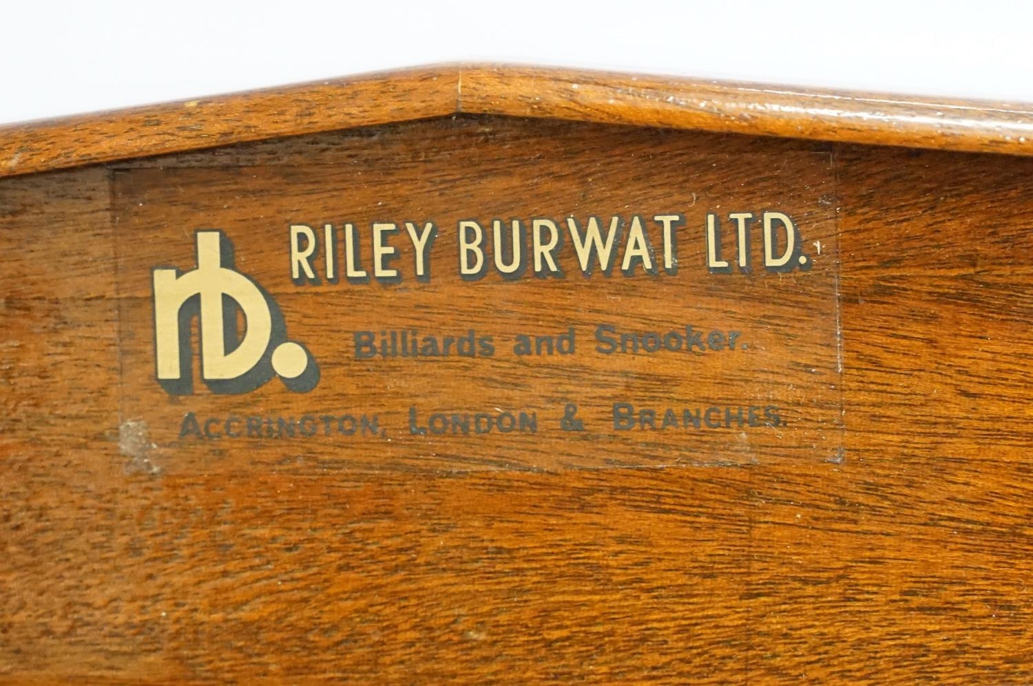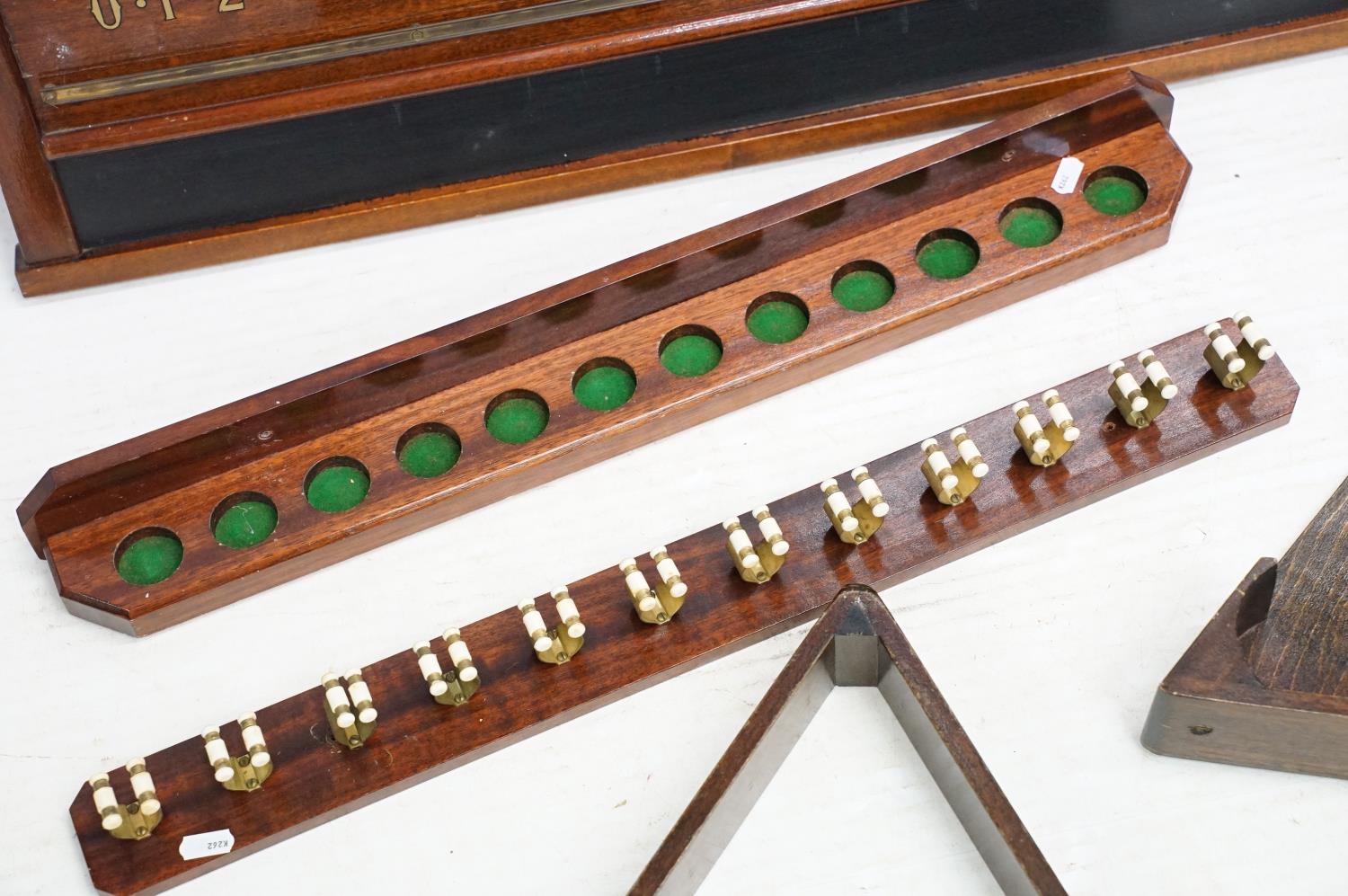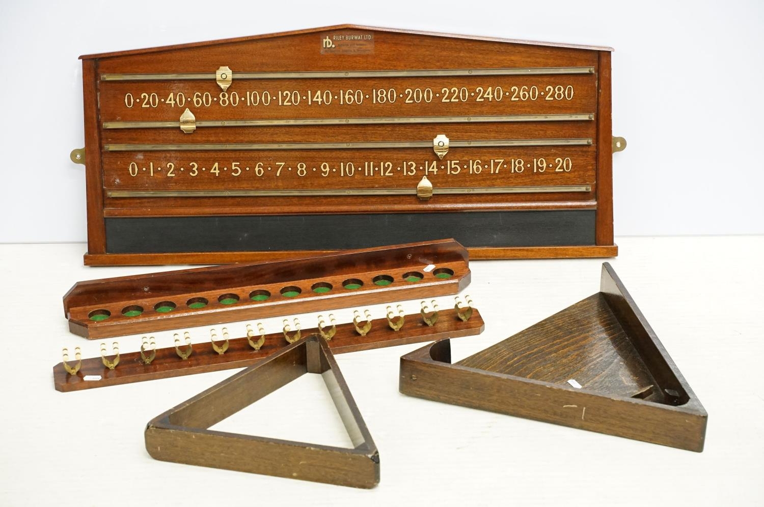 Riley Burwat Ltd snooker / billiards scoreboard, together with a cue rack and triangle & stand