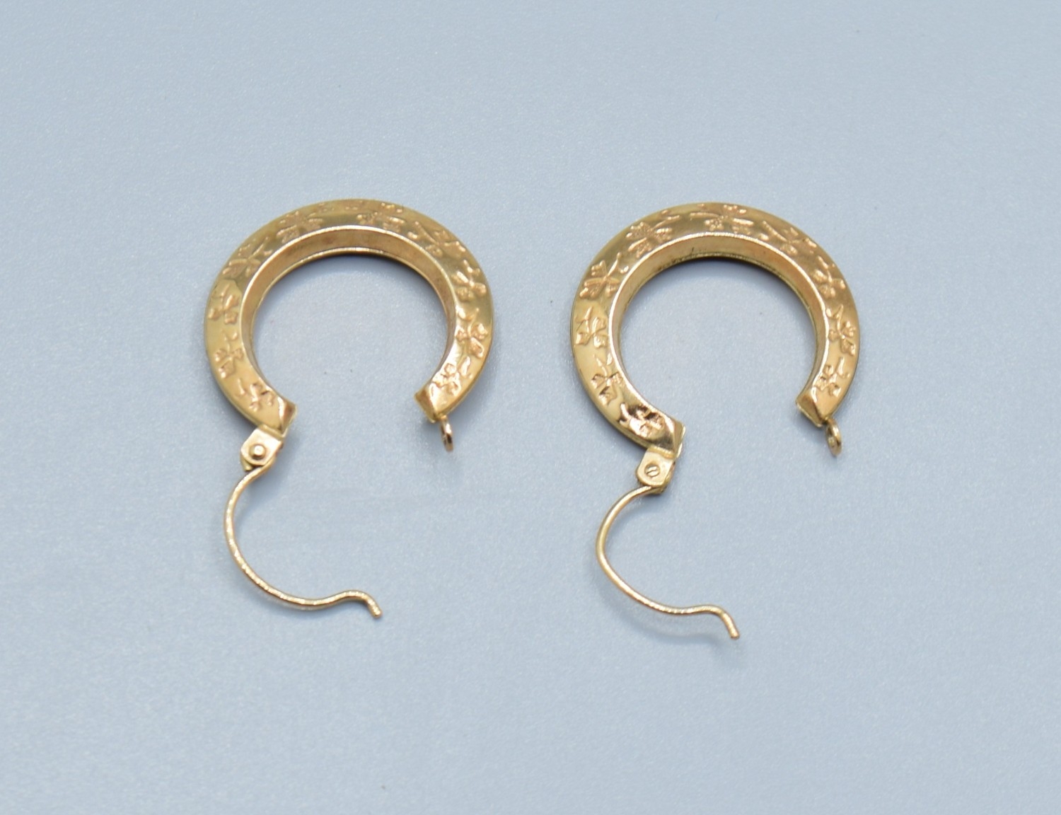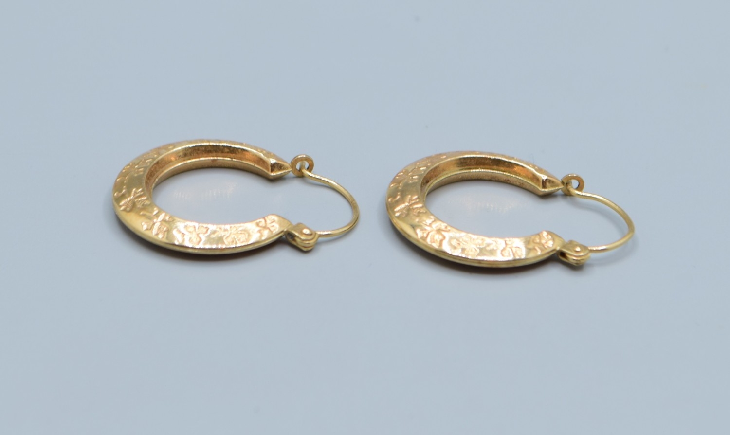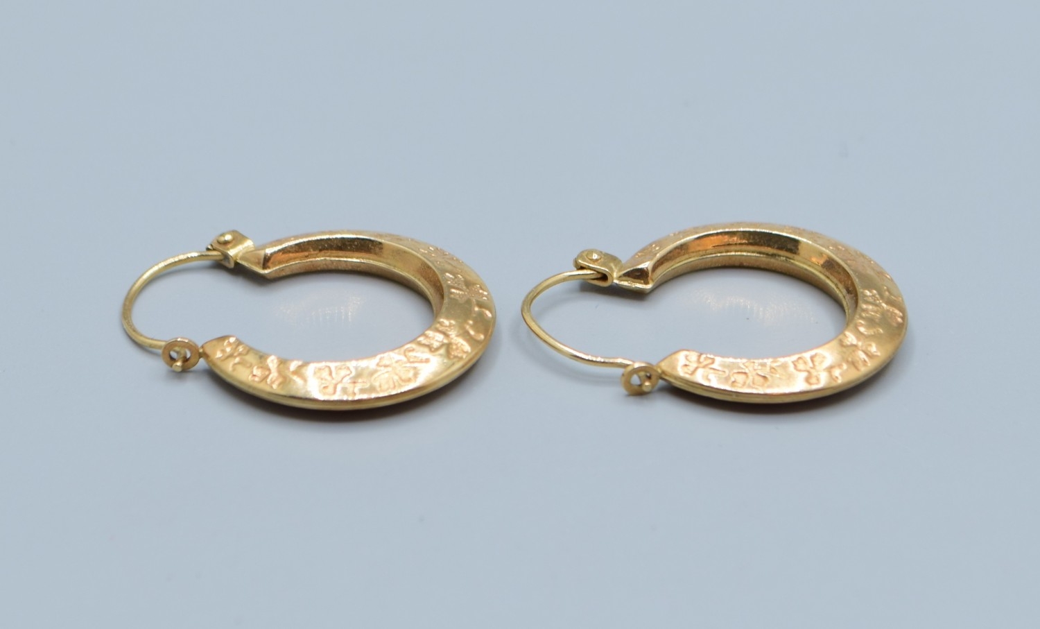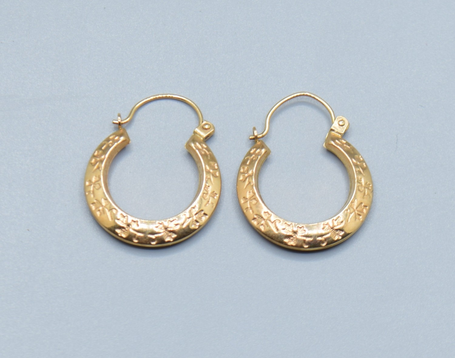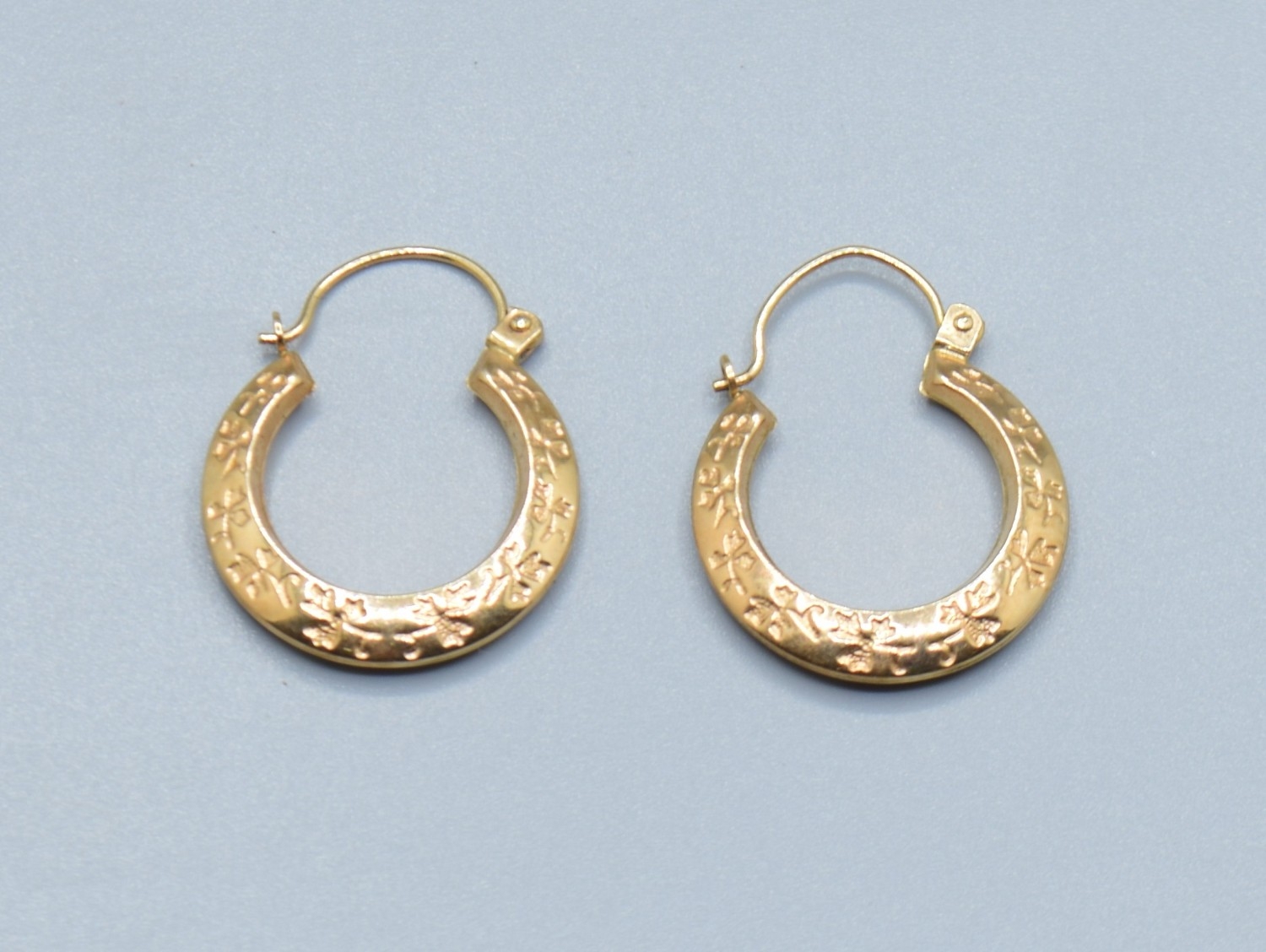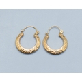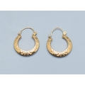 9ct gold round hoop foliate design earrings 18mm diameter, 4mm widest