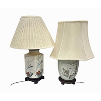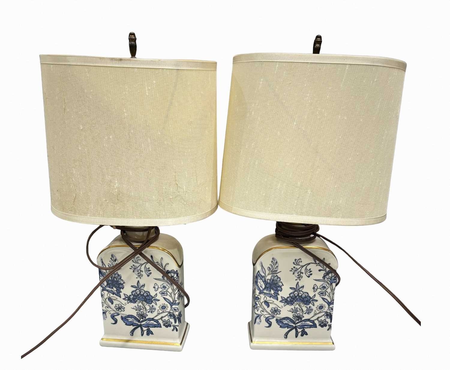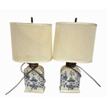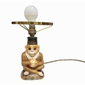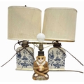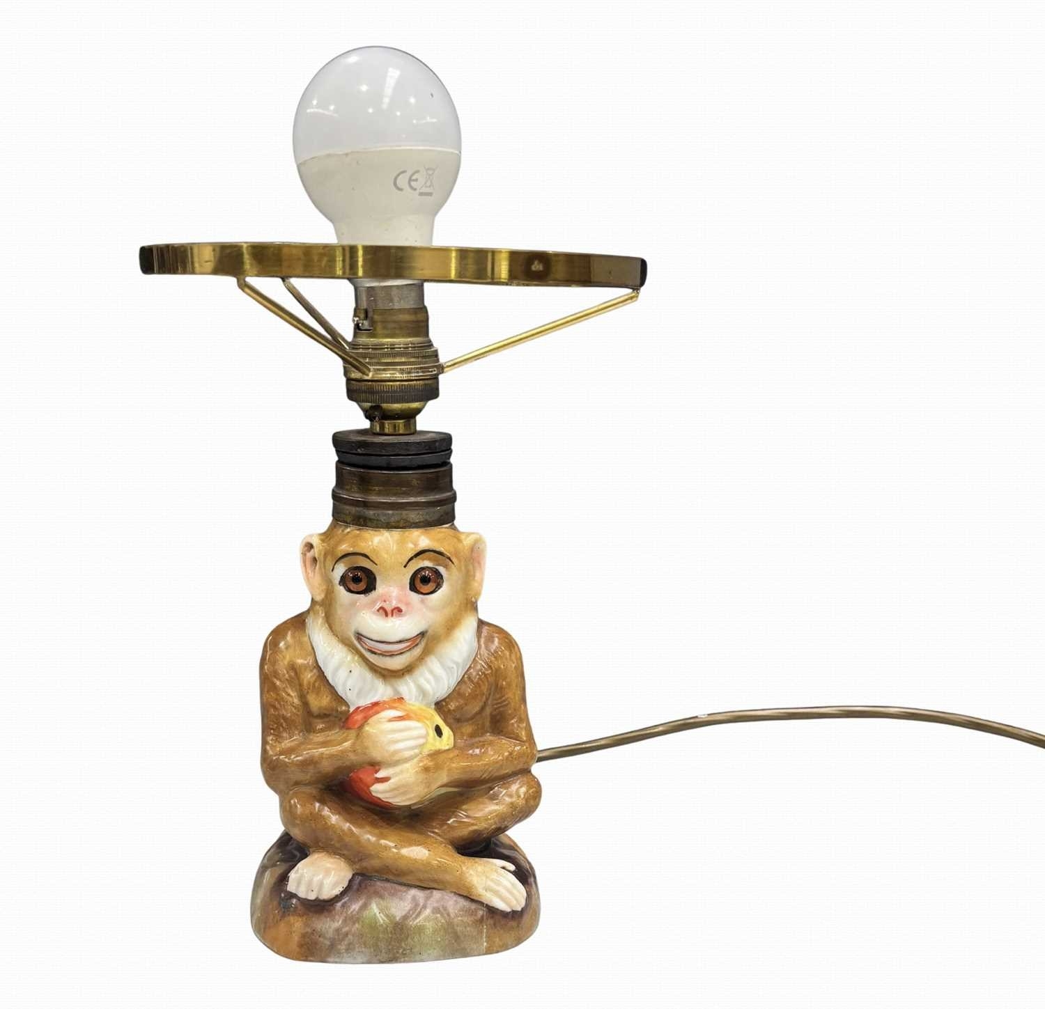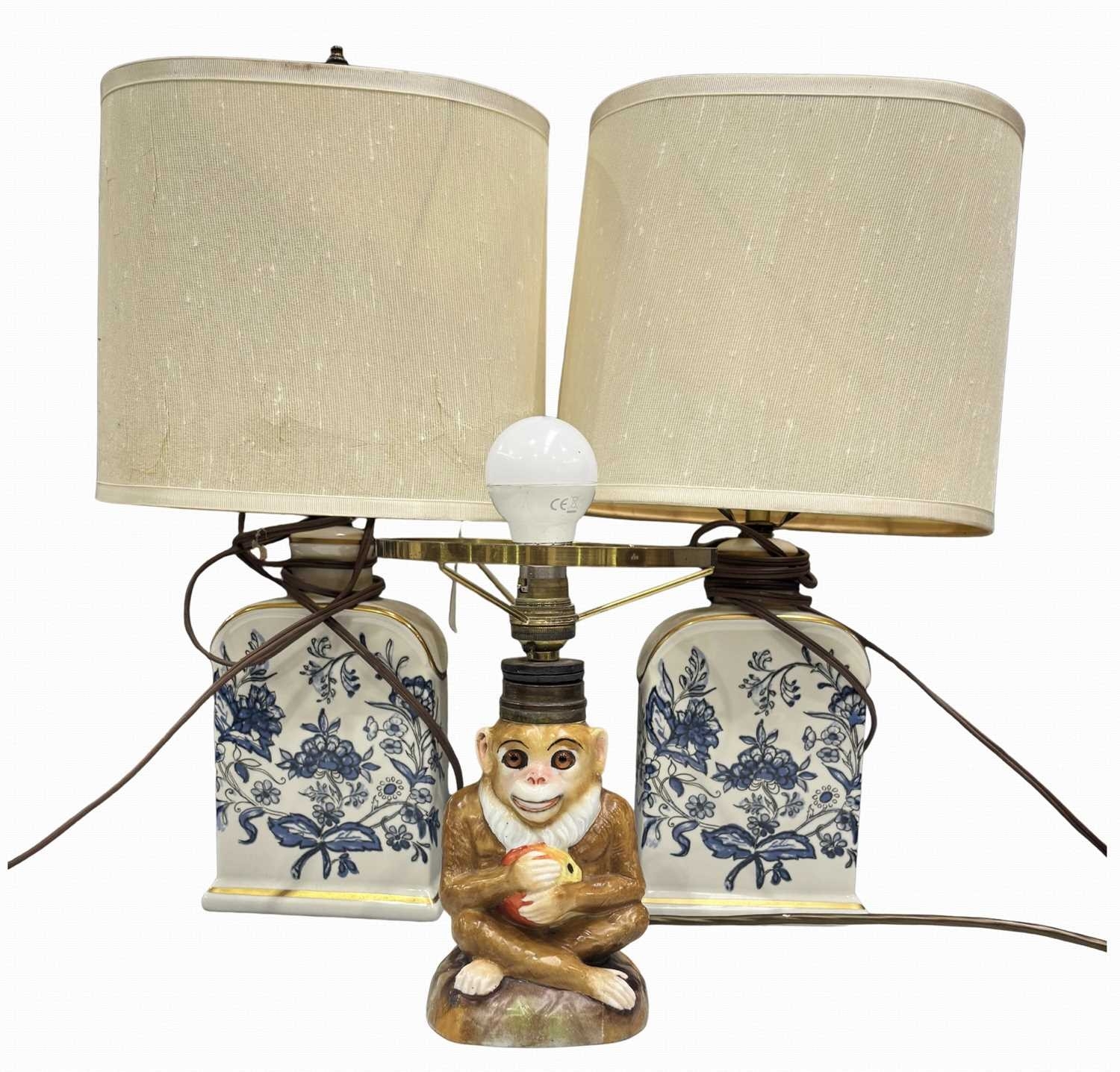 A late 19th century porcelain lamp formed as a monkey holding an apple, with glass eyes, marked to the underside 'RD 33399, P8, L' and '33', height to fitting approx 21cm, together with a pair of blue and white porcelain bottle lamps (3)