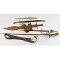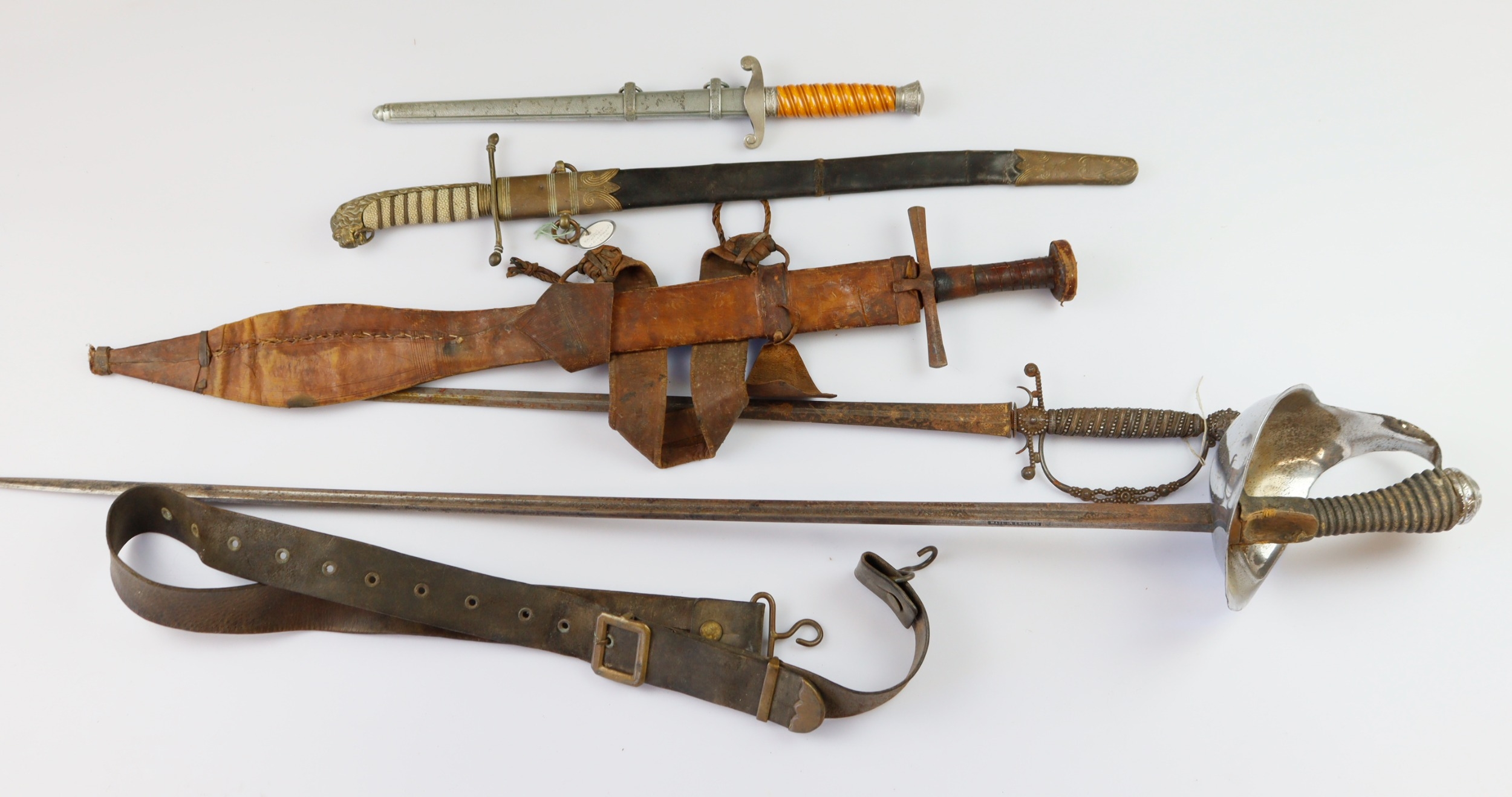 Group of Weapons, 1908 British Cavalry Sword, British Midshipmans Dirk, French Short Sword, German Army Dagger, Middle East weapon with scabbard and belt (Qty) Buyer collects