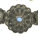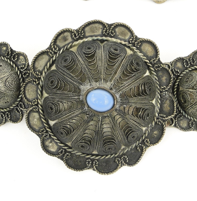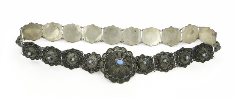 Middle Eastern silver coloured metal filigree belt with turquoise settings