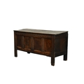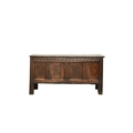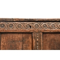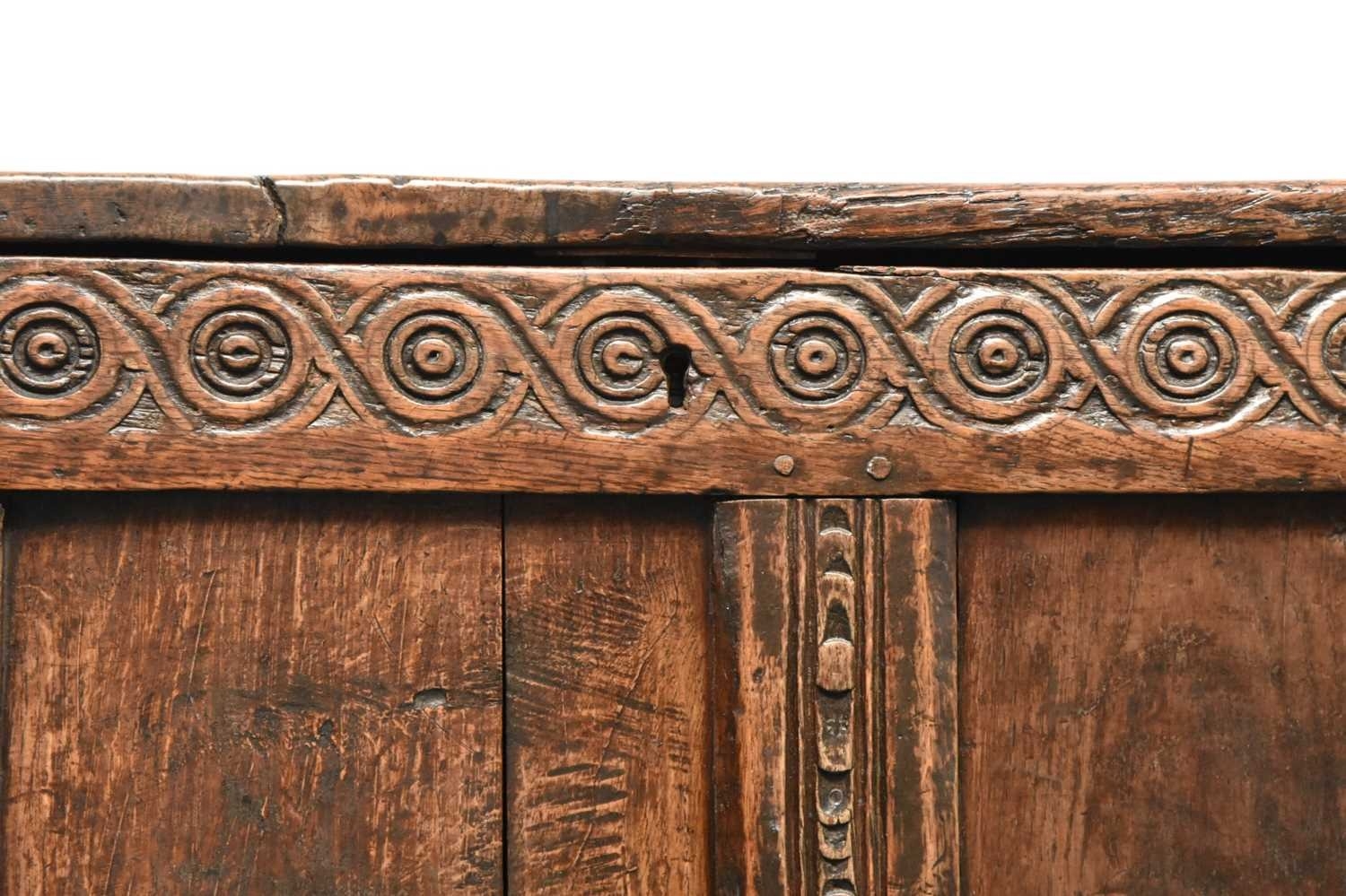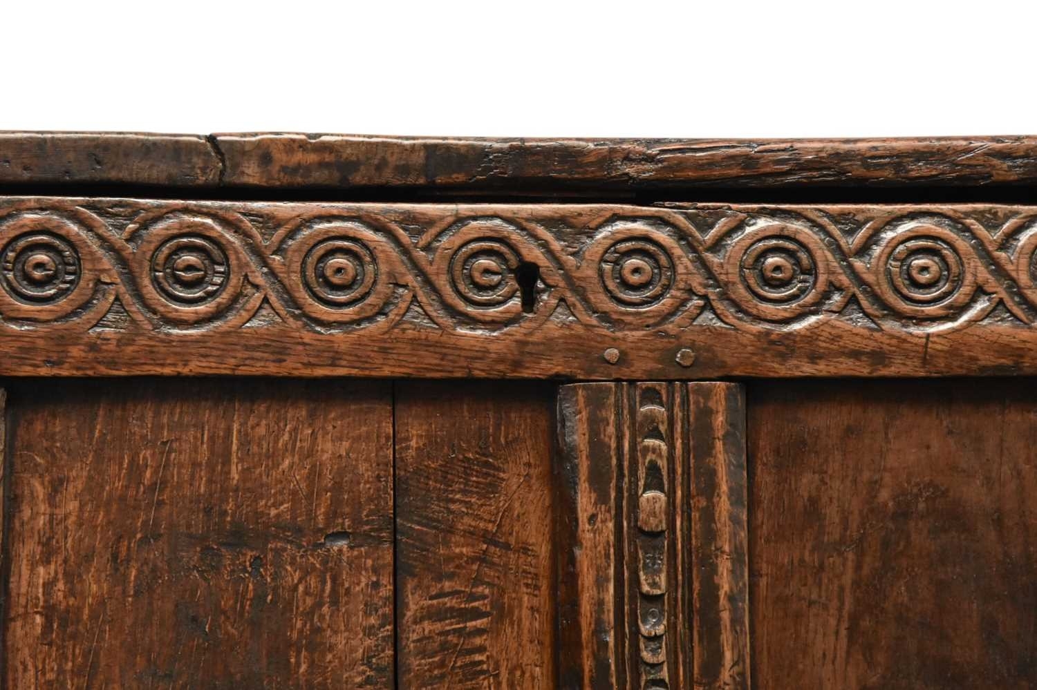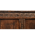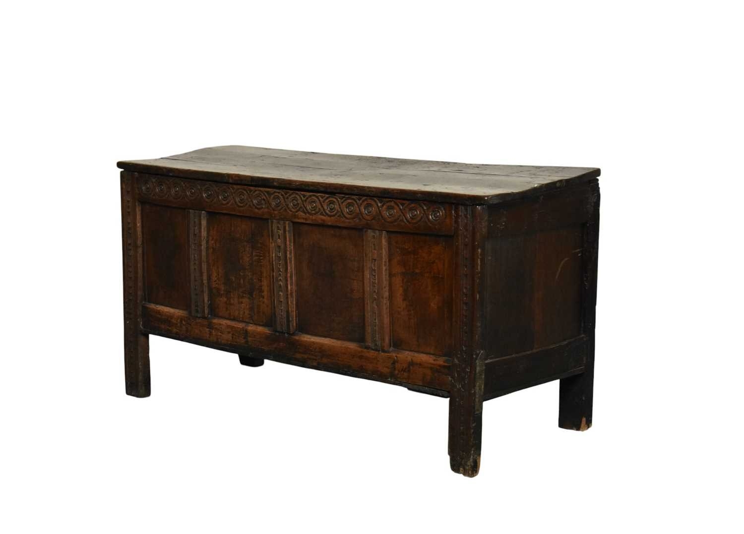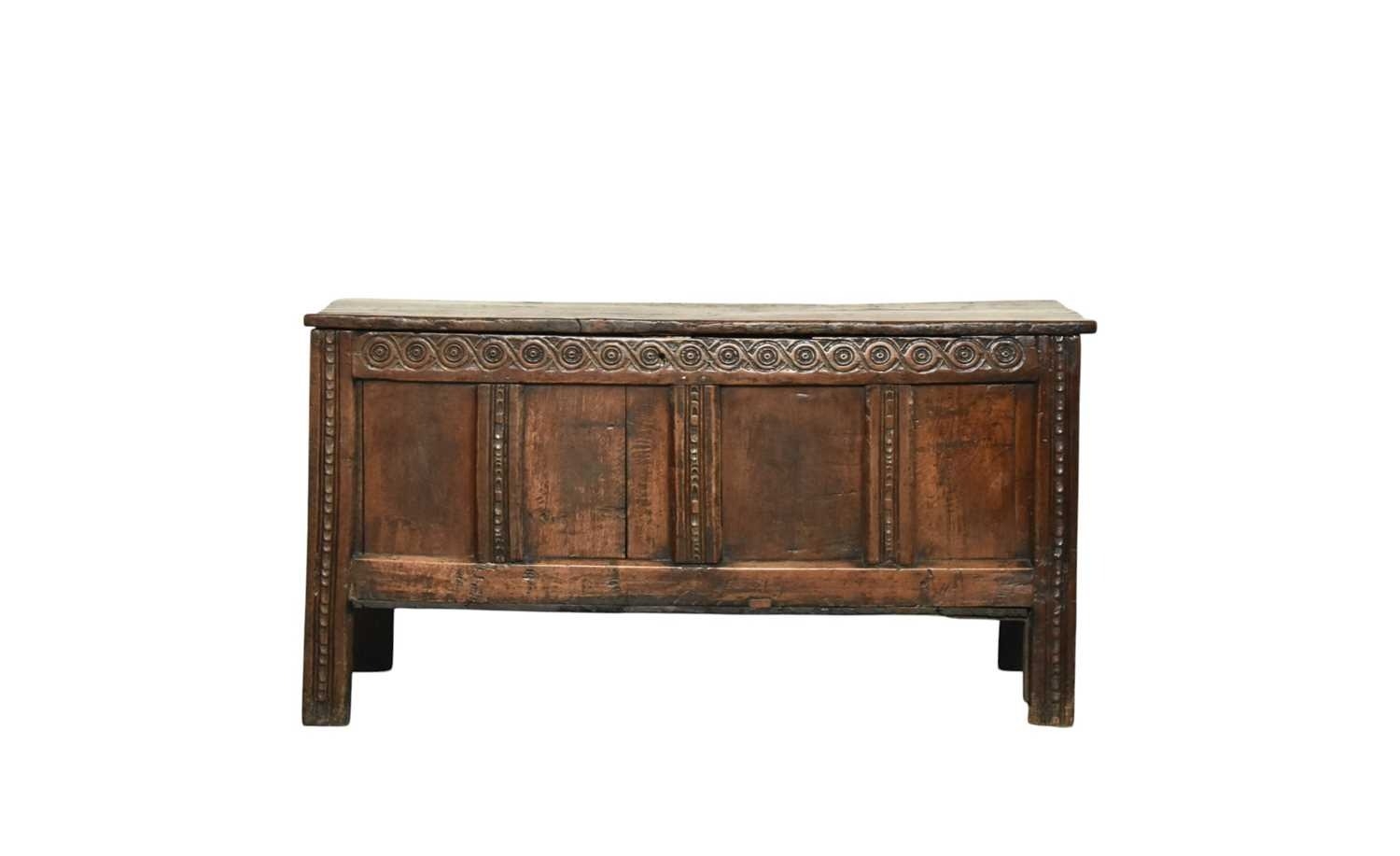 A 17th century oak four panel coffer The plain boarded top opening onto a plain interior, over a guilloche carved frieze chip carving and channel molding on the stiles, raised on extended block stiles. 139cm wide x 51cm deep x 71cm high