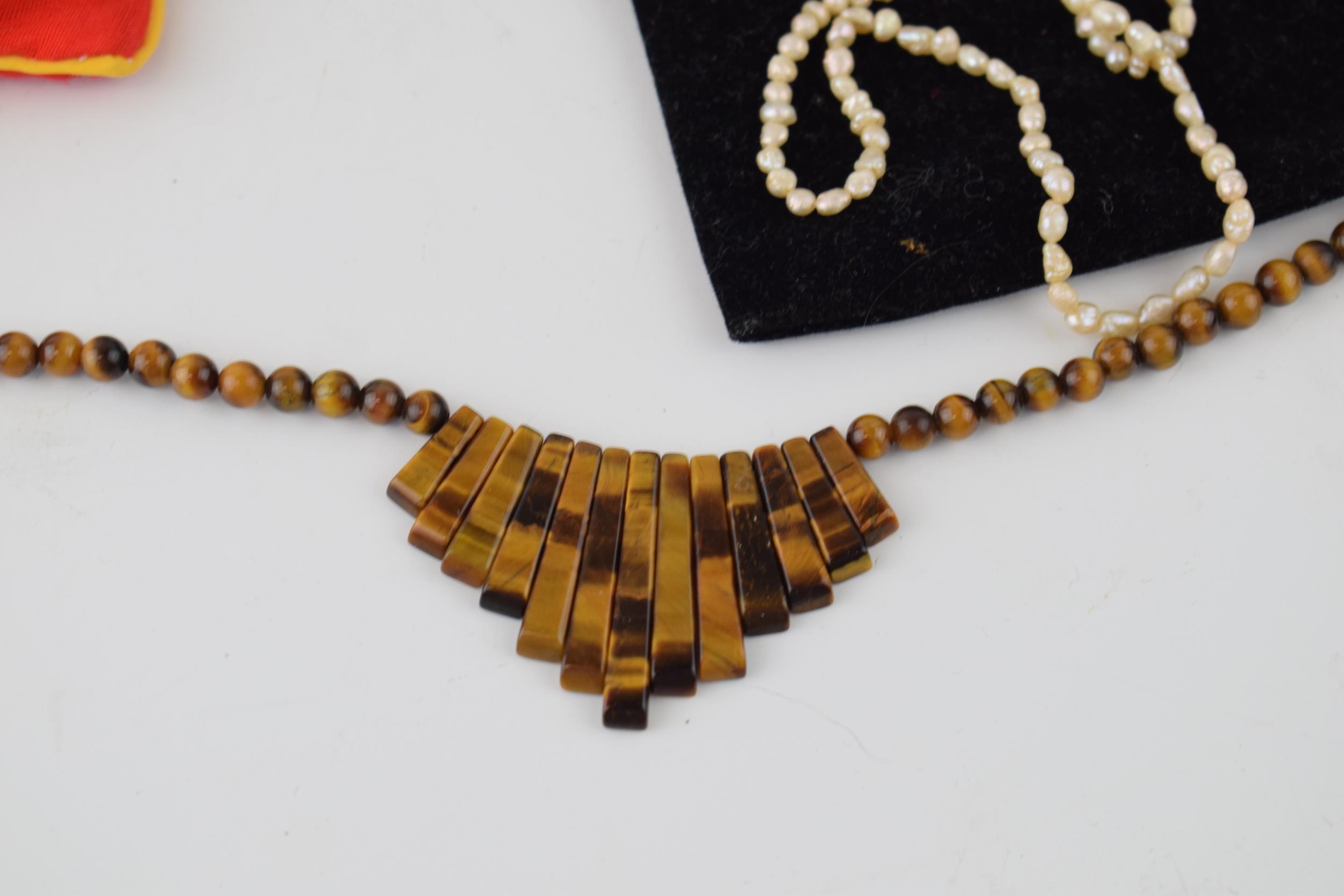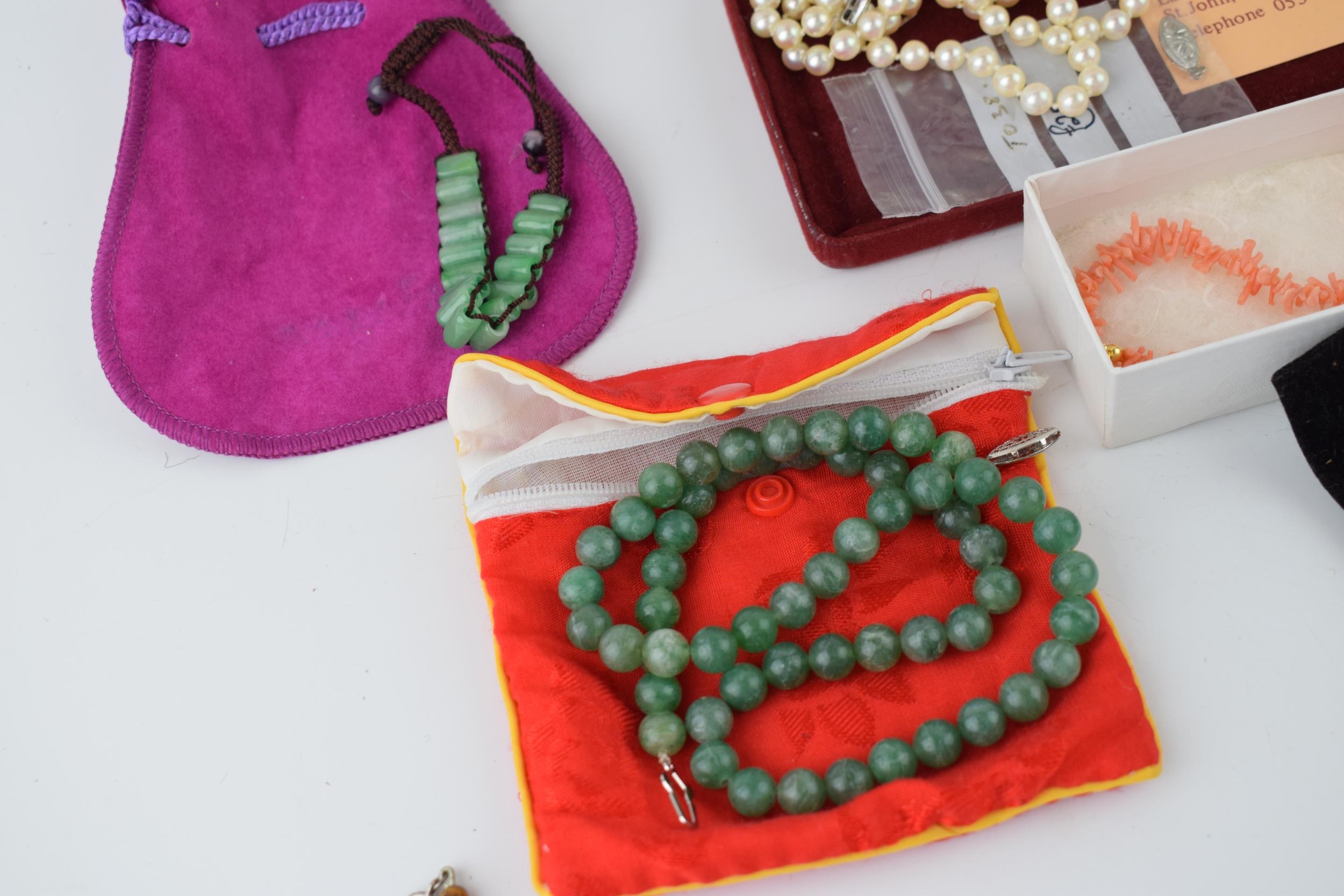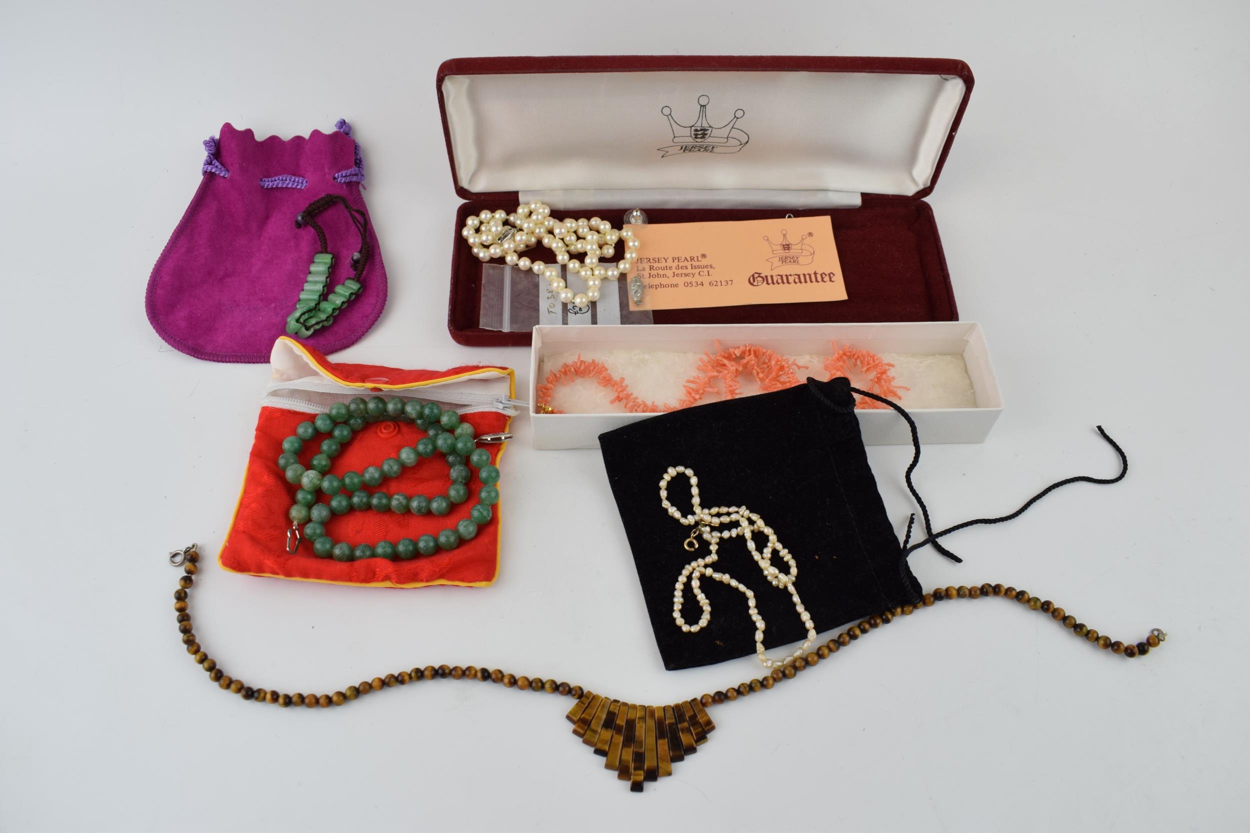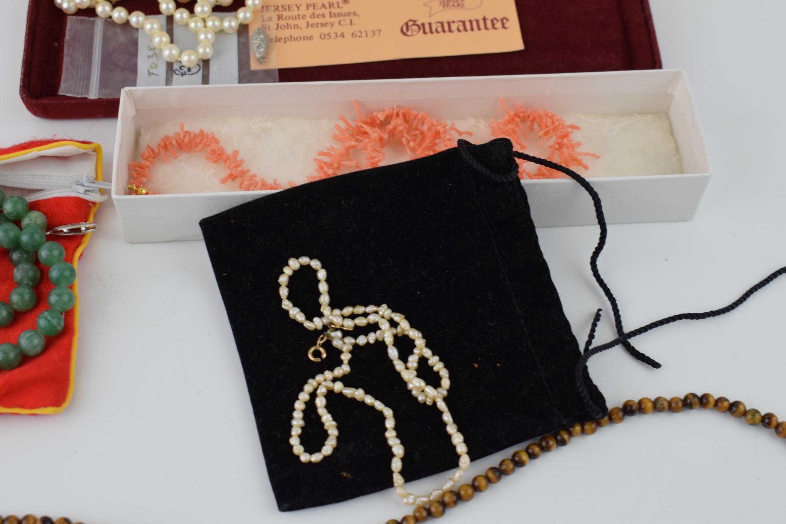 A collection of jewellery items to include freshwater pearls, Jersey pearls, coral necklace, jade necklace, jade bracelet together with a tigers eye necklace. (Qty)