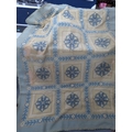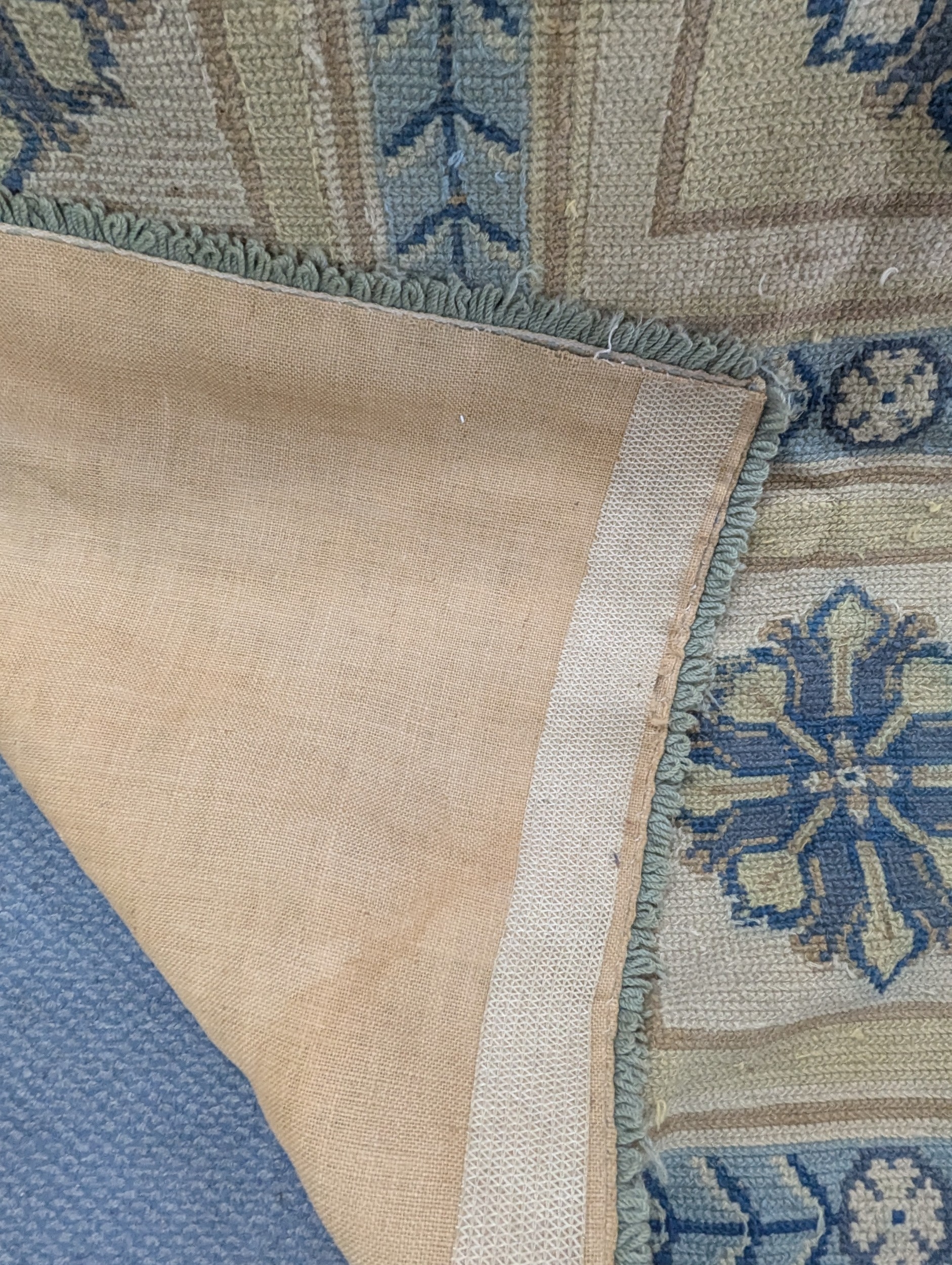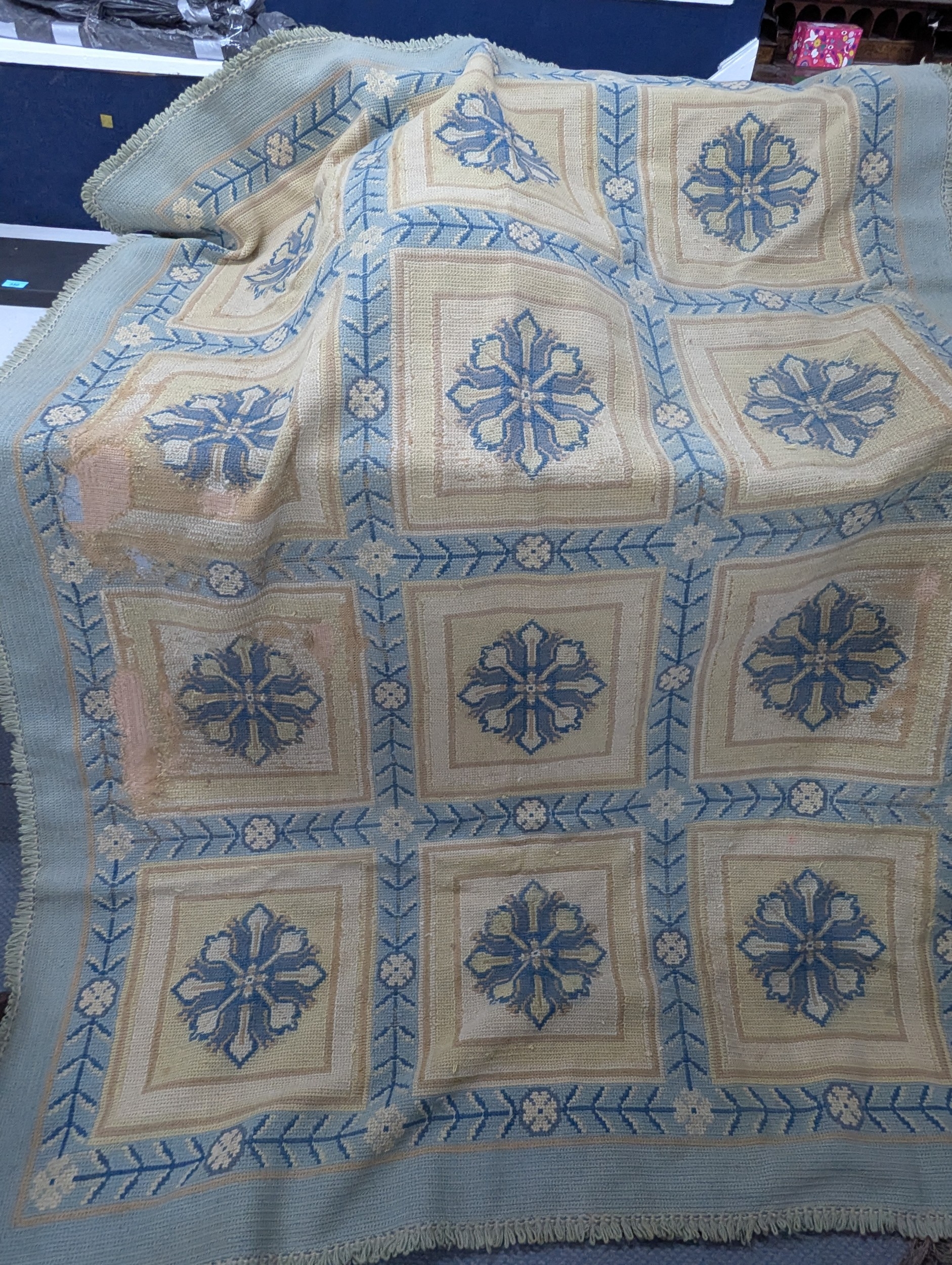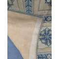 An embraided rug with geometric style panels on a blue ground 67cm x 225cm
