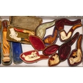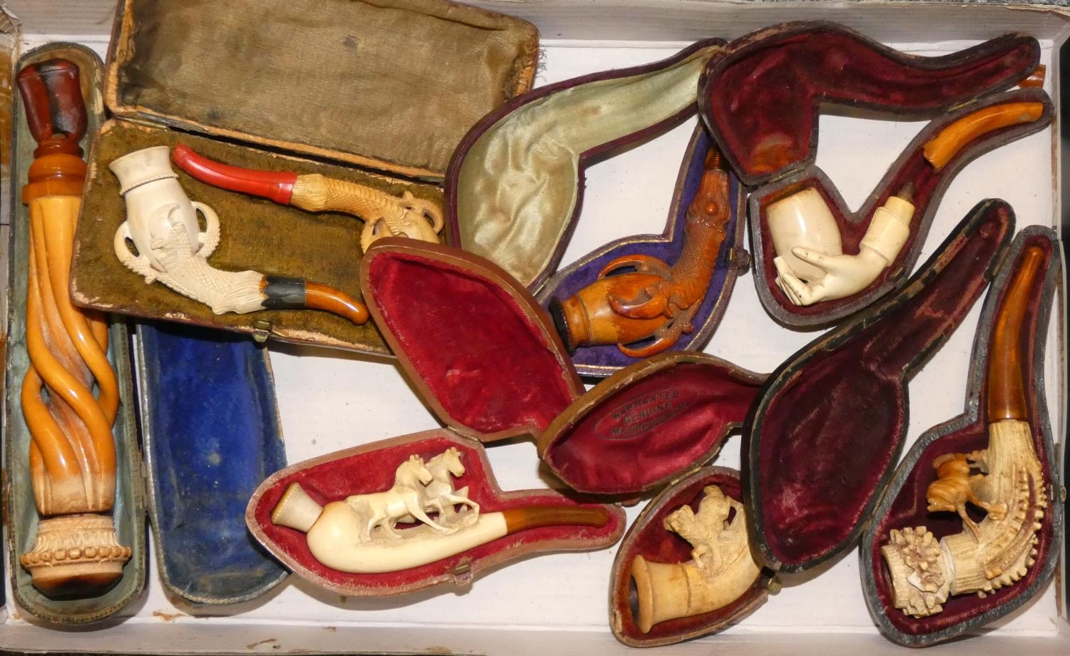 A collection of eight carved Meerschaum pipes, to included a hand holding the bowl, a claw holding the bowl (x3) and four others, cased