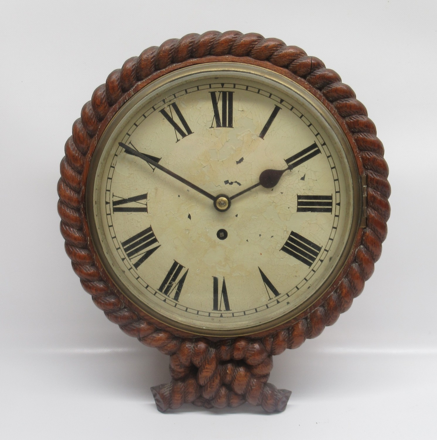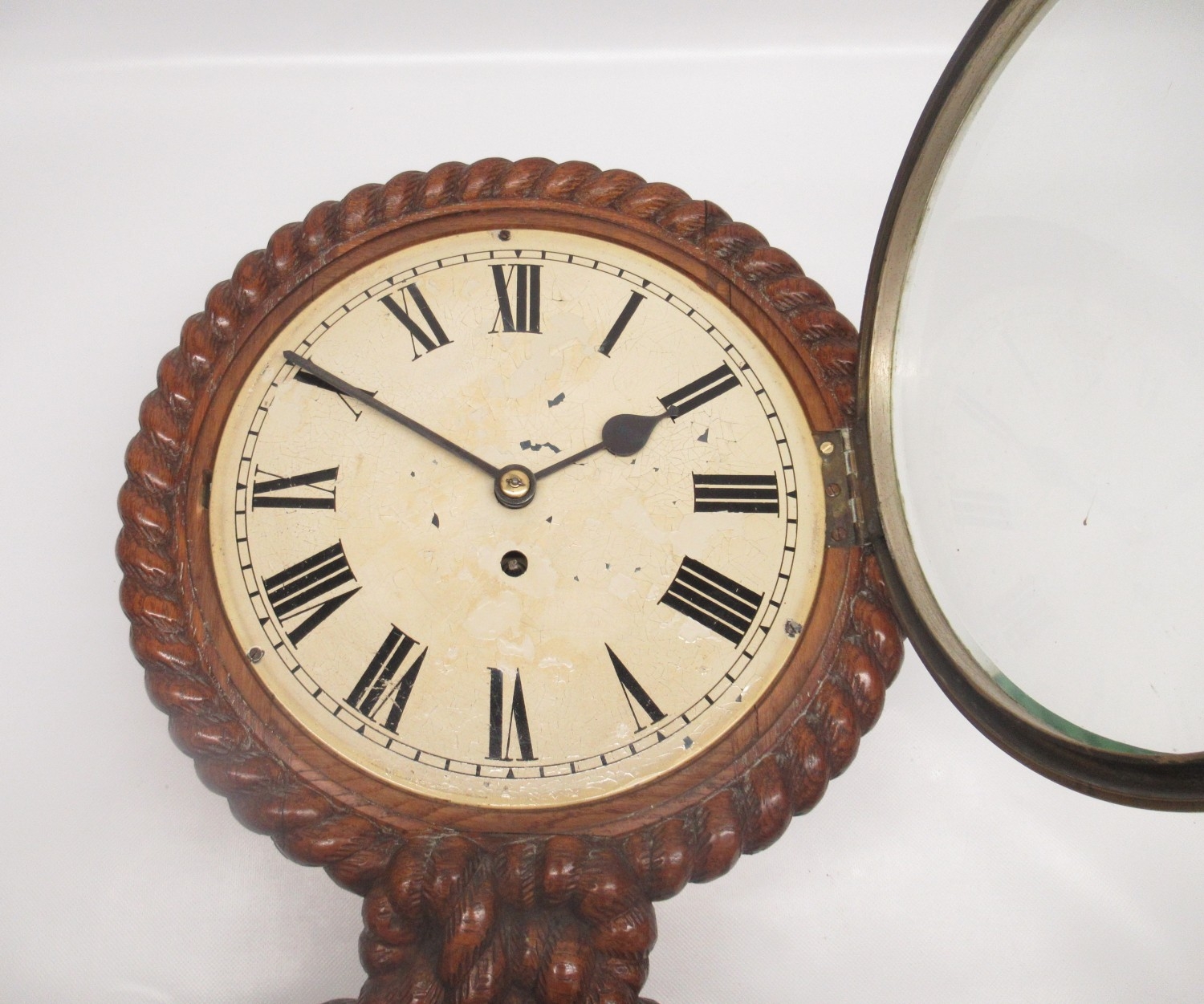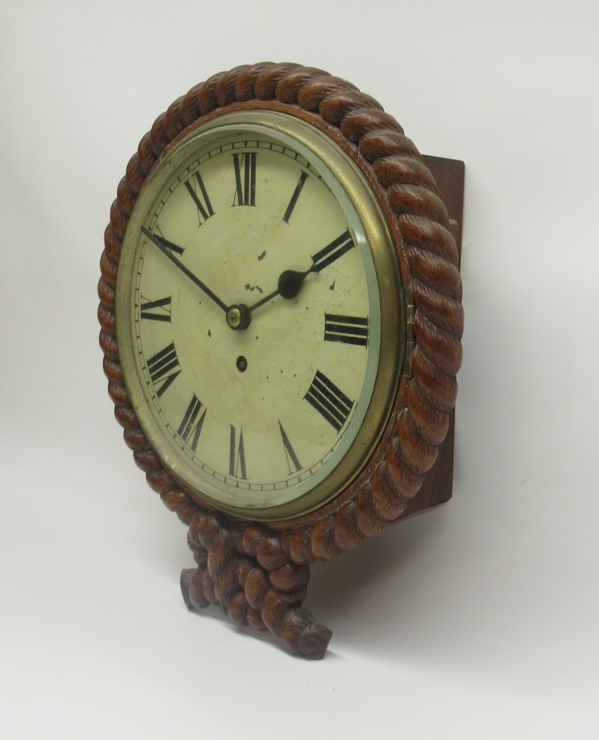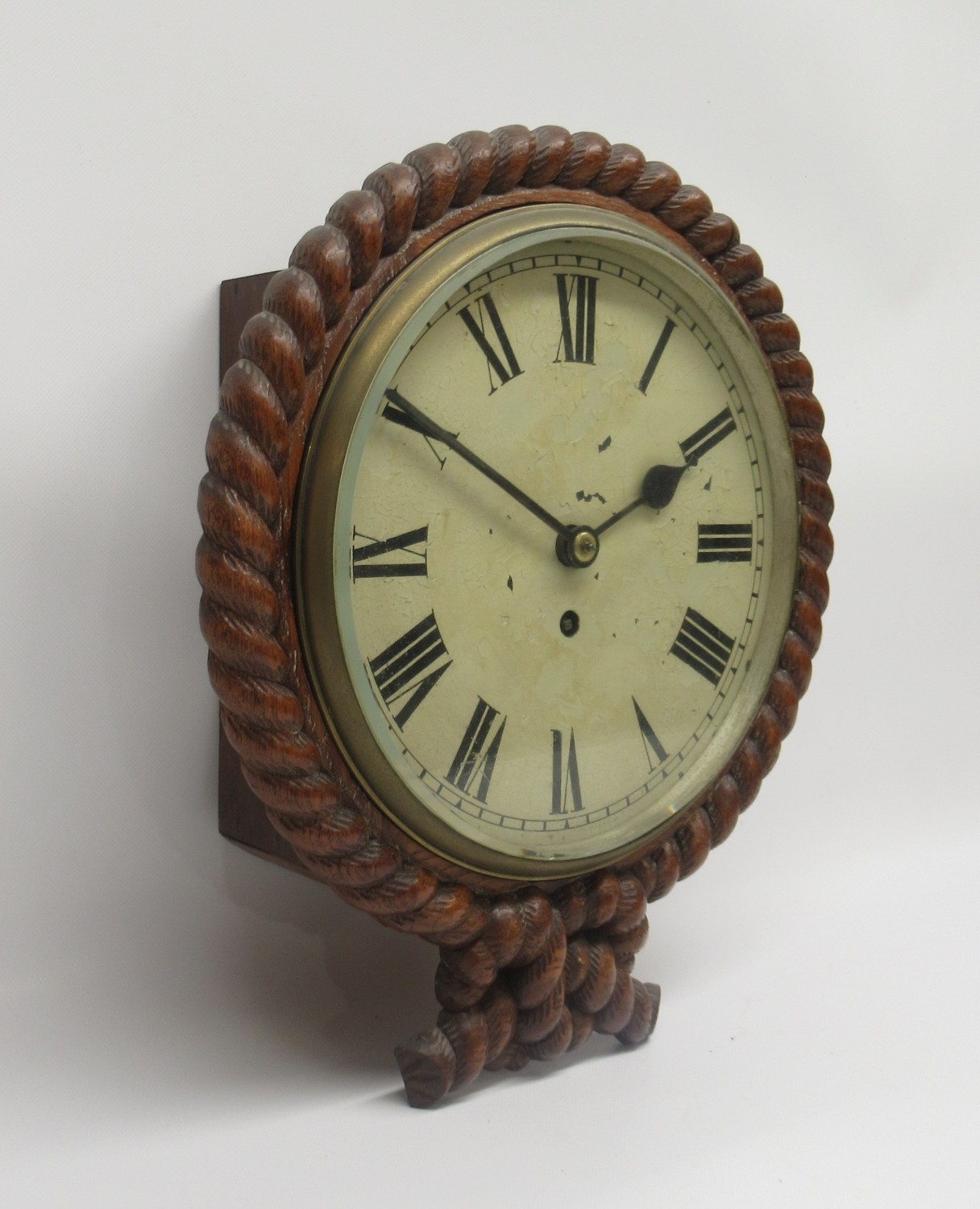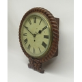 19th Century 8 day oak dial wall clock/timepiece, carved rope twist case with brass bezel enclosing 10" painted Roman dial, single train fusee movement with anchor escapement, no. 3645, D33.5cm