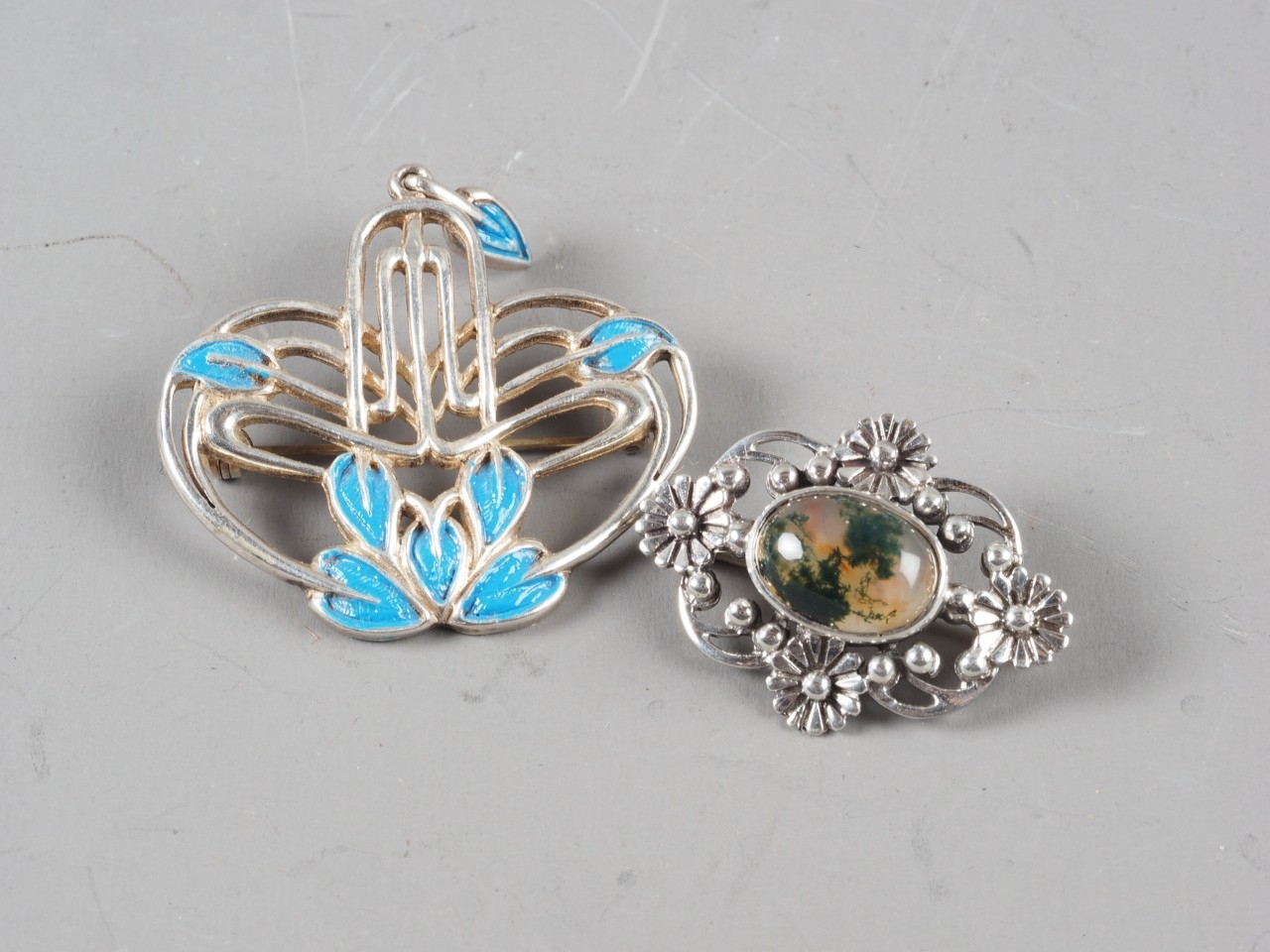 A Scottish silver and blue enamelled brooch with leaf design, and a similar white metal and moss agate set brooch