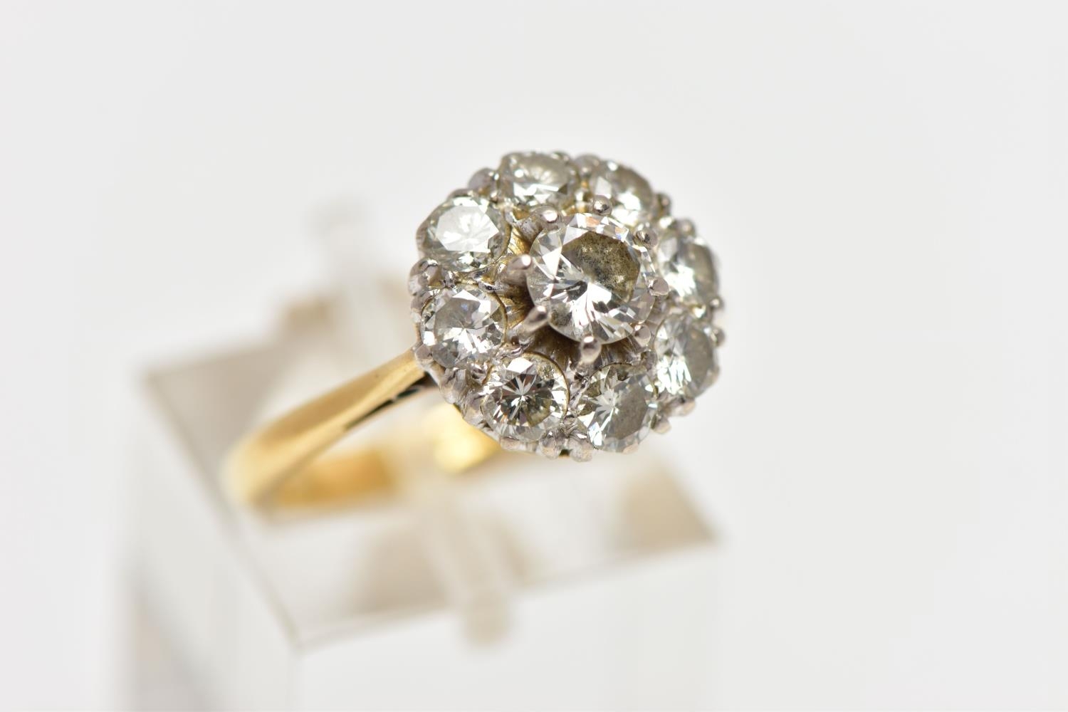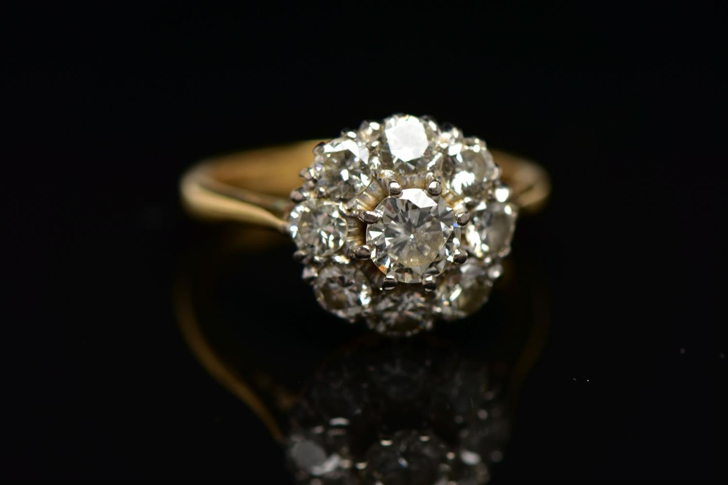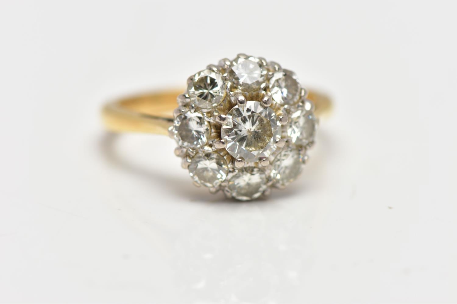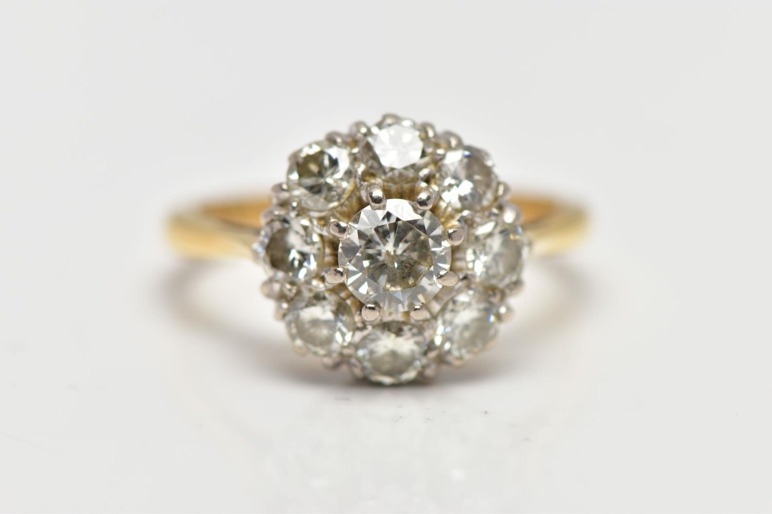A DIAMOND NINE STONE CLUSTER RING, set with a principal round brilliant cut diamond, surrounded by eight round brilliant cut diamonds, estimated total diamond weight 1.55ct, stamped 18ct, INV CXE, approximate ring size N, approximate gross weight 4.72 grams (condition report: overall condition good, diamonds bright and lively)