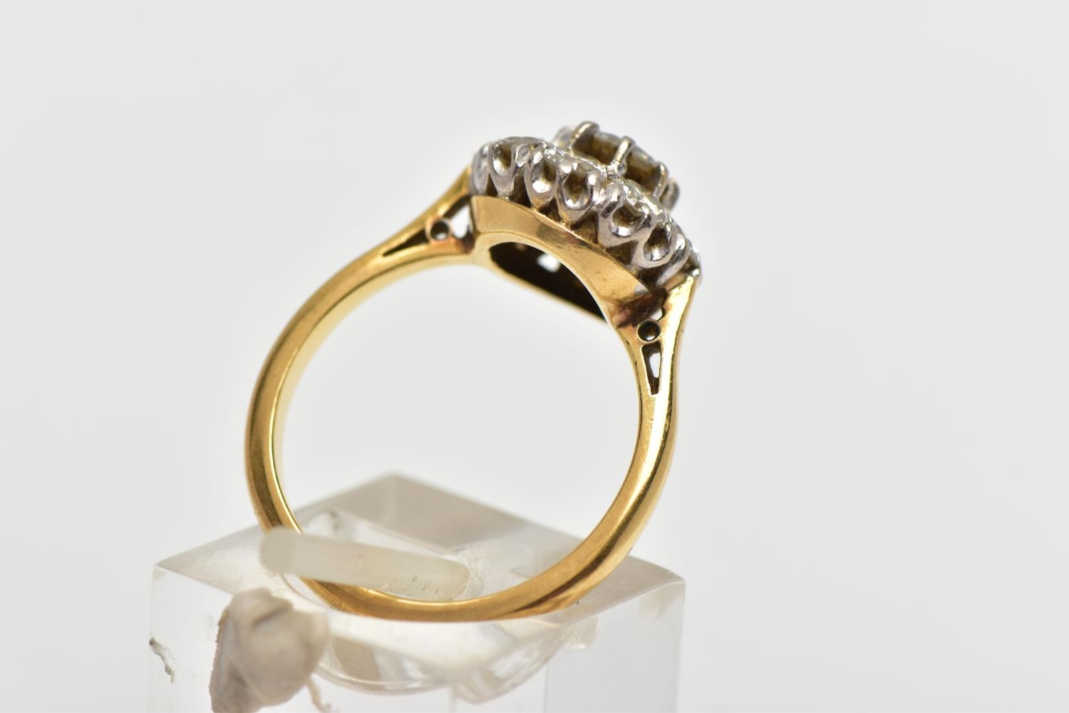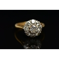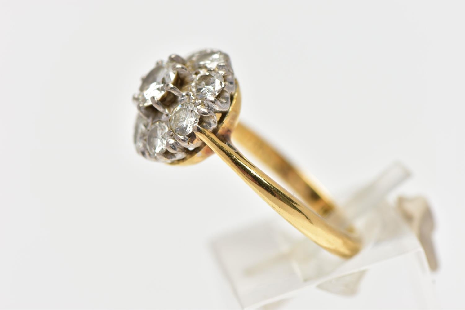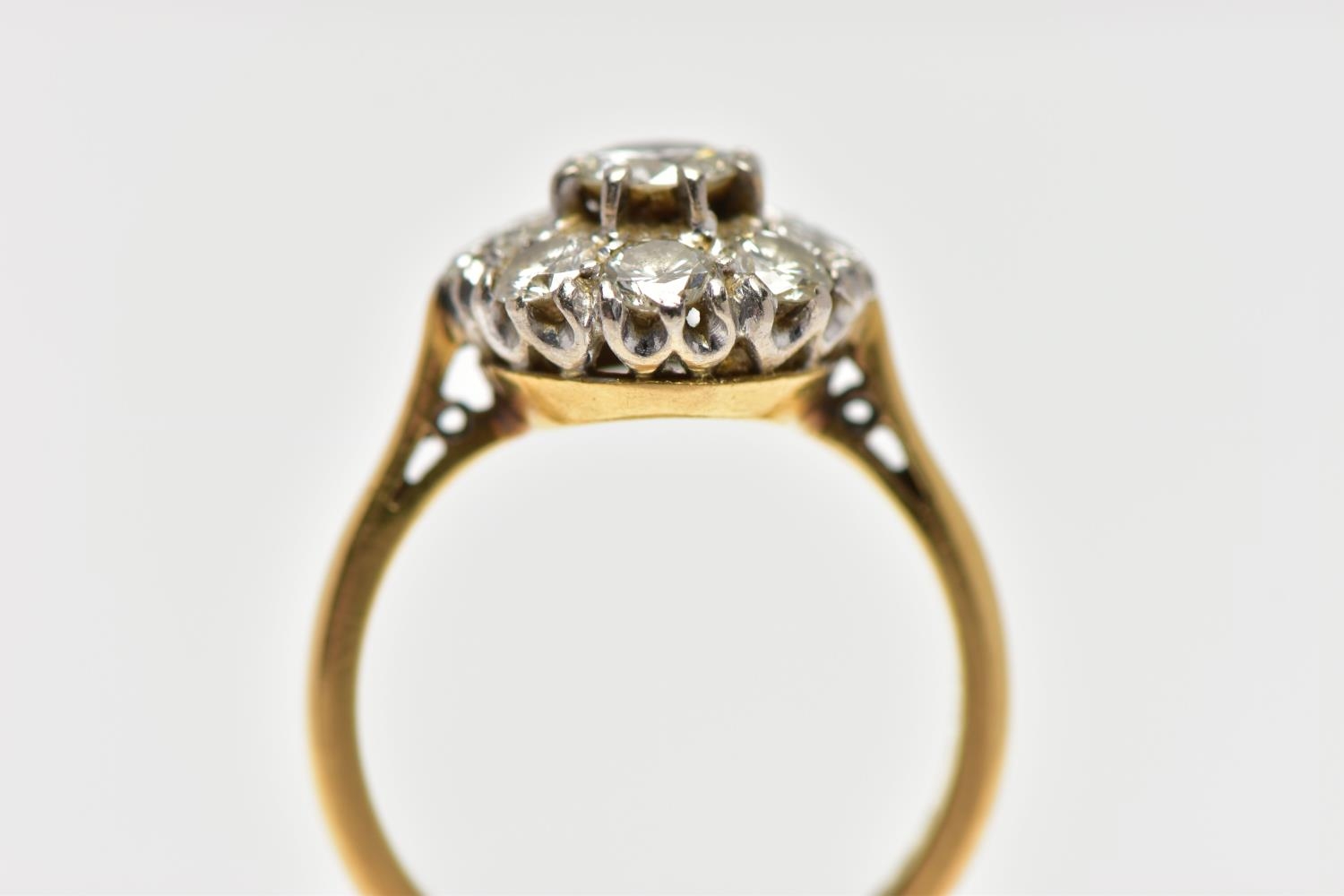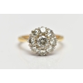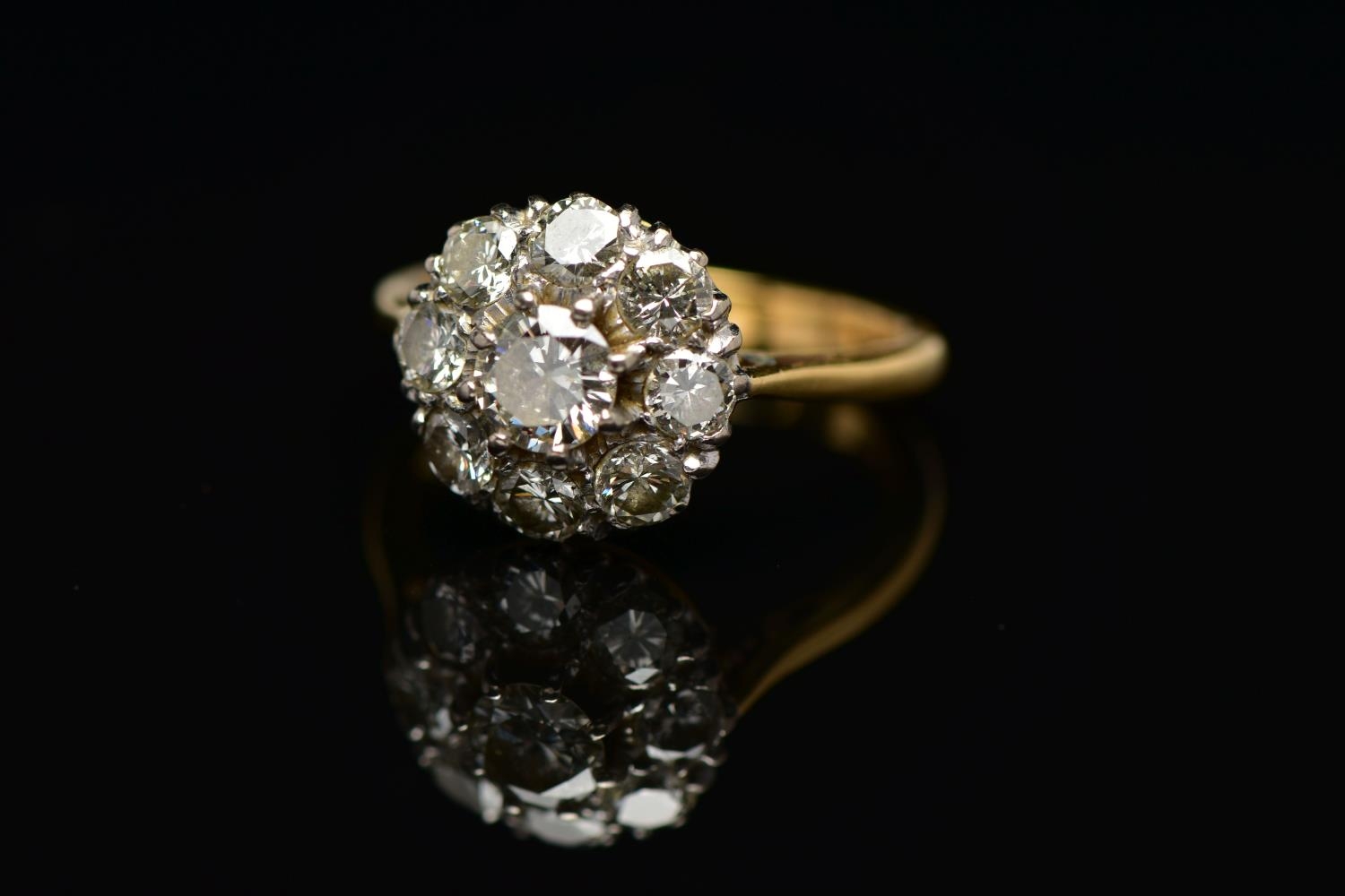 A DIAMOND NINE STONE CLUSTER RING, set with a principal round brilliant cut diamond, surrounded by eight round brilliant cut diamonds, estimated total diamond weight 1.55ct, stamped 18ct, INV CXE, approximate ring size N, approximate gross weight 4.72 grams (condition report: overall condition good, diamonds bright and lively)