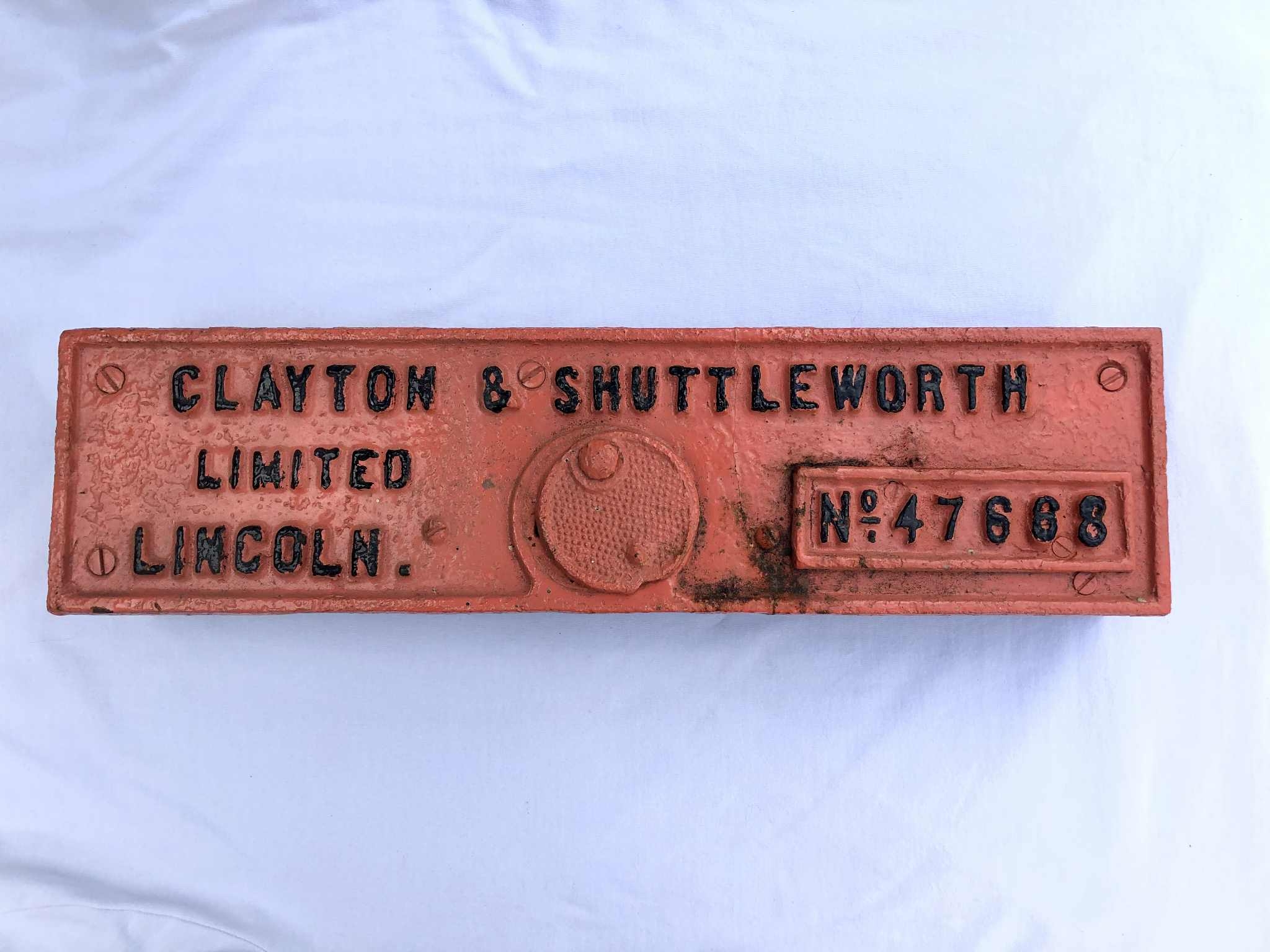 Clayton & Shuttleworth Threshing Machine Makers Plate & Level Gauge No.47668 15 1/4" x 4"