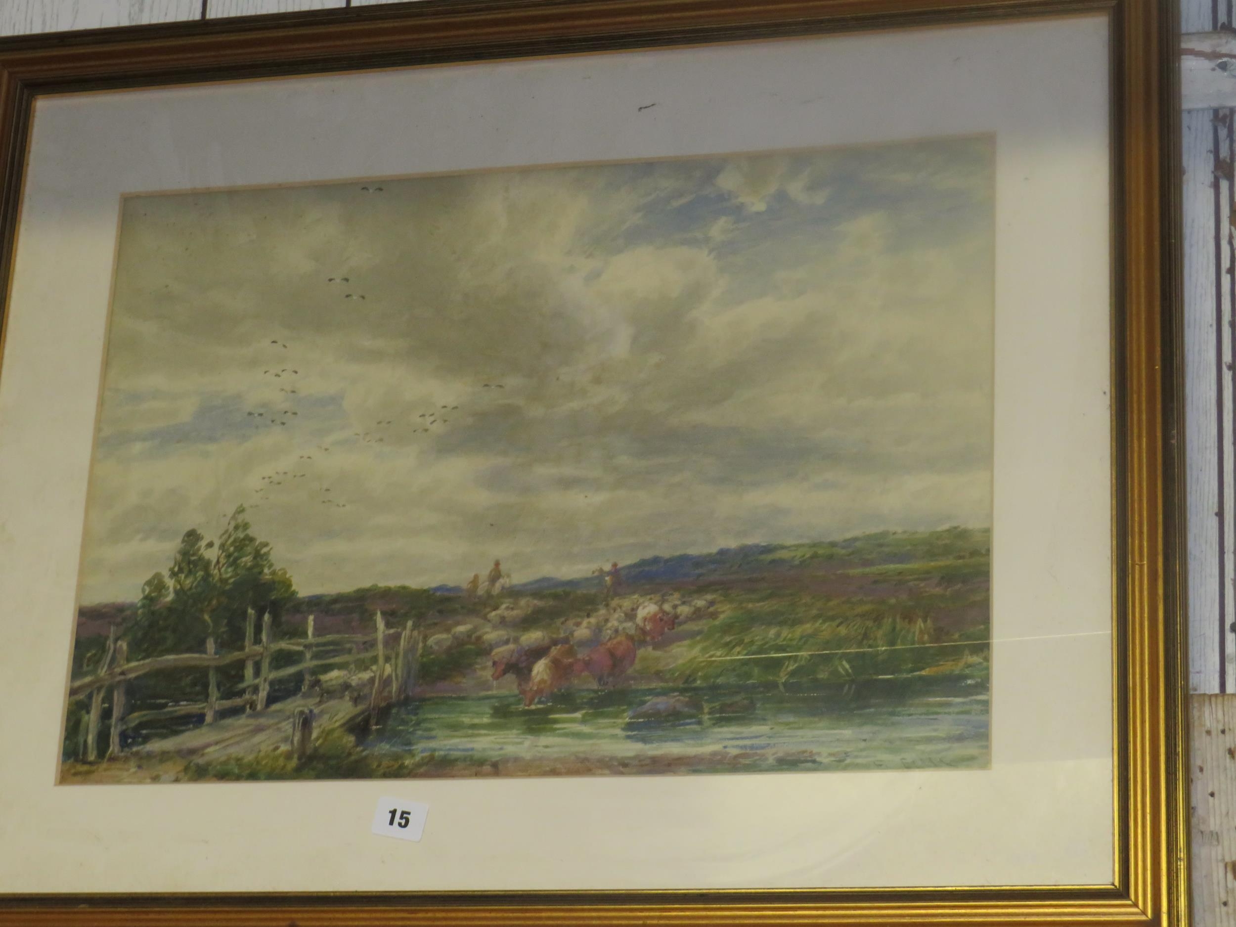 Watercolour Herdsman,cattle & sheep crossing a river 15" x 22"