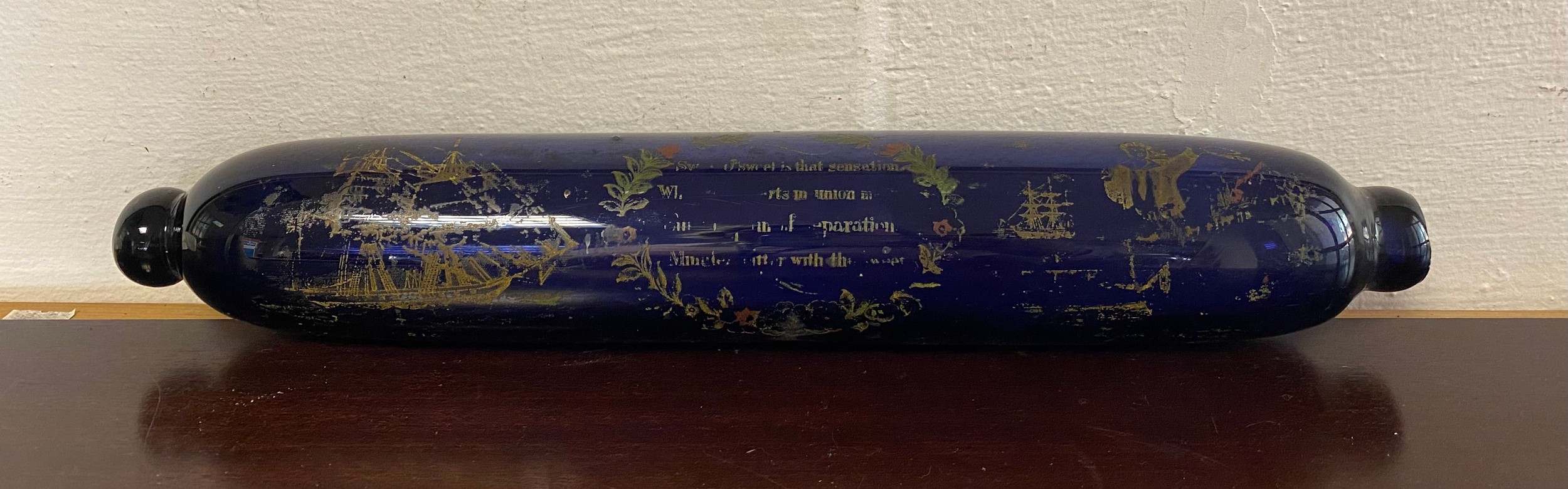 A Nailsea blue glass rolling pin, decorated with verse, sailing ships and sailors (worn) -