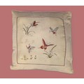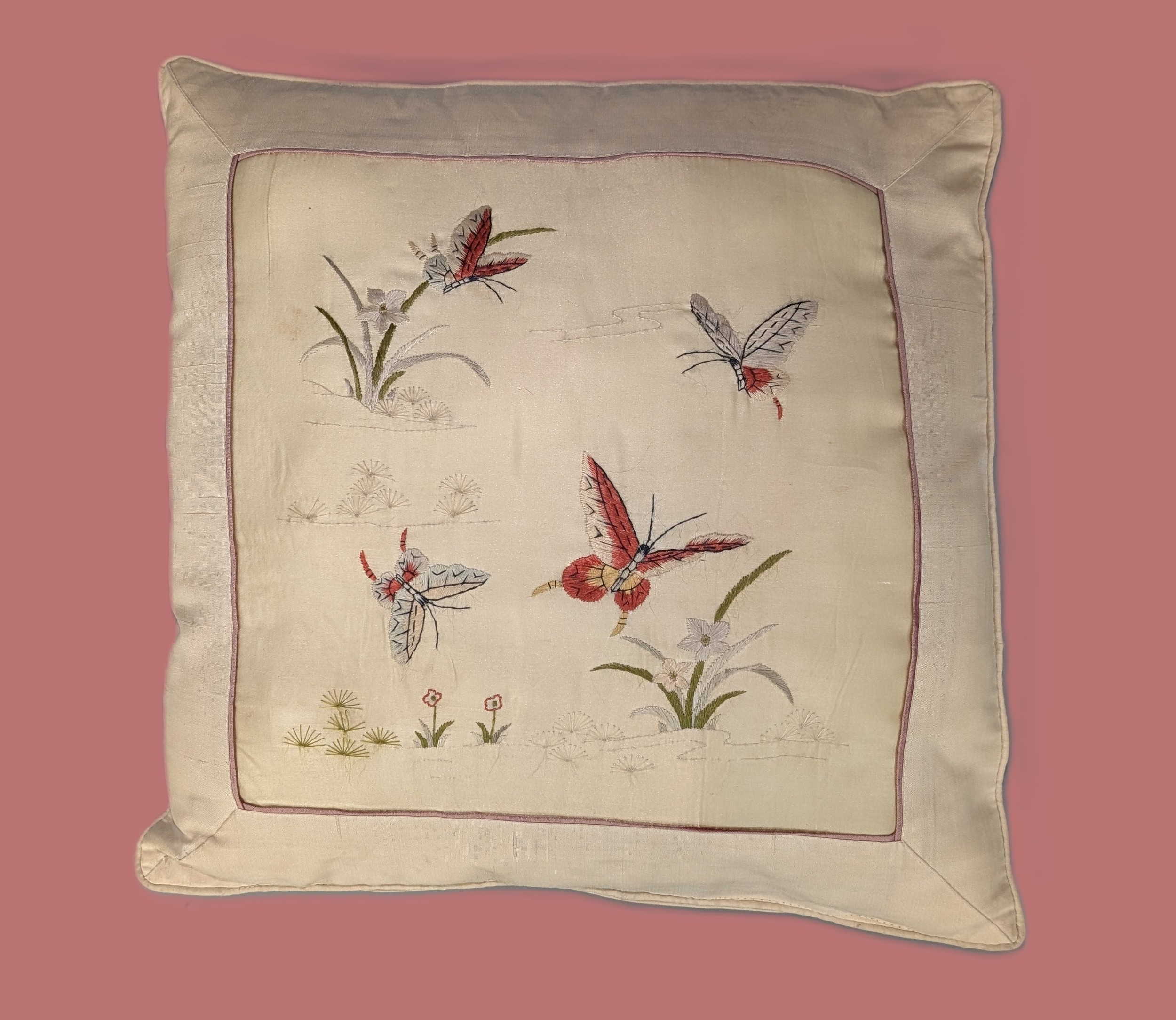 Worked in coloured silks with butterflies and floral sprays within a contrasting border on a pale cream ground, hand-embroidered on silk satin. largest 46 x 30cm