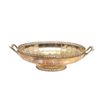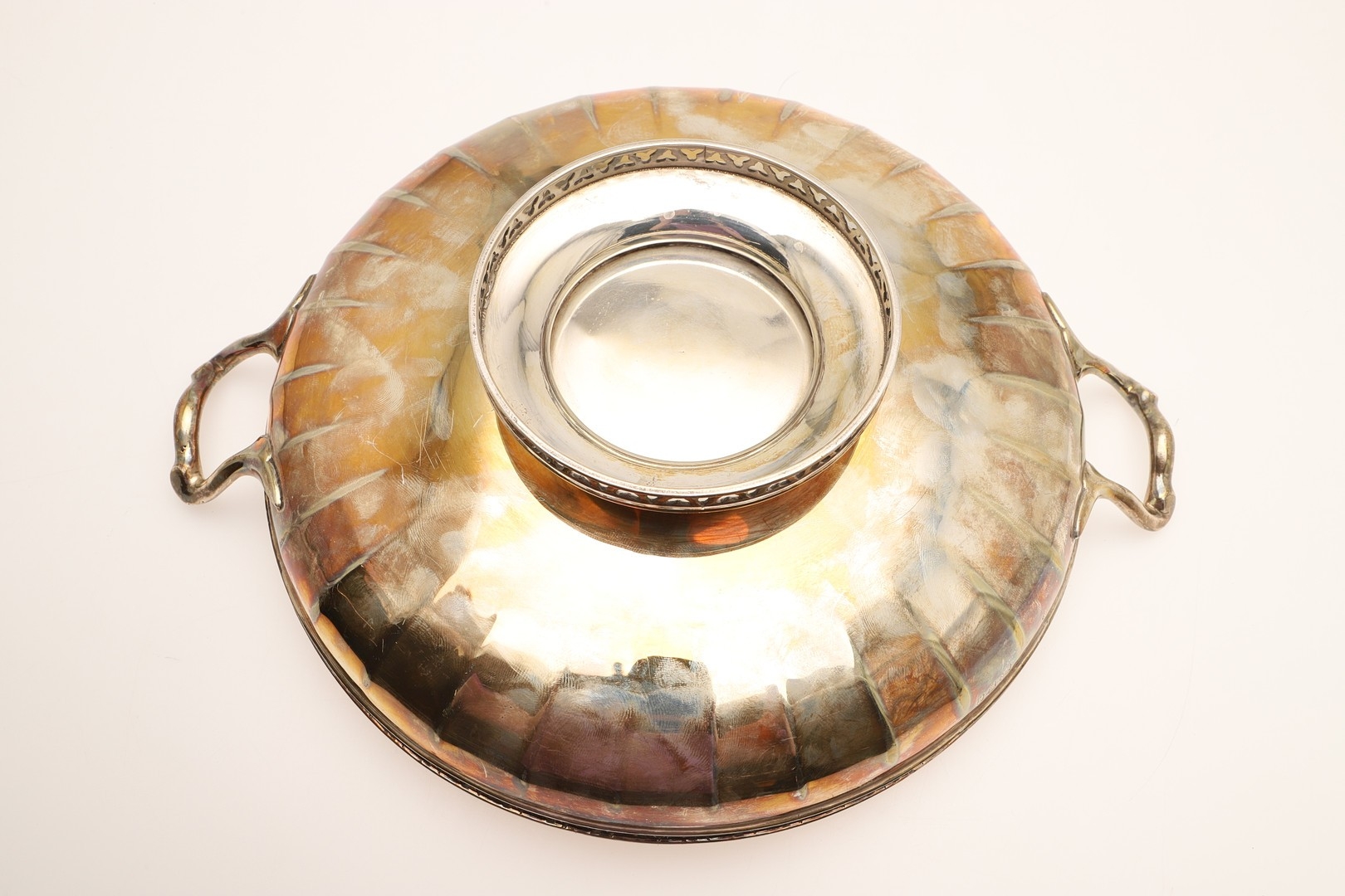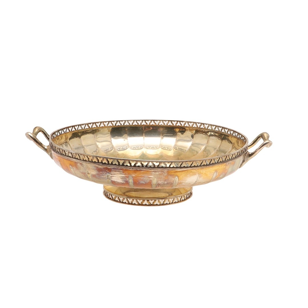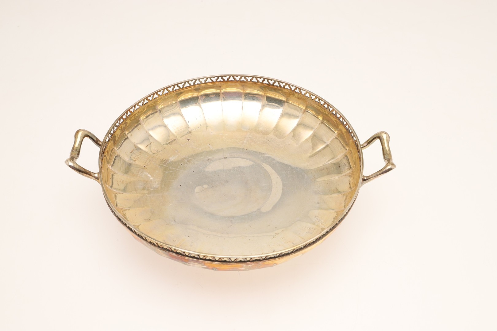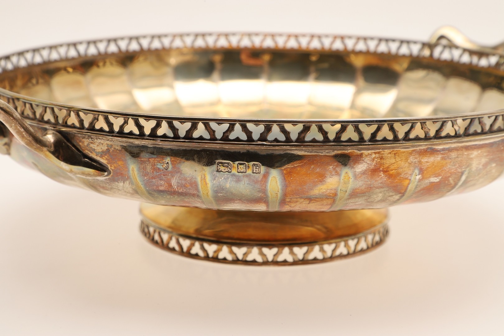 A GEORGE V SILVER TWIN HANDLED PEDESTAL BOWL. With pierced decoration to the rim and bottom of the pedestal, Height 7cm x Diameter 28cm. Hallmarked Edward Barnard & Sons Ltd, London, 1925. Weight 18.5ozt.