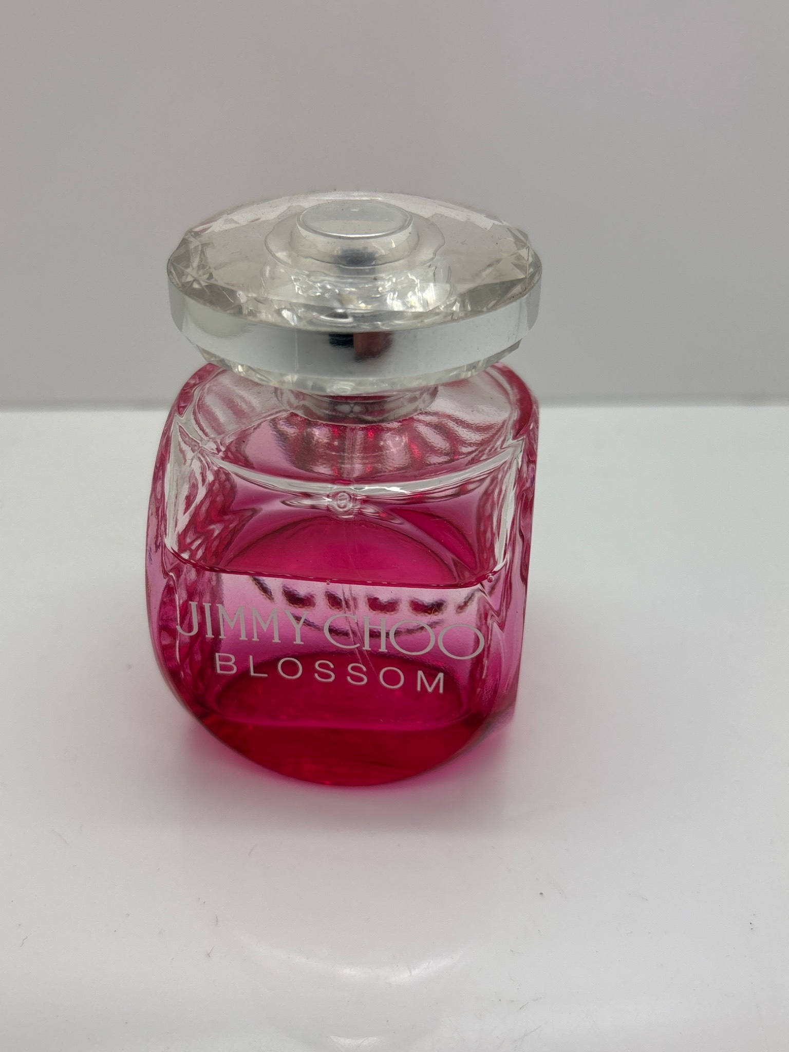 Jimmy Choo Blossom perfume bottle featuring pink liquid.