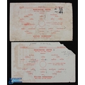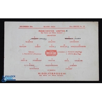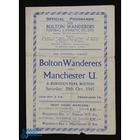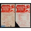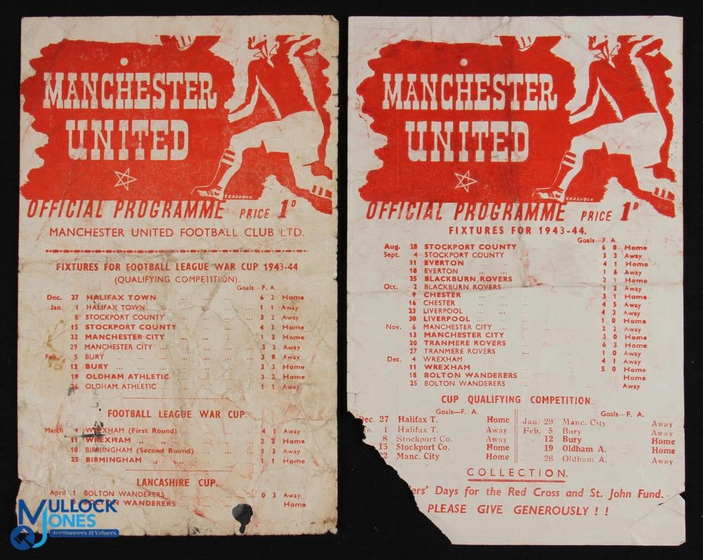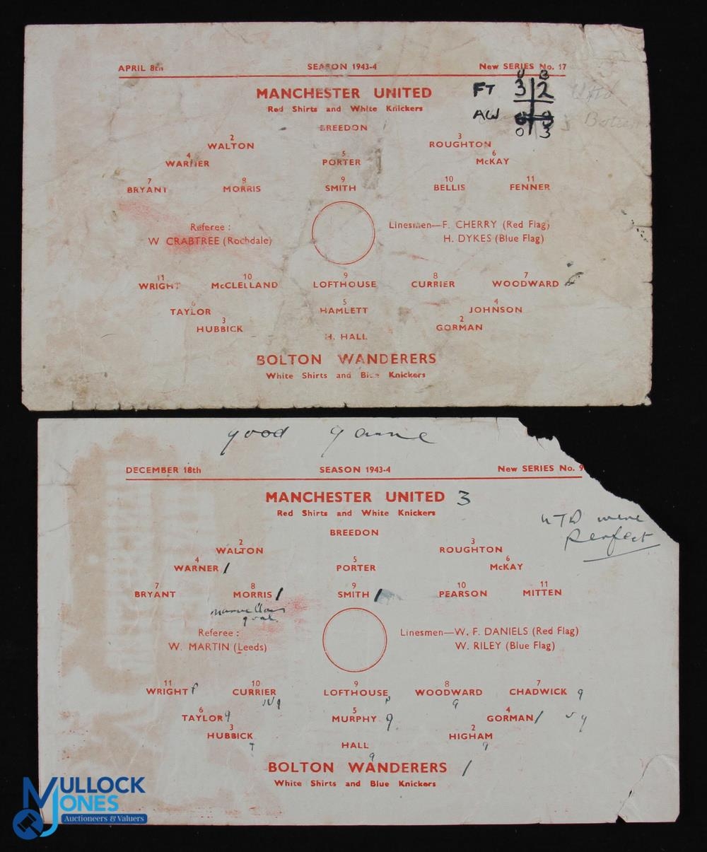 1943/44 War League North Manchester Utd v Bolton Wanderers 18 December 1943 single sheet (corner tear/paper loss, score(ers) and small writing); 1943/44 Lancashire Cup Manchester Utd v Bolton Wanderers 8 April 1944, single sheet (score noted), general wear. (2)