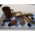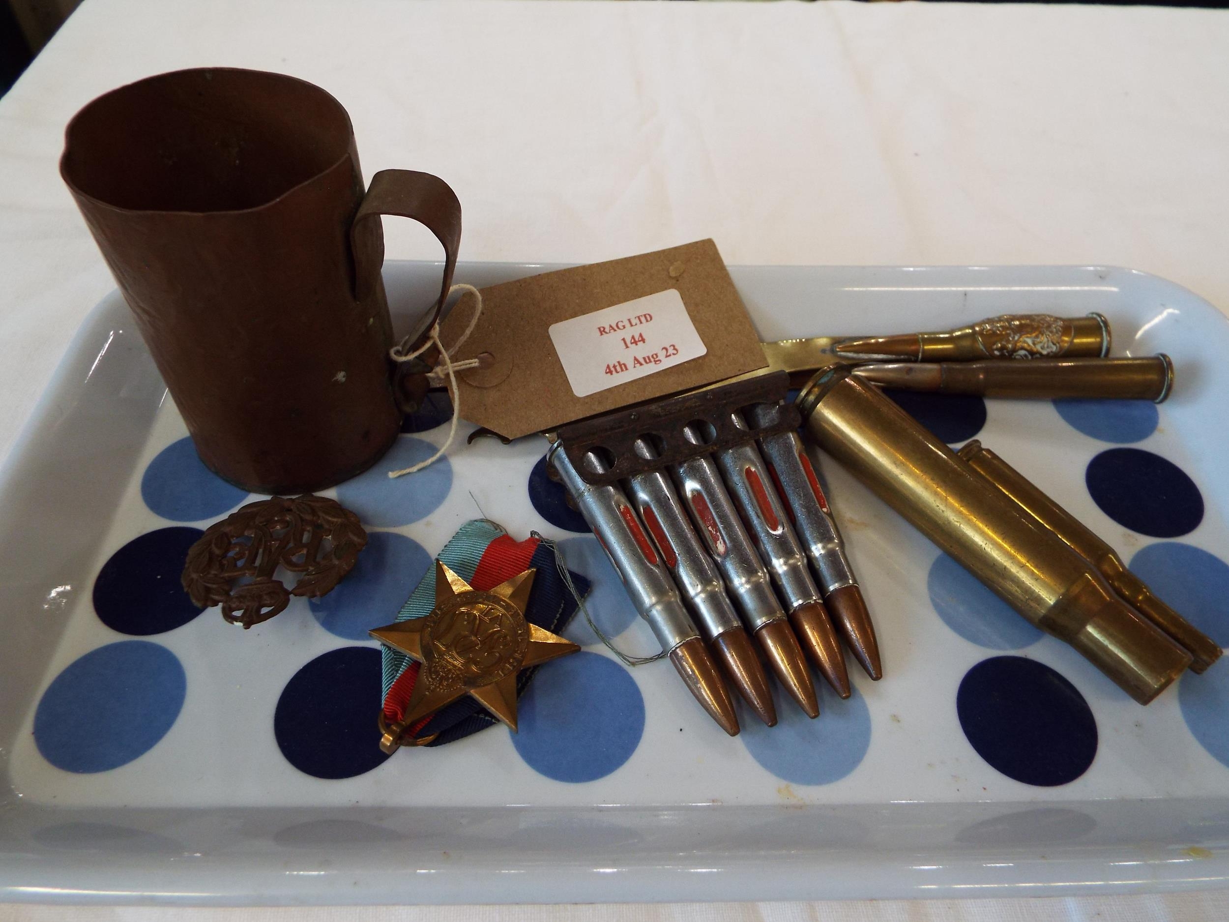 A selection of trench art to include knives, beaker, cap badge, 1939-45 Star