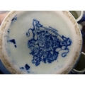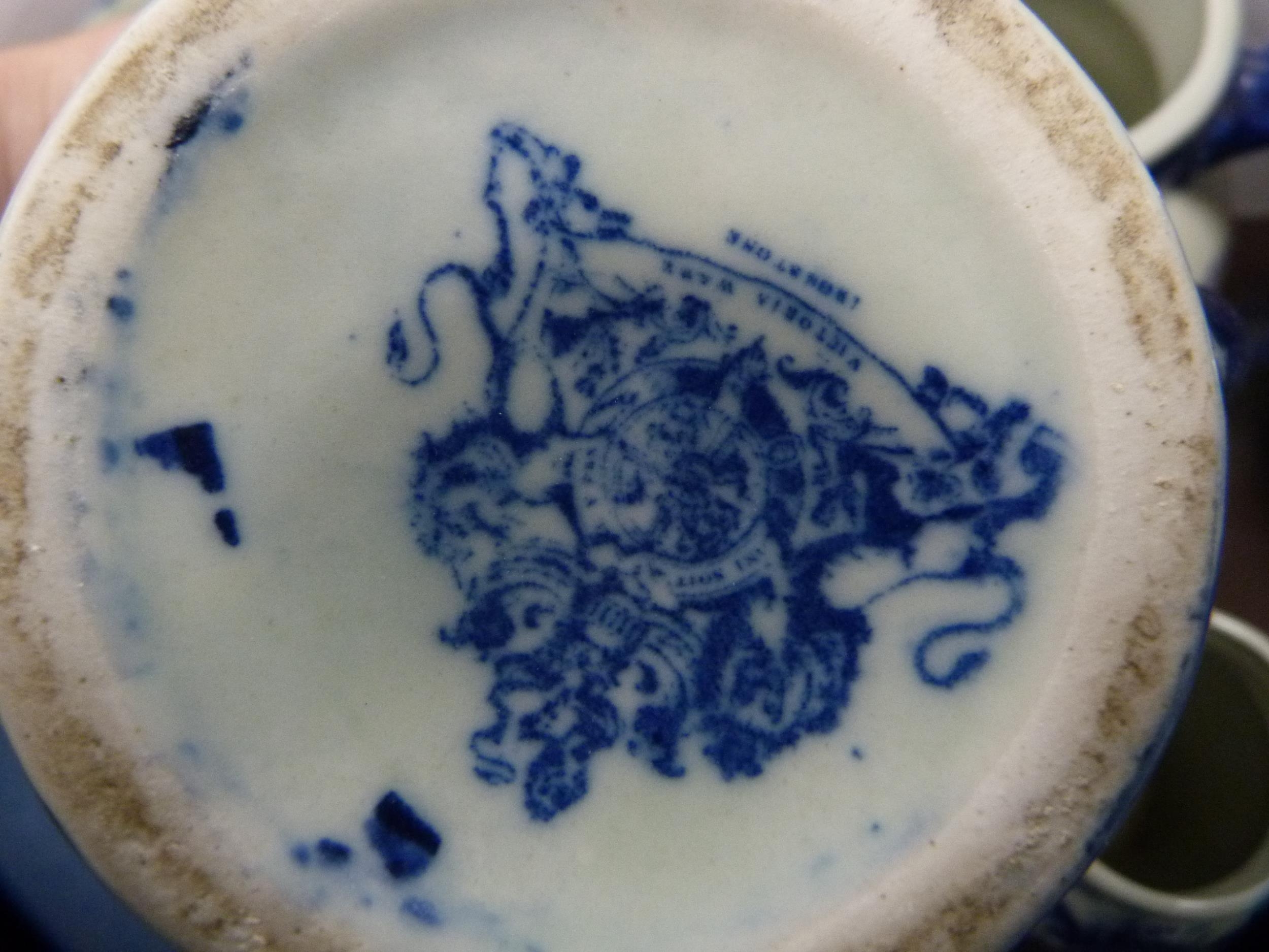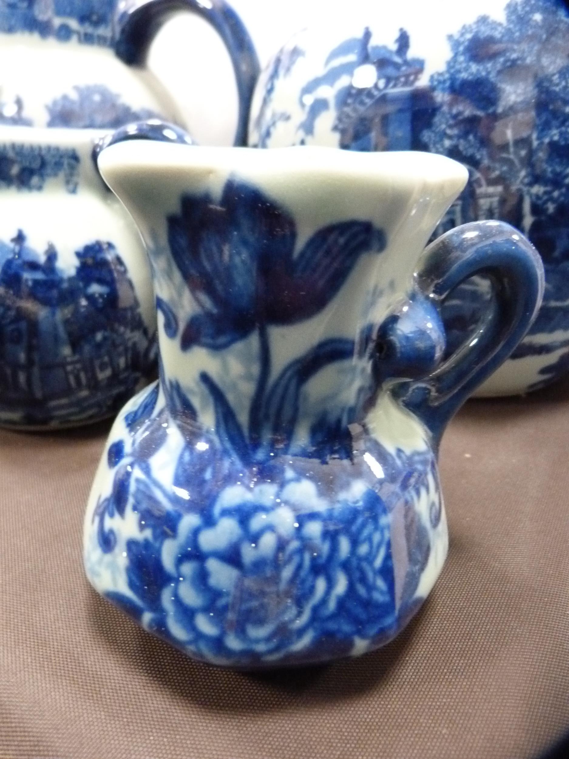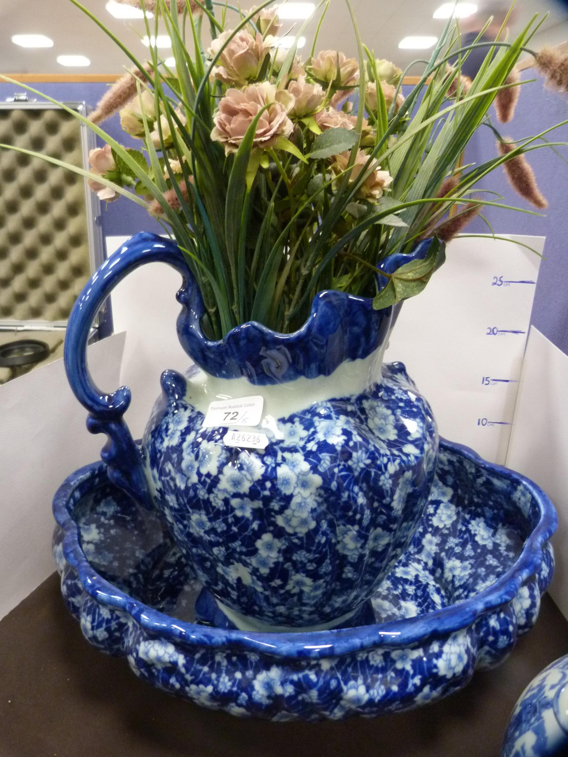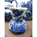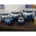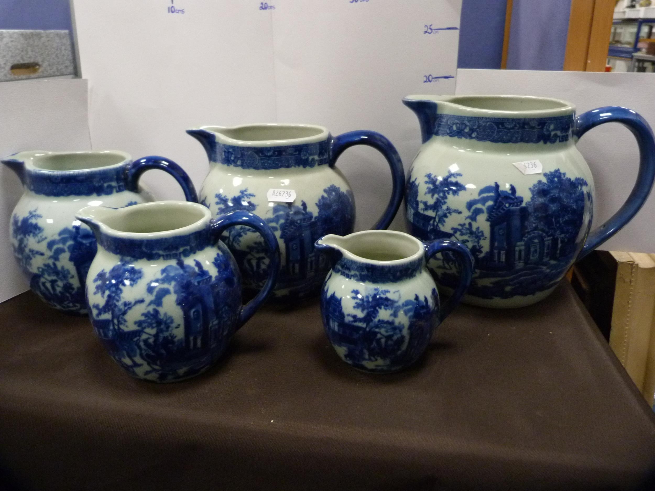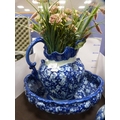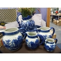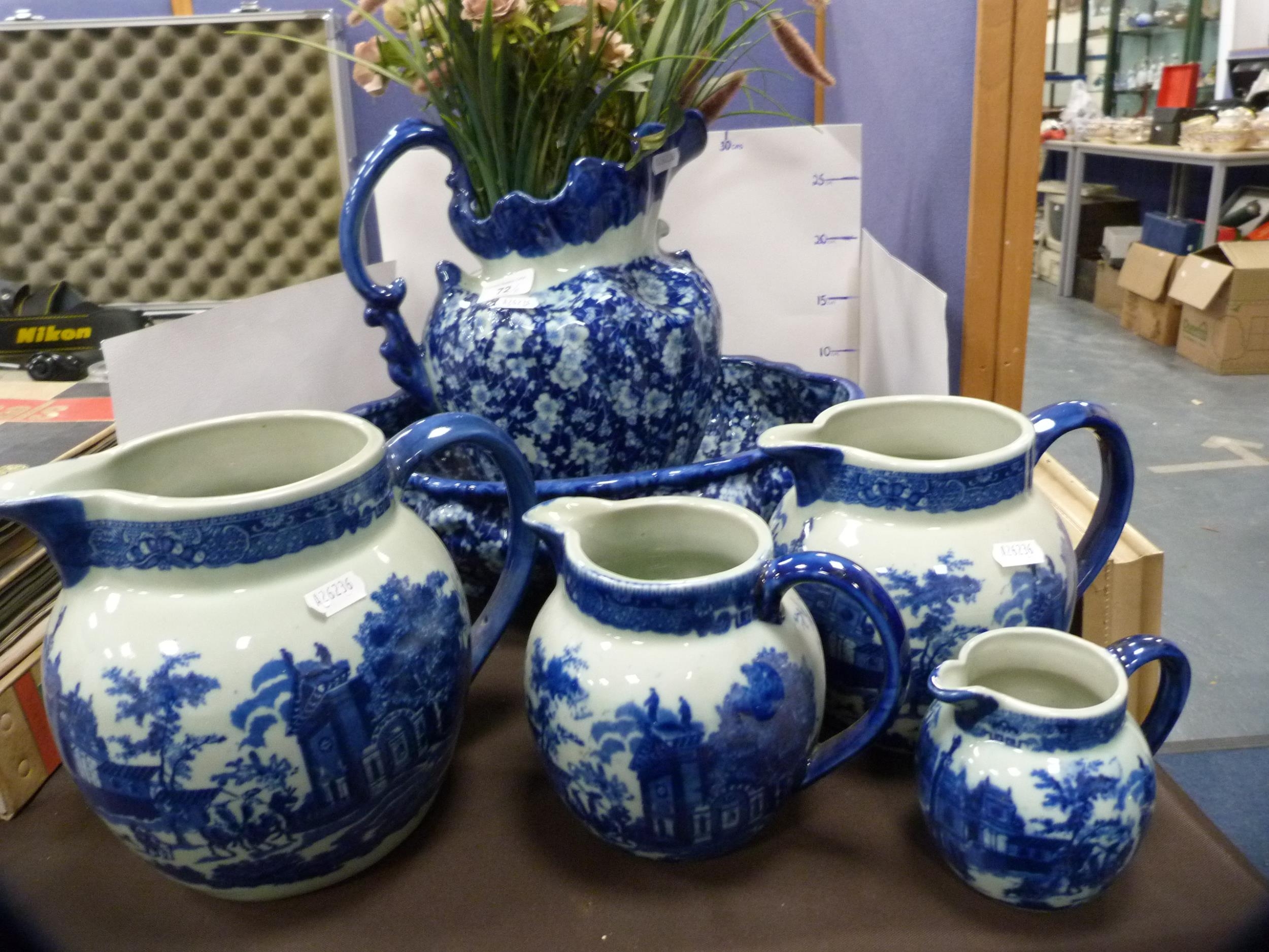 Reproduction blue and white ceramic toilet ewer and basin, and a set of reproduction graduated jugs.
