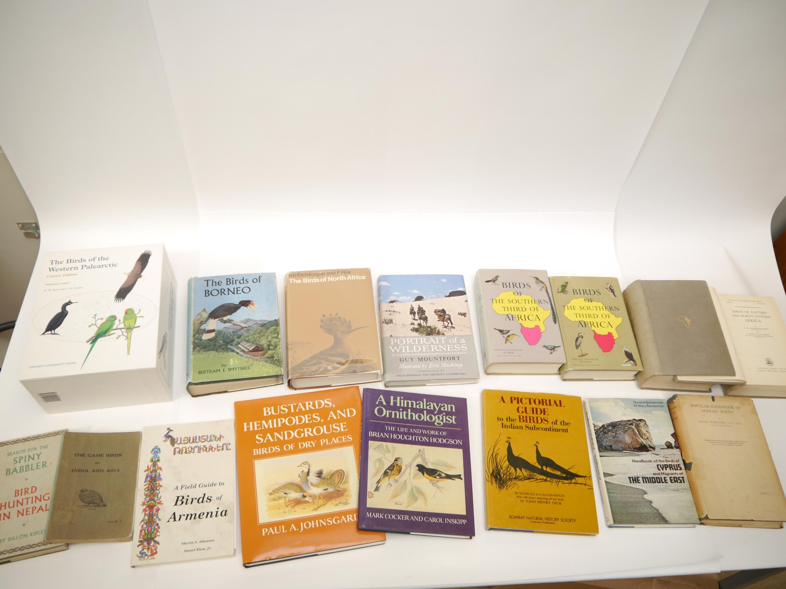 (Ornithology, Birds), Mackworth-Praed & Grant: 'African Handbook of Birds - Birds of Eastern and North Eastern Africa; Birds of the Southern Third of Africa', L, Longmans, 1952-1963, 1st editions, 4 volumes, uniform original cloth gilt, 2nd series vols 1 & 2 in dust wrappers; Snow & Perrins et al: 'The Birds of the Western Palearctic', O.U.P., 1998, concise edition, 2 volumes, orig. cloth, dust wrappers, slipcase; Smythies: 'The Birds of Borneo', 1960, 1st edition, orig. cloth, dust wrapper, compliment slip of the State Financial Officer of Brunei loosely inserted; Etchecopar and Hue: 'The Birds of North Africa', 1967, 1st English edition, orig. cloth, d/w; Gut Mountfort; Eric Hosking (illustrated): 'Portrait of a Wilderness', 1958, 1st edition, orig. cloth, d/w; David & W. Mary Bannerman: 'Handbook of the Birds of Cyprus and Migrants of the Middle East', 1971, 1st edition, orig. cloth, d/w; Hugh Whistler: 'Popular Handbook of Indian Birds', 1928, 1st edition, orig. cloth, dust wrapper (worn with losses); Johnsgard: 'Bustards, Hemipodes, and Sandgrouse: Birds of Dry Places', 1991, orig. cloth gilt, dust wrapper; plus 5 others similar (17)