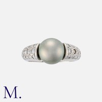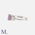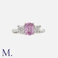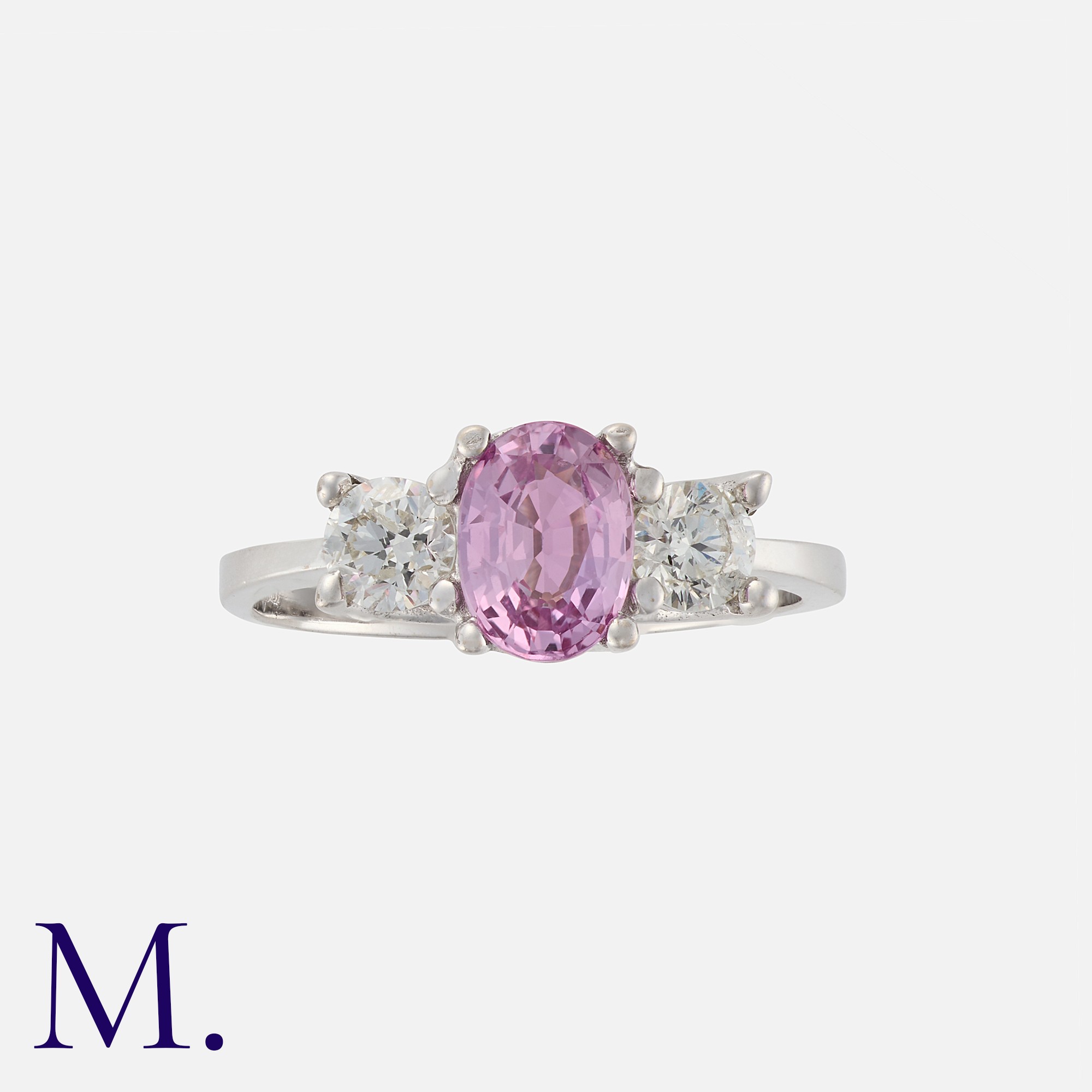 A Pink Sapphire and Diamond Ring in 18K white gold, set with an oval cut pink sapphire weighing approx. 0.90ct with round brilliant cut diamonds either side weighing approx. 0.20ct each.