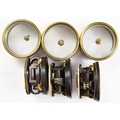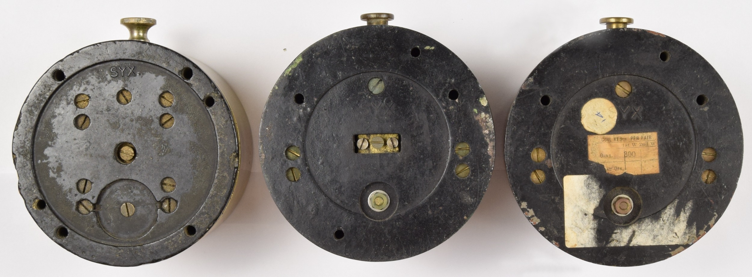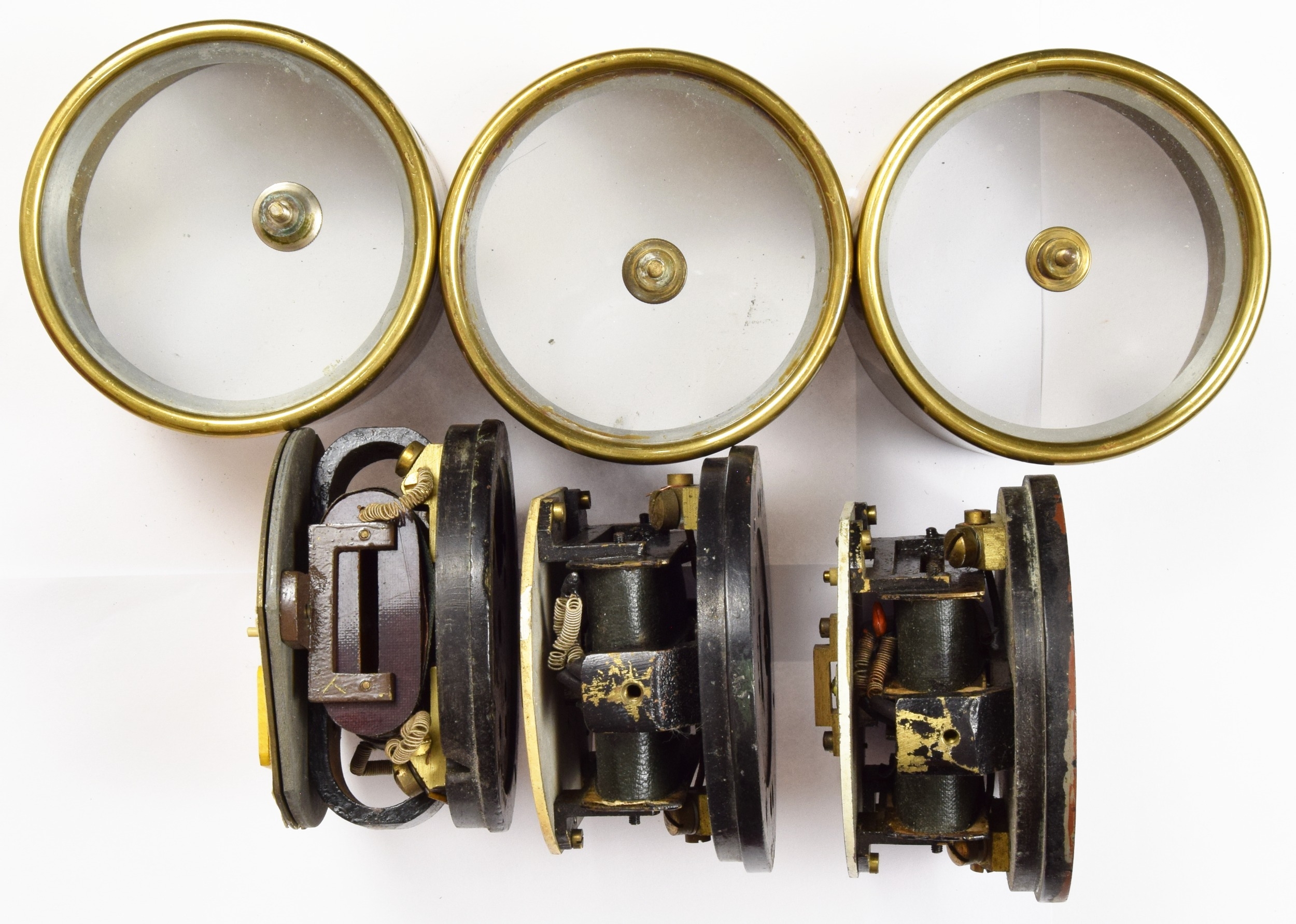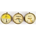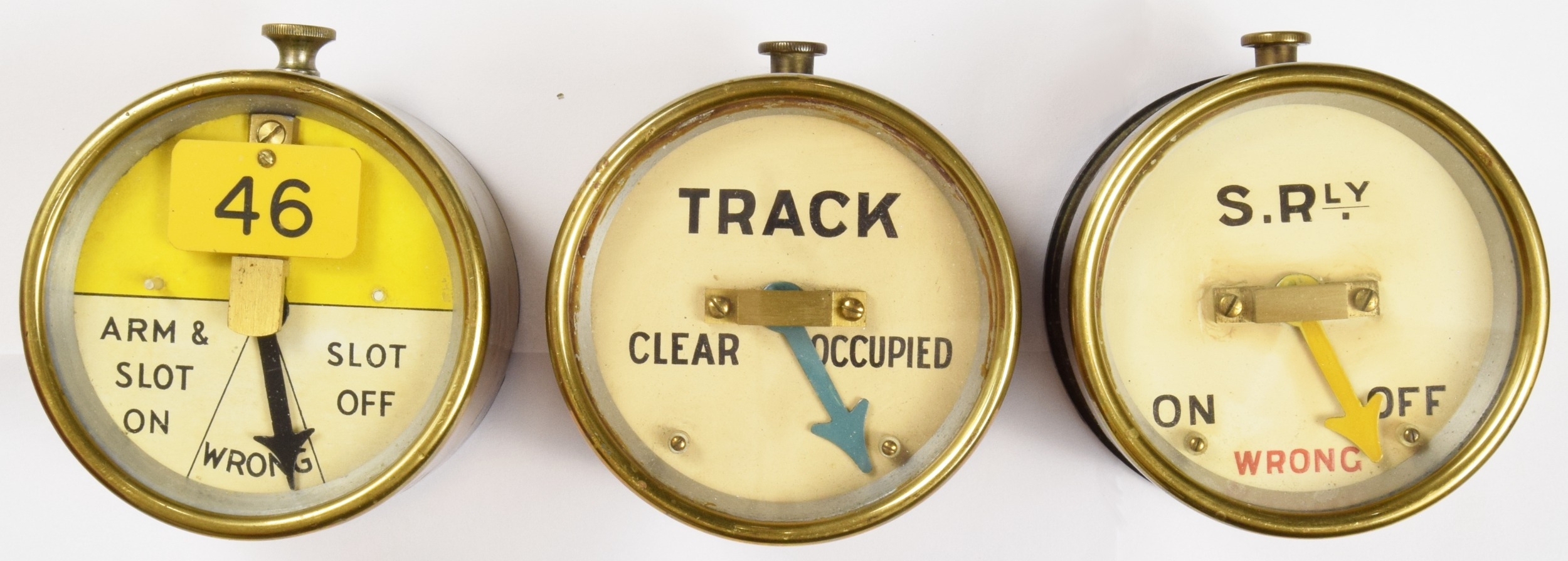 Repeaters x 3, brass cased SYX markings; ARM & SLOT ON/ WRONG/ SLOT OFF, needle is not free moving, SRLY ON/ WRONG/ OFF, needle is free moving, TRACK CLEAR/ OCCUPIED, needle free moving. All 4 inch diameter. Shipping band - B.
