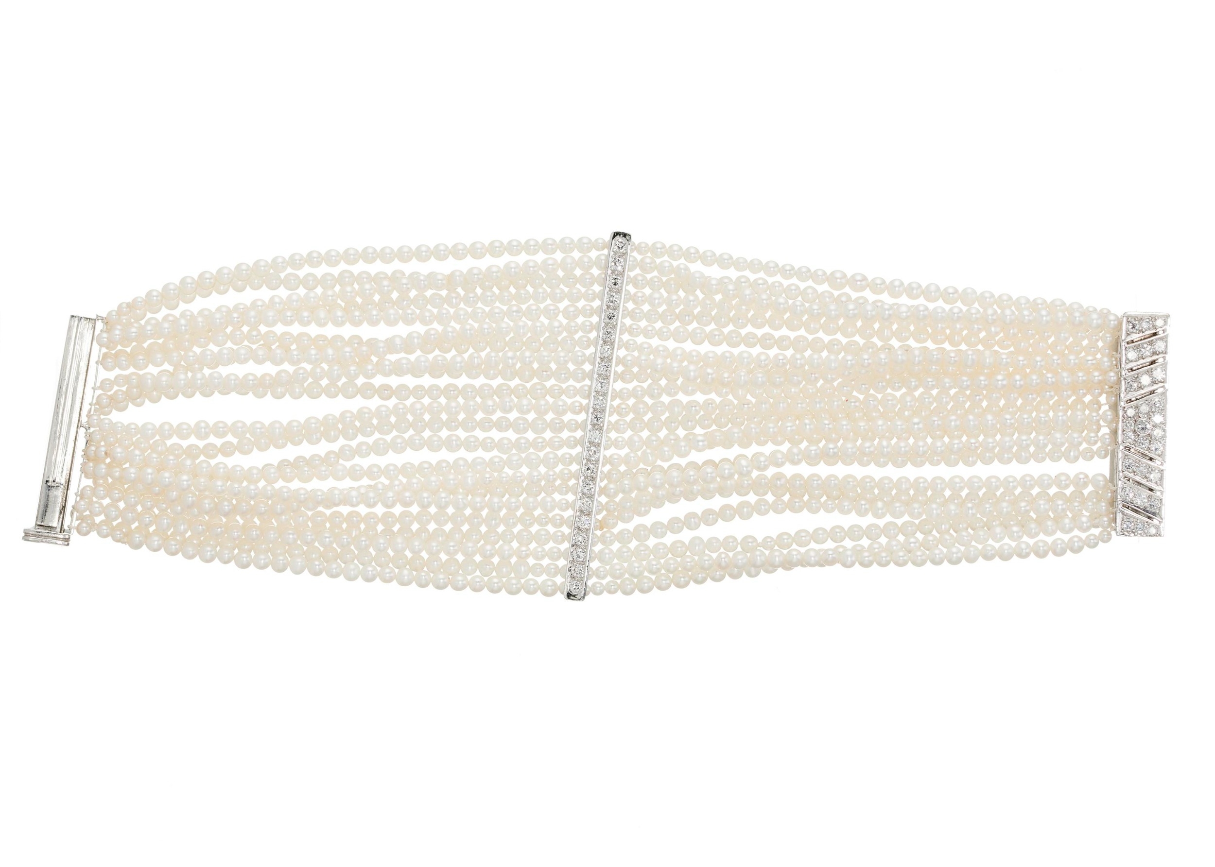 Overall good condition Mostly small marks and minor scratches in keeping with age and general wear Diamonds are well matched, lively and bright Cultured pearls are a well matched, slightly creamy white hue, with good lustre Cultured pearls are in overall good condition, with small abrasions and typical surface blemishes Pearls measure approximately from 3.8mm to 2.5mm Width of central panel approximately 6.6cm Clients are advised to view and inspect items before bidding and they must satisfy themselves as to the condition of every lot For enquiries about this lot please contact David Pregun at david@kinghamsauctioneers.com