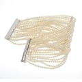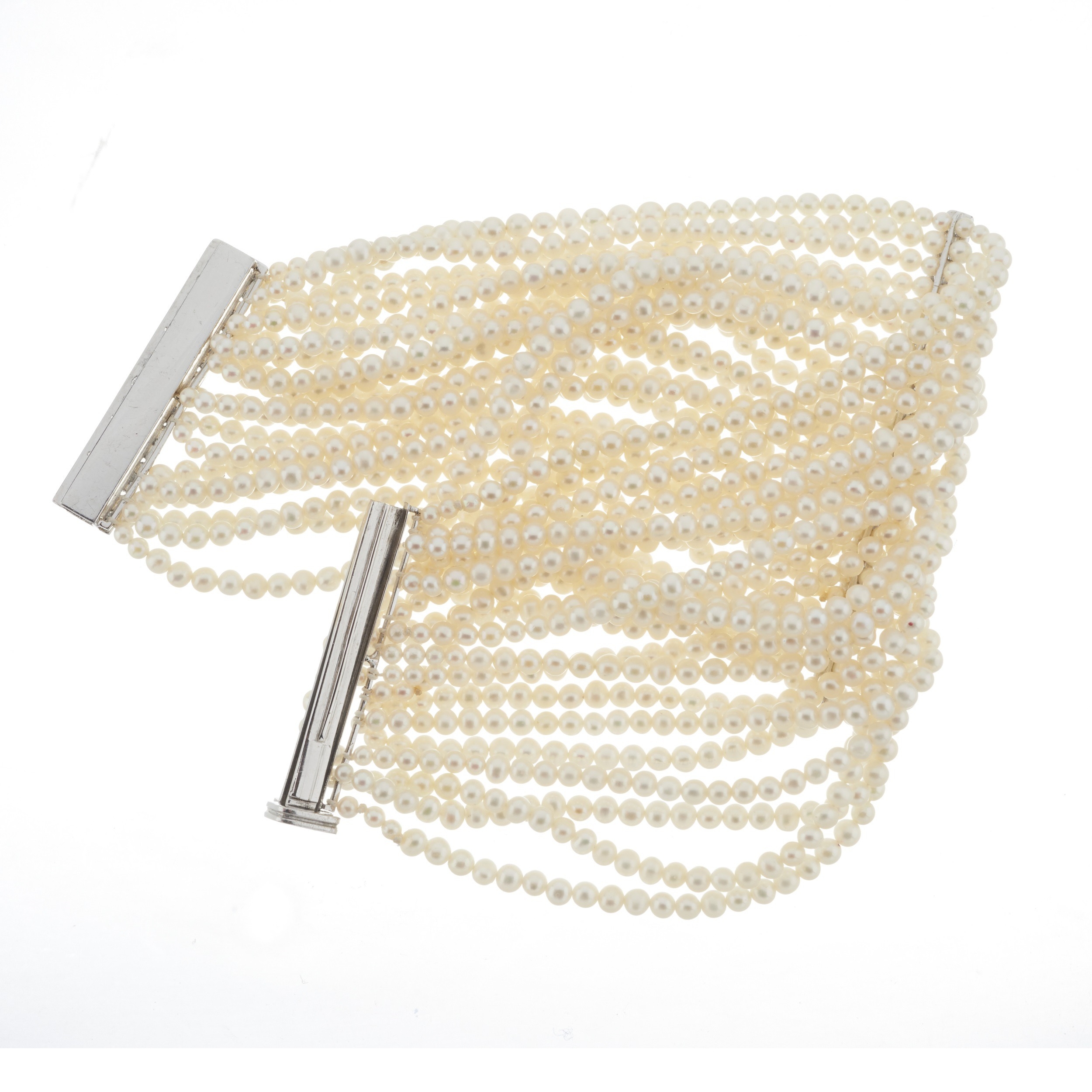 An 18ct gold slightly graduated cultured pearl multi-row bracelet, with brilliant-cut diamond sliding clasp and similarly-cut diamond line central panel, estimated total diamond weight 2ct, H-I colour, VS2-SI clarity, clasp stamped 750, Greek maker's mark, length 19cm, 79.7g
