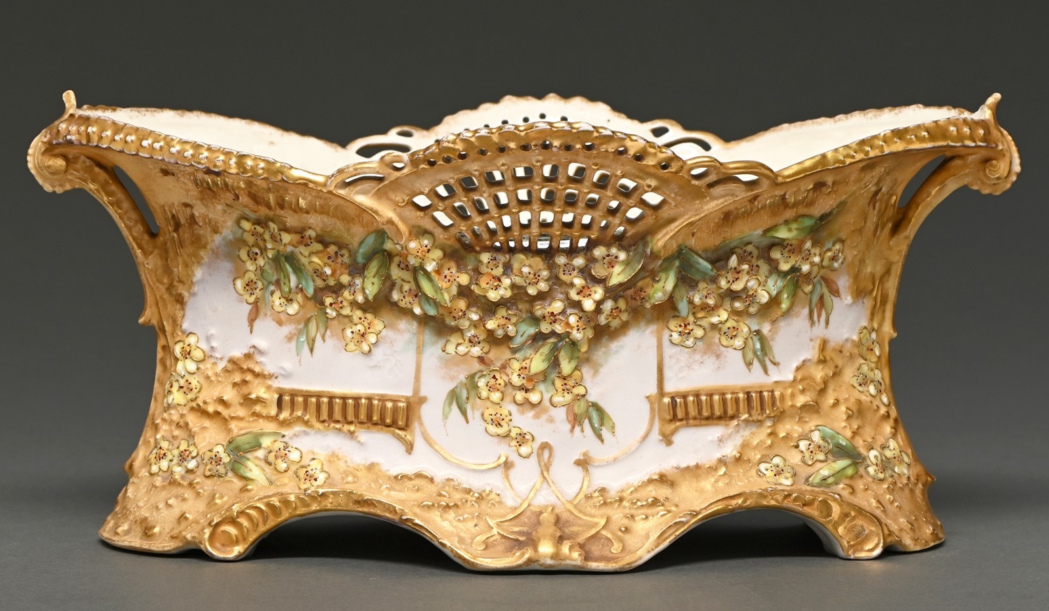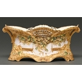 An Ernst Wahliss moulded bough pot, c1900, with gilt pierced rim and painted with yellow flowers, the interior with metal flower stand, 37cm w, printed and impressed mark