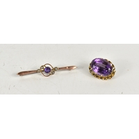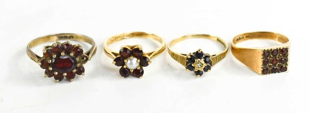 Three 9ct gold rings, two set with garnet, one with sapphires in flowerhead form, 5.2g, and a silver ring.
