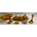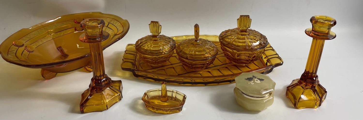 Amber Glass Dressing Table Set in Art Deco Date-Lined Glass (C.1910-C.1939) dressing table set to include 2 candlesticks (16cm tall approx.), a ring holder, 3 trinket dishes (one needs repair), all on a plate 35cm approx. plus an amber glass bowl on 4 legs.