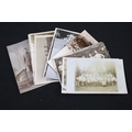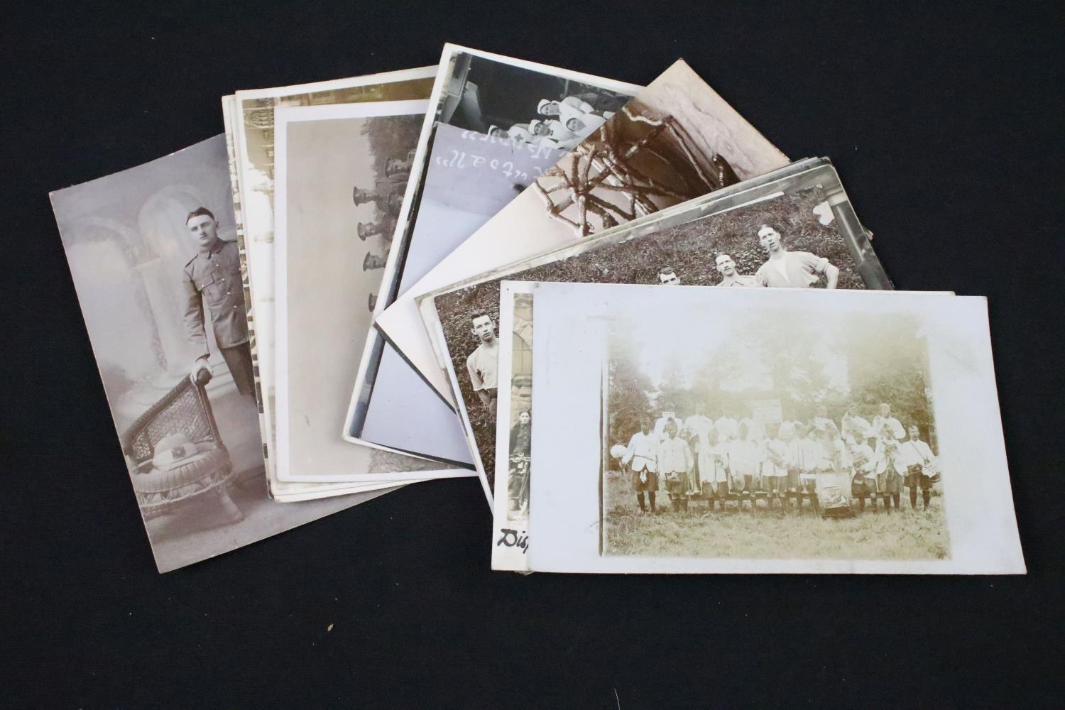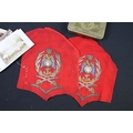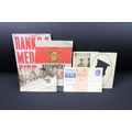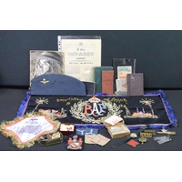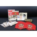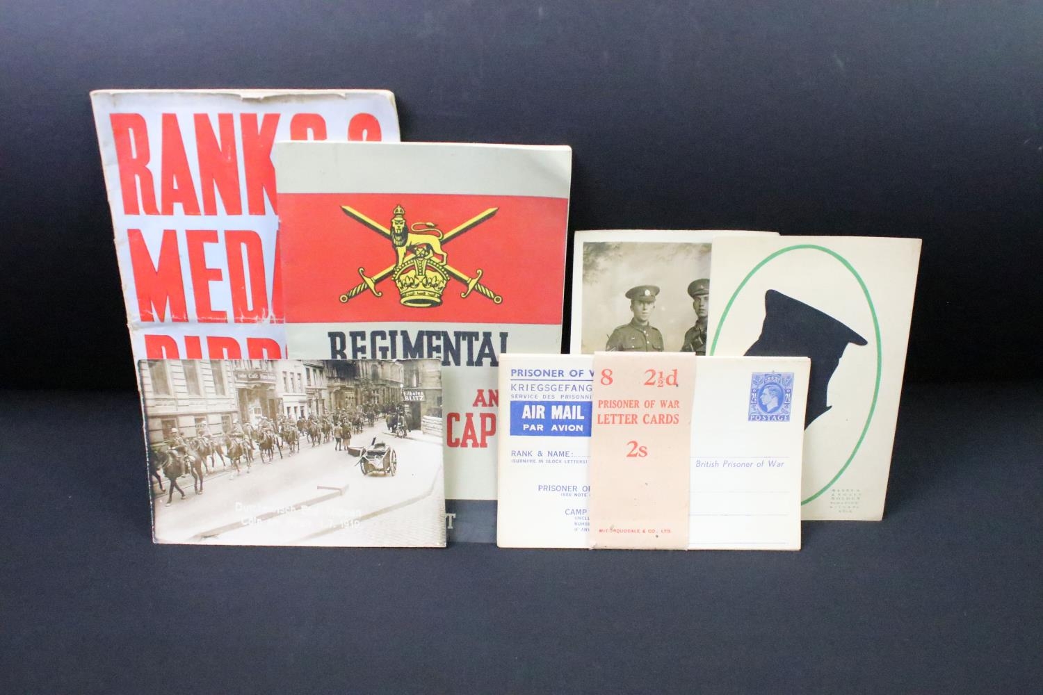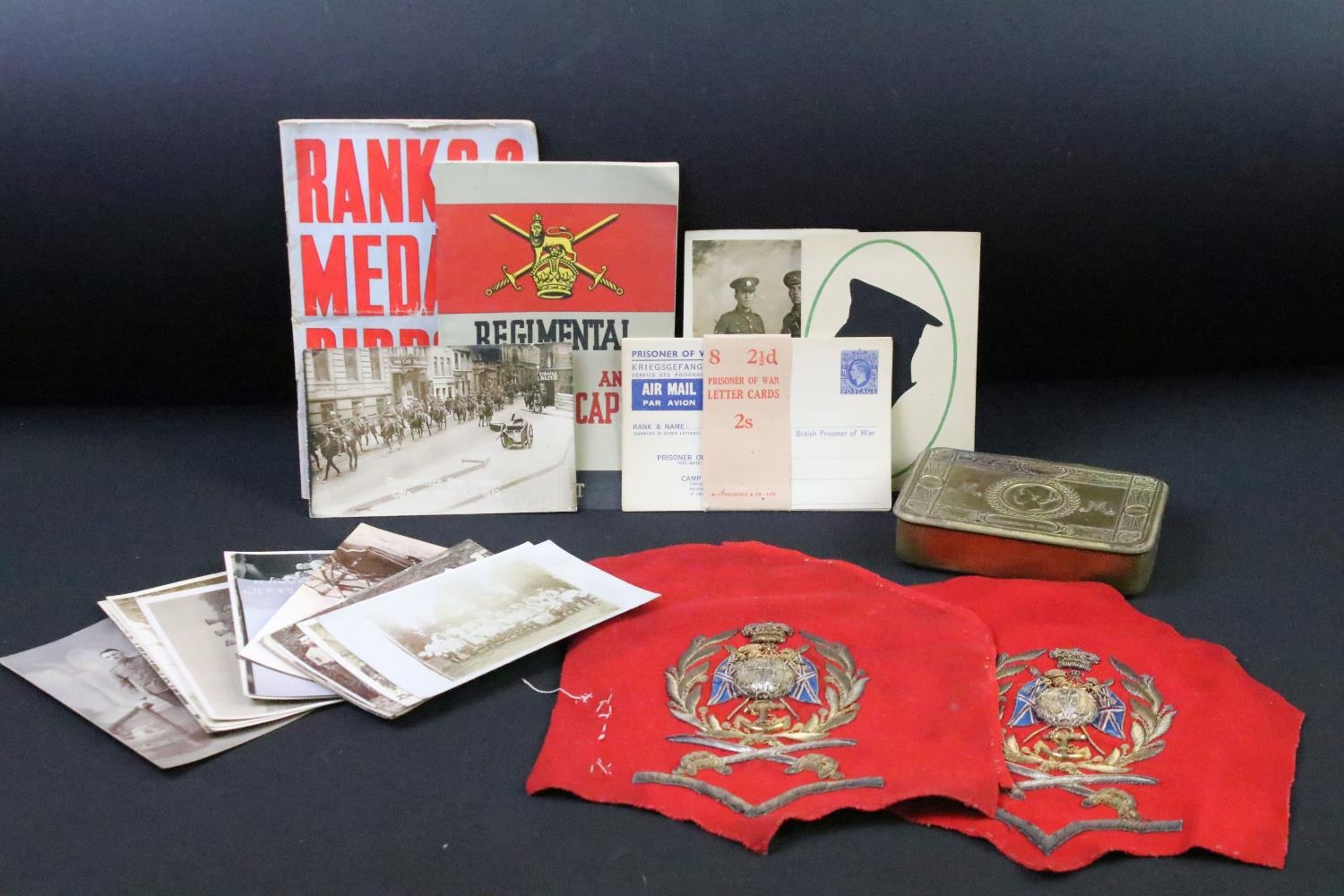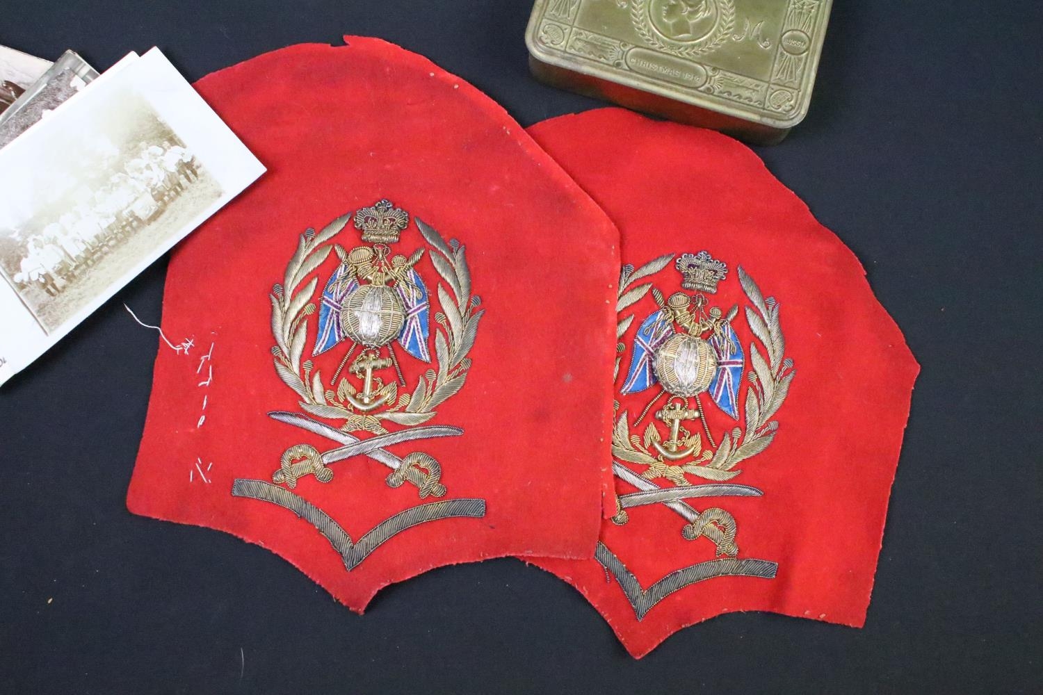 A British World War One Christmas 1914 Princess Mary brass gift tin together with two braided cloth patches and a quantity of period postcards and ephemera.