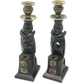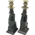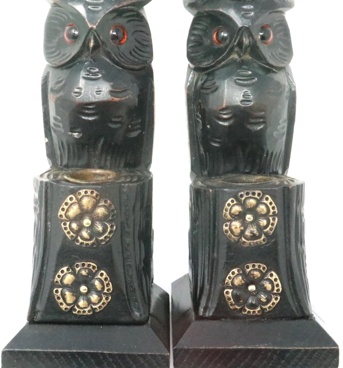 Pair of Black Forest style carved wood candlesticks with brass mounts, each H: 27 cm. P&P Group 1 (£14+VAT for the first lot and £1+VAT for subsequent lots)