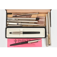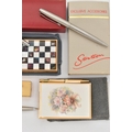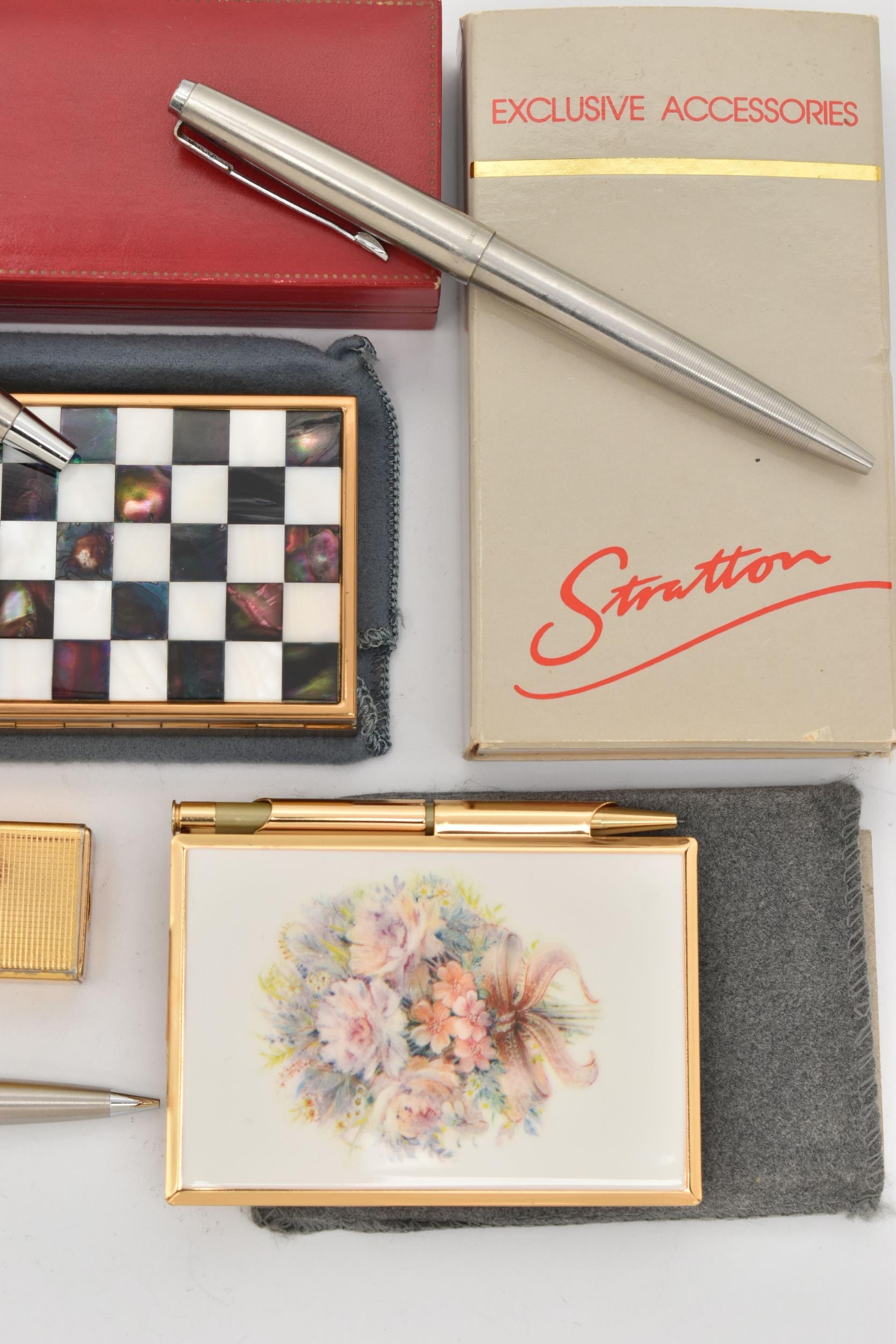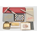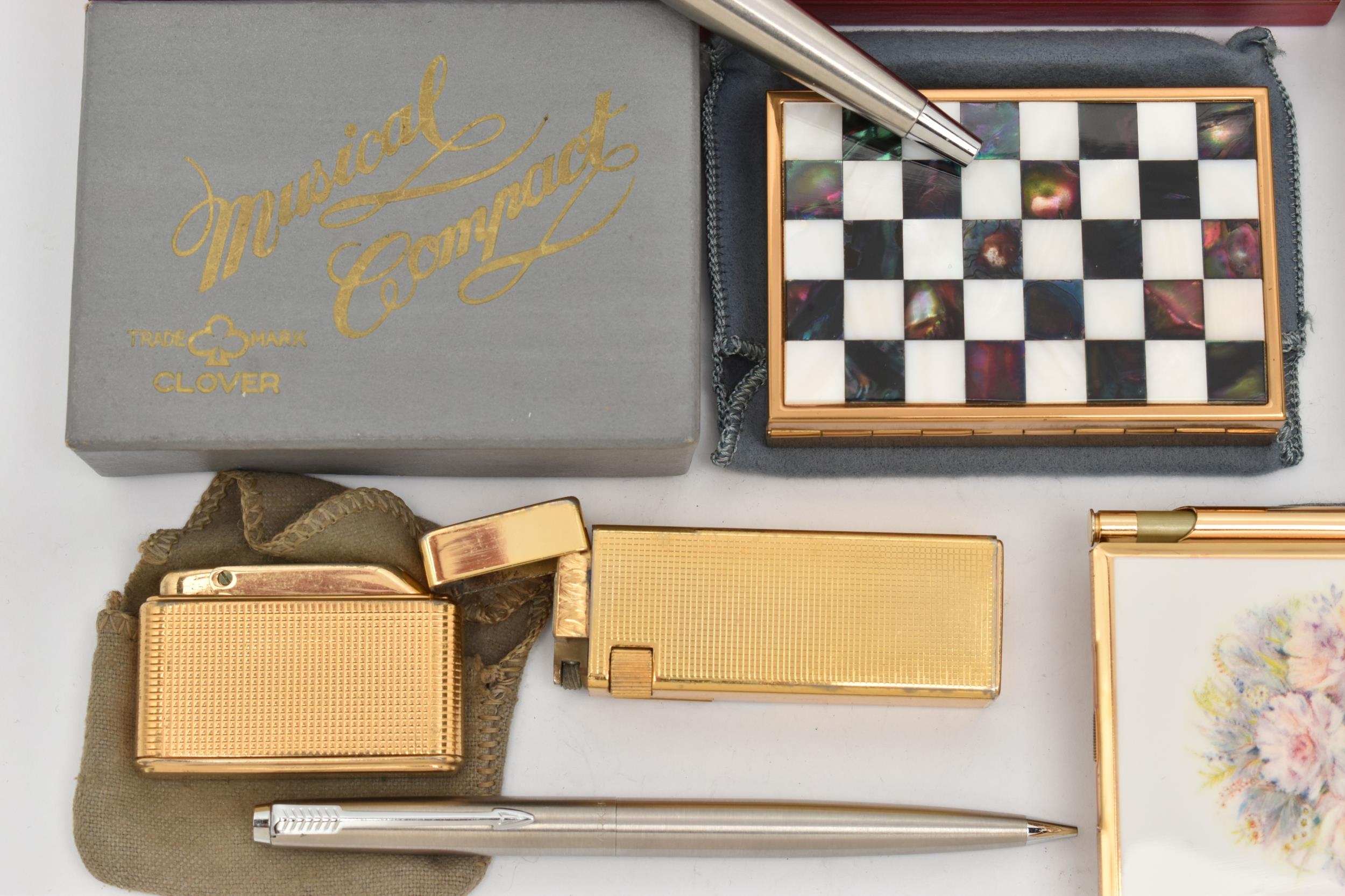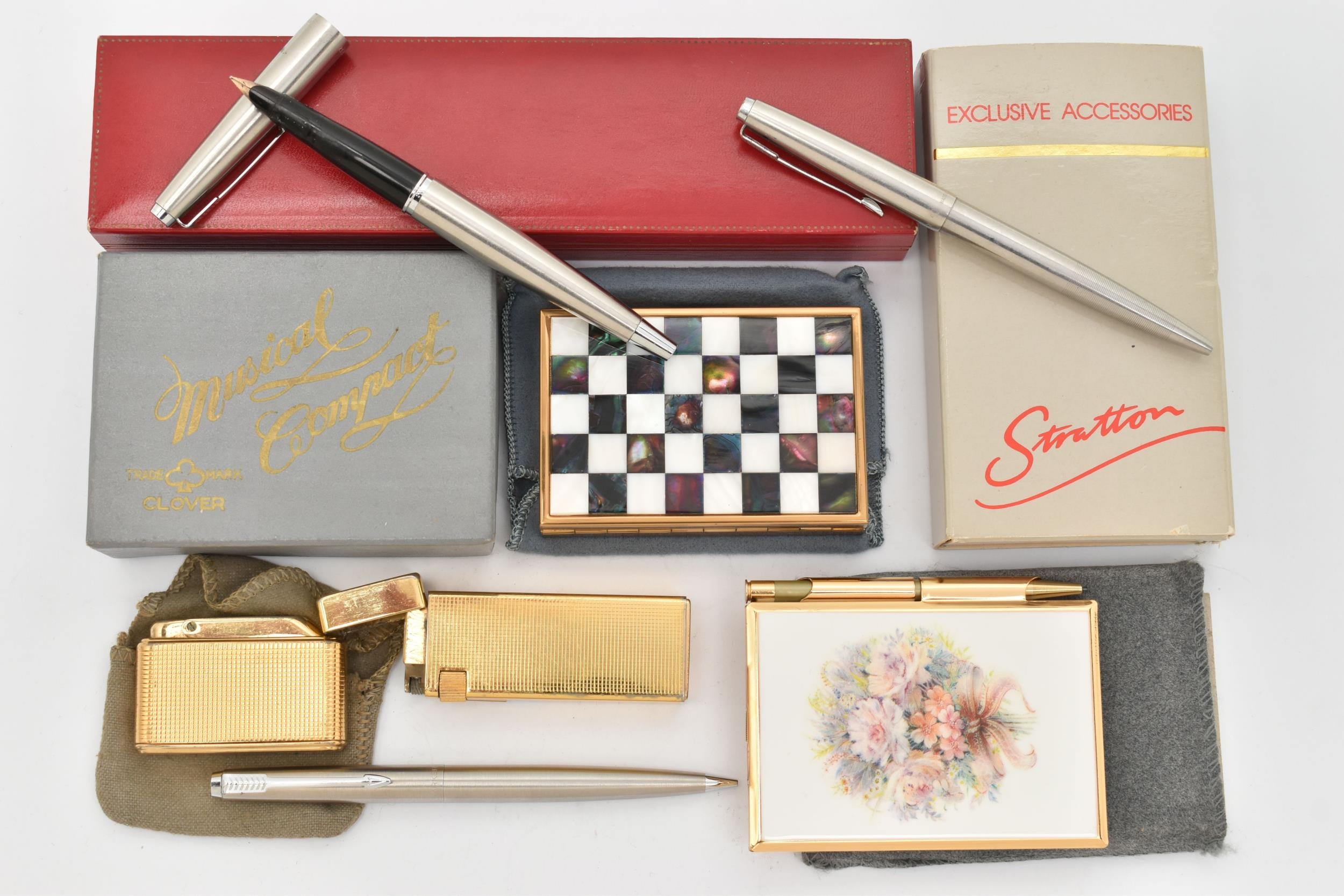 A SELECTION OF PENS, LIGHTERS AND COMPACTS, to include three Parker pens with brushed steel cases, a Colibri mono gas lighter and a further lighter, a Clover musical compact, with inlaid checkerboard pattern mother of pearl lid, with maker's pouch and box, and a Stratton notepad and pen, with spare notepad insert and maker's box